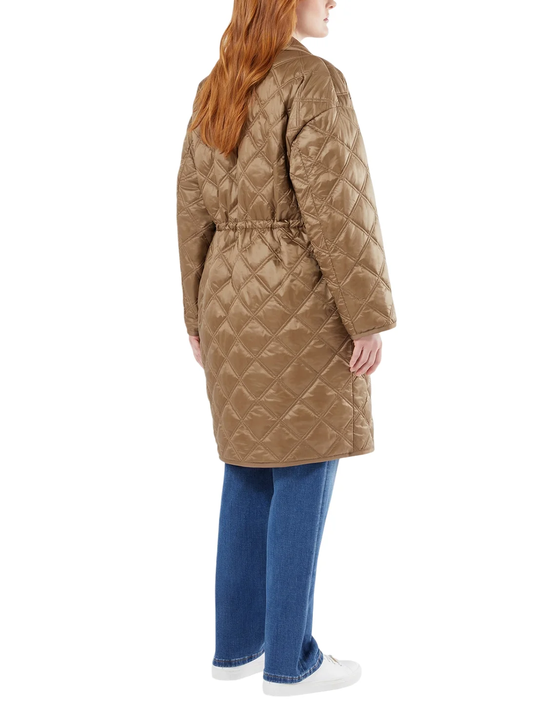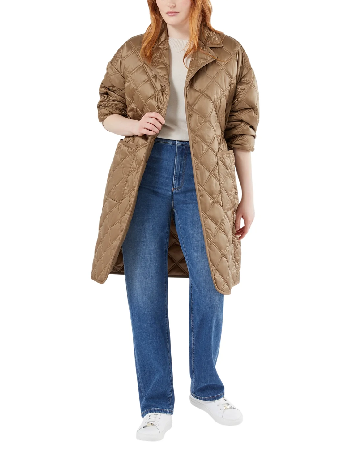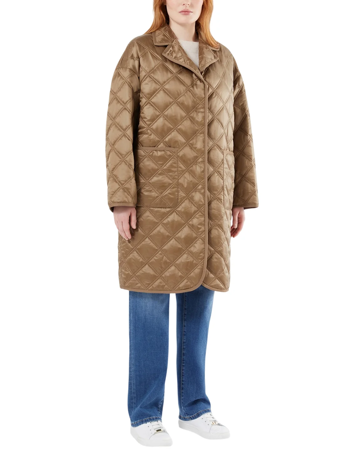 Пальто изготовлено из полиамида, наполнитель из полиэстера. Модель выполнена в прямом крое. Имеет отложной воротник с лацканами, длинные рукава, накладные карманы и скрытую застежку на кнопки.