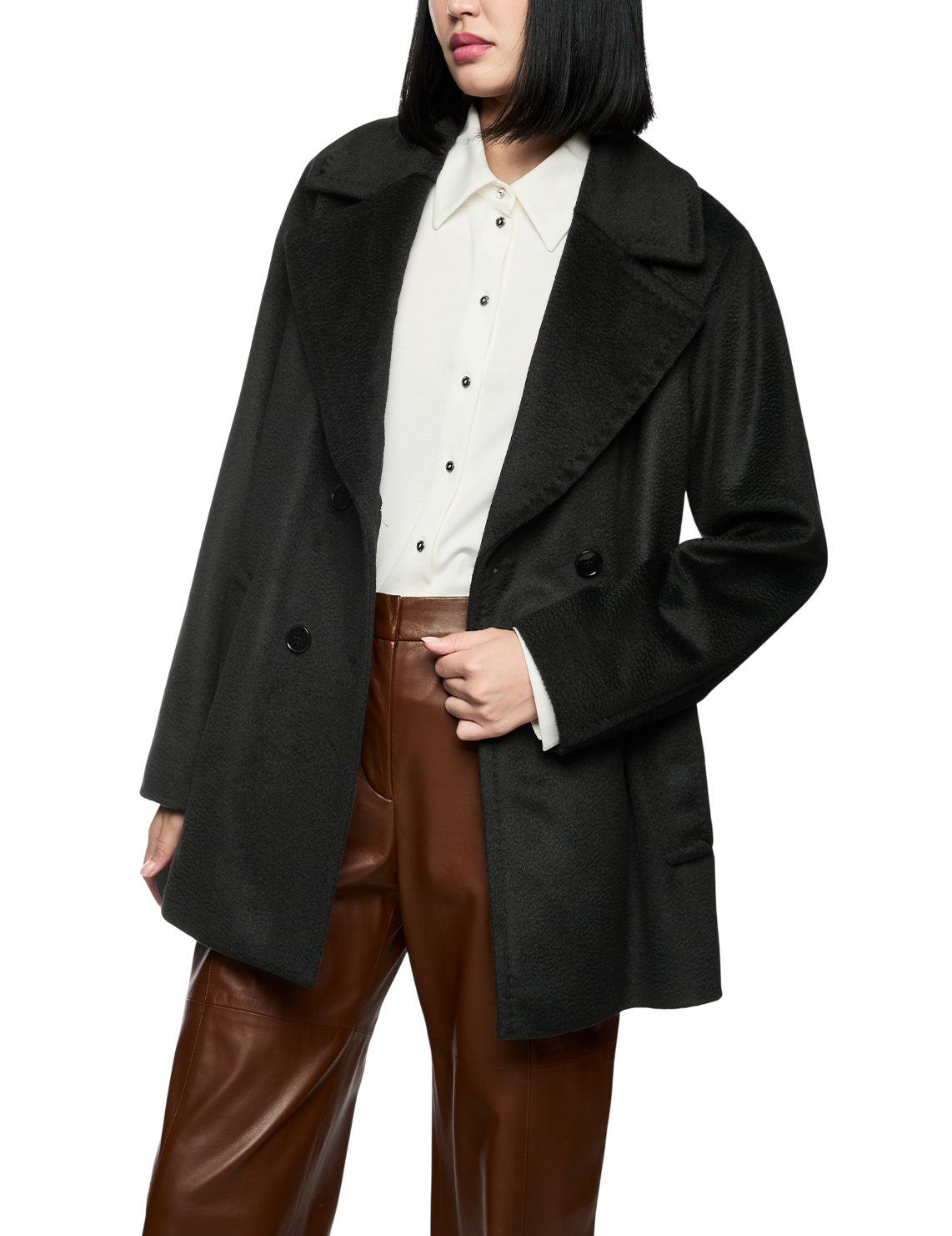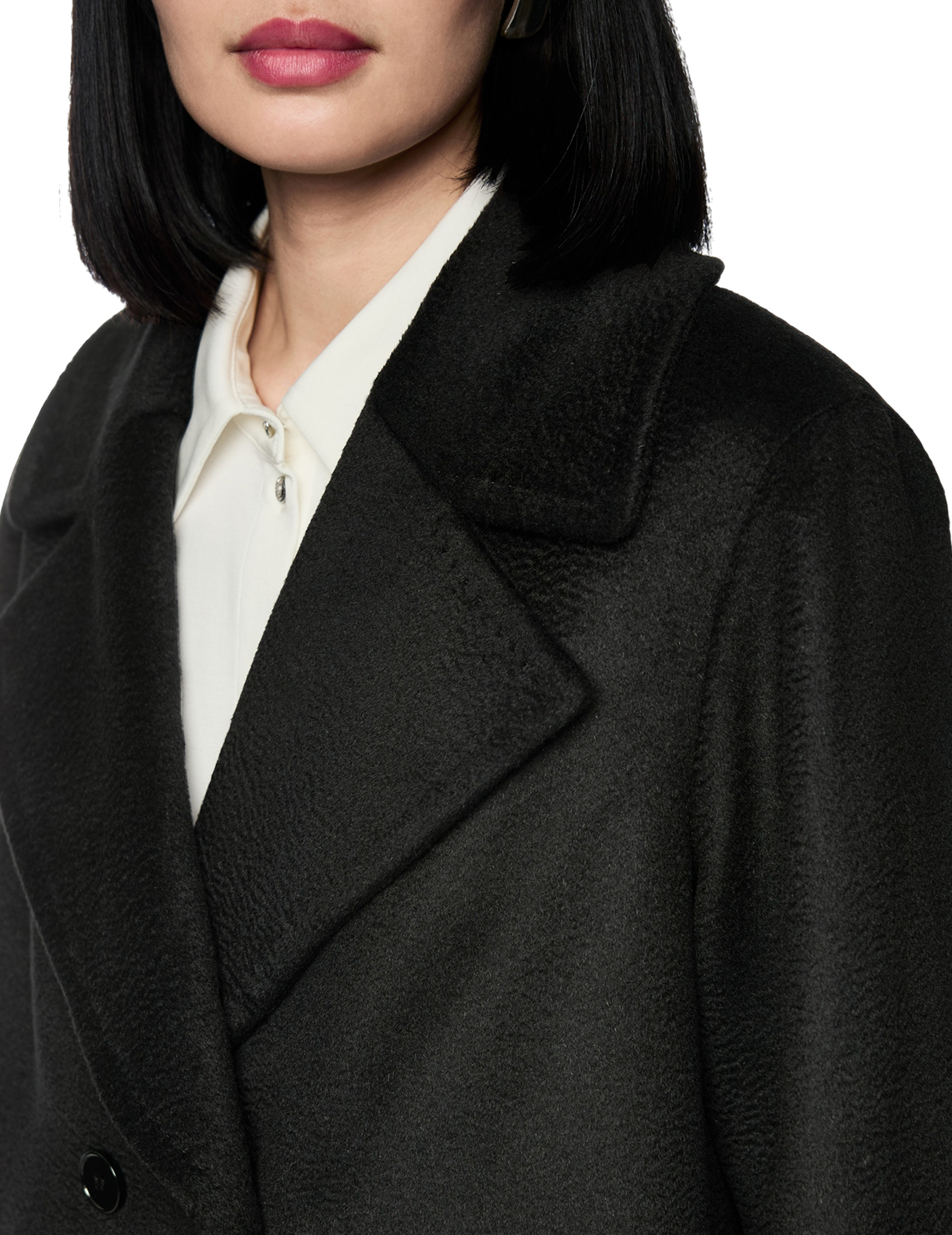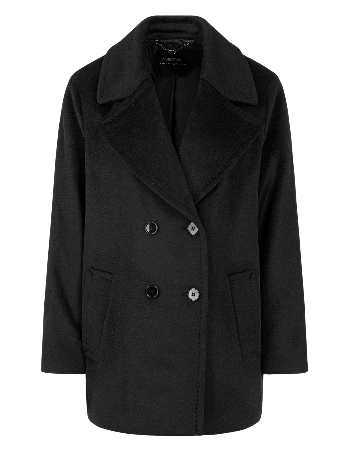 Двубортное пальто изготовлено из шерсти, мохера и полиамида. Модель выполнена в прямом крое. Имеет отложной воротник с лацканами, застежку на пуговицах, длинные рукава и прорезные карманы.