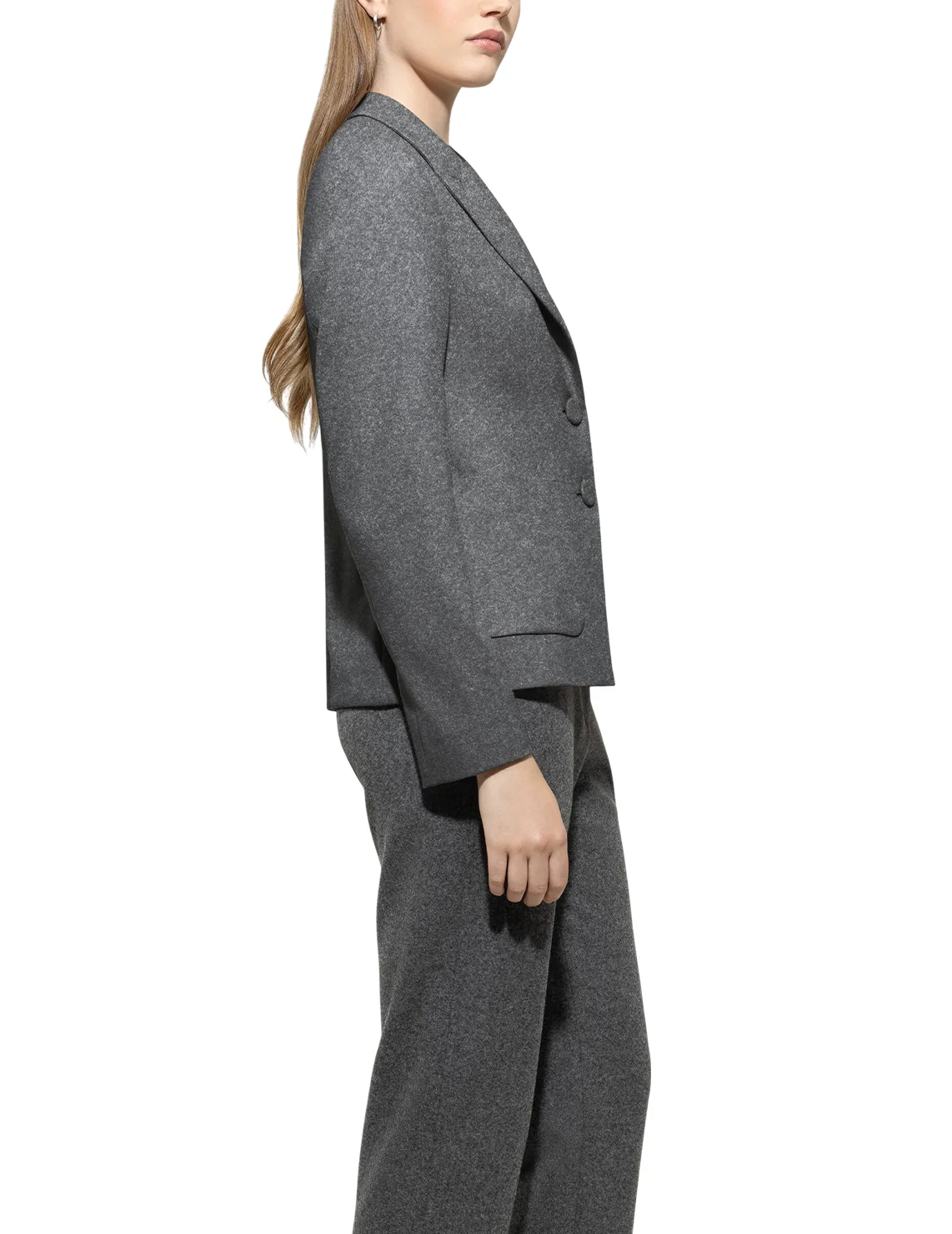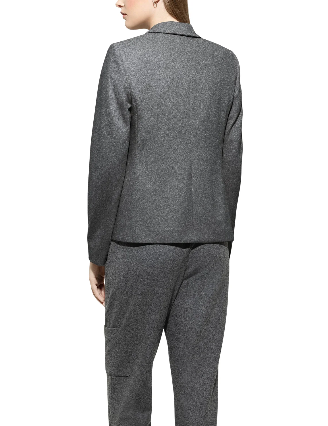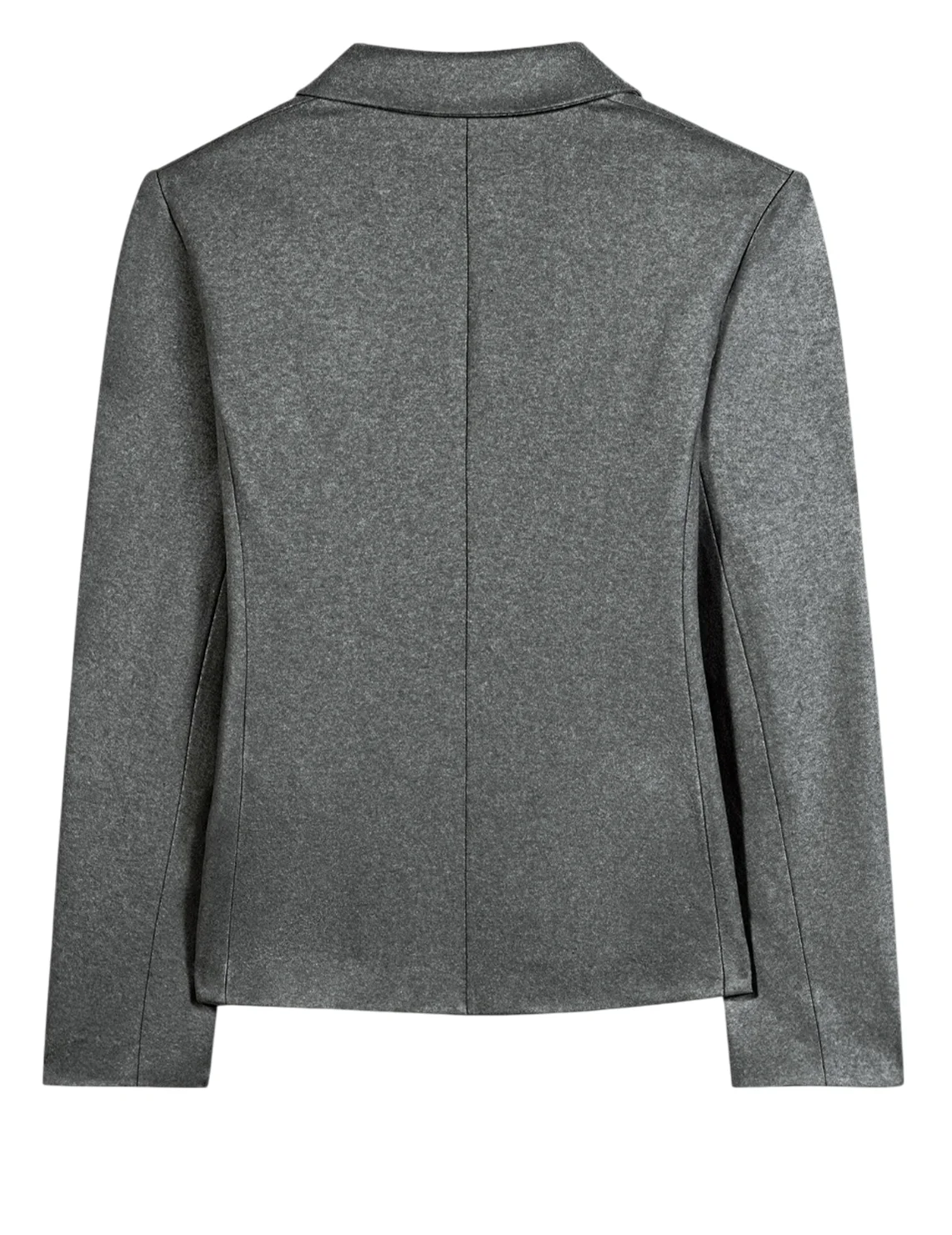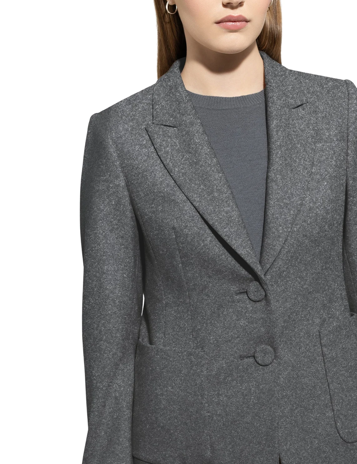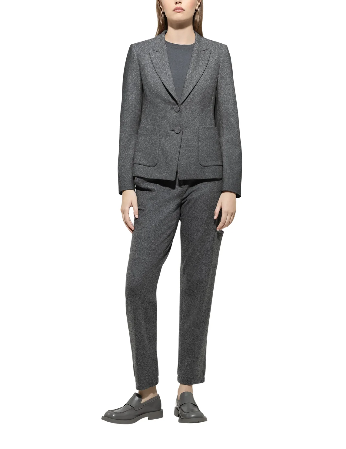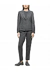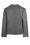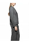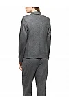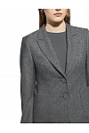 Однобортный пиджак изготовлен из шерсти, полиамида и эластана, подкладка из вискозы и полиэстера. Модель выполнена в прямом крое. Имеет отложной воротник с лацканами, передние накладные карманы, застежку на пуговицах и длинные рукава.