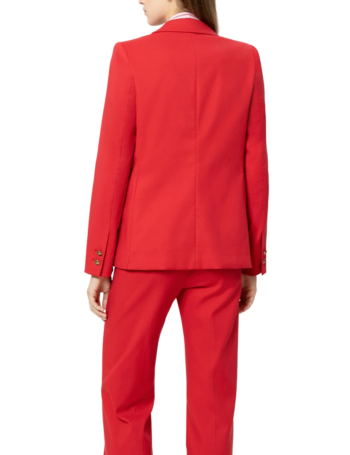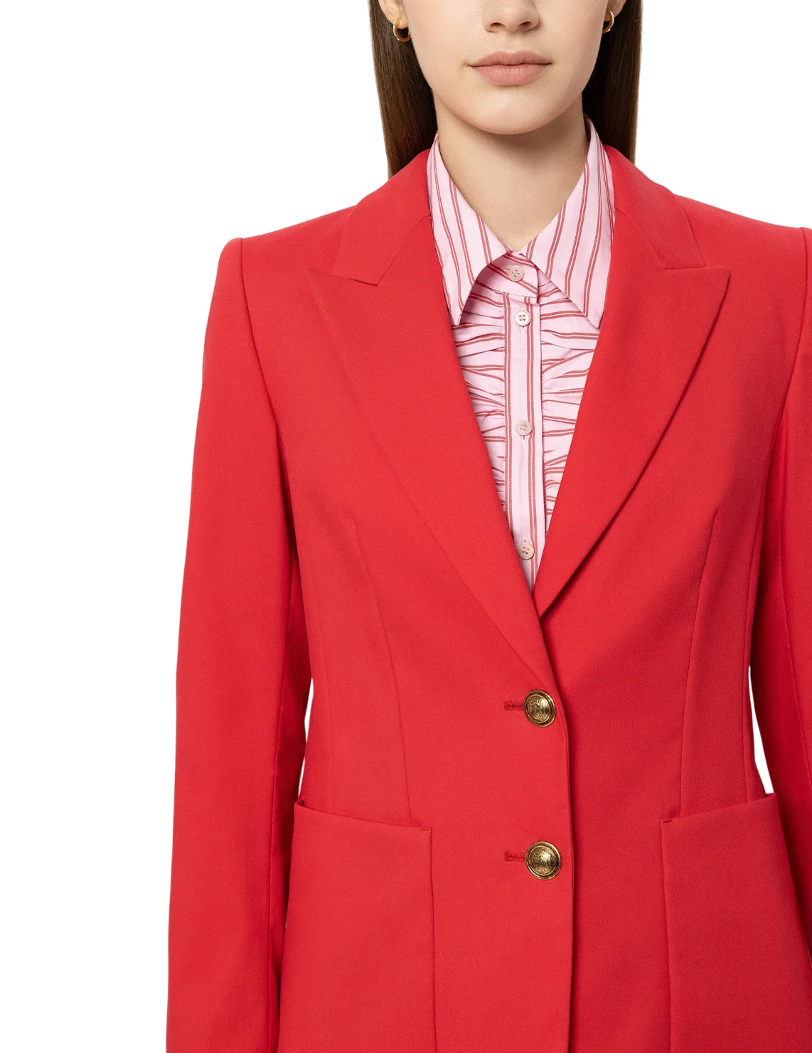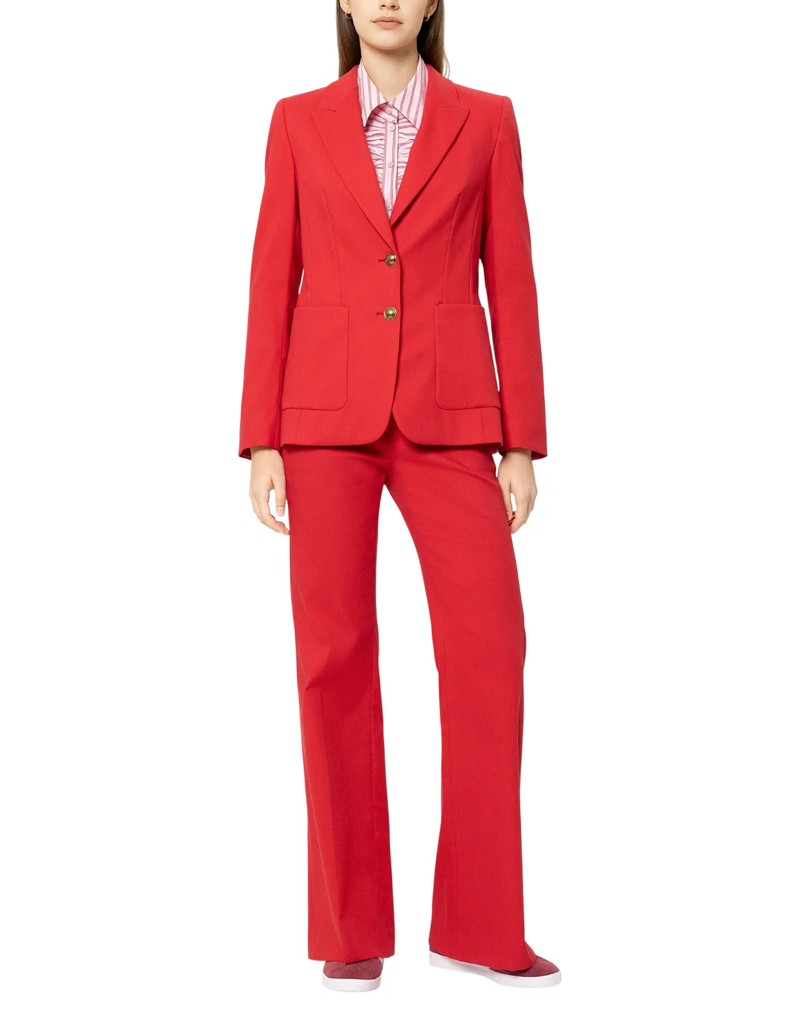 Однобортный пиджак изготовлен из хлопка и эластана, подкладка из вискозы и полиэстера. Модель выполнена в приталенном крое. Имеет отложной воротник с лацканами, застежку на пуговицах, передние накладные карманы и длинные рукава.