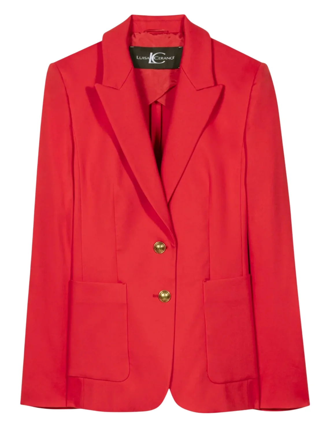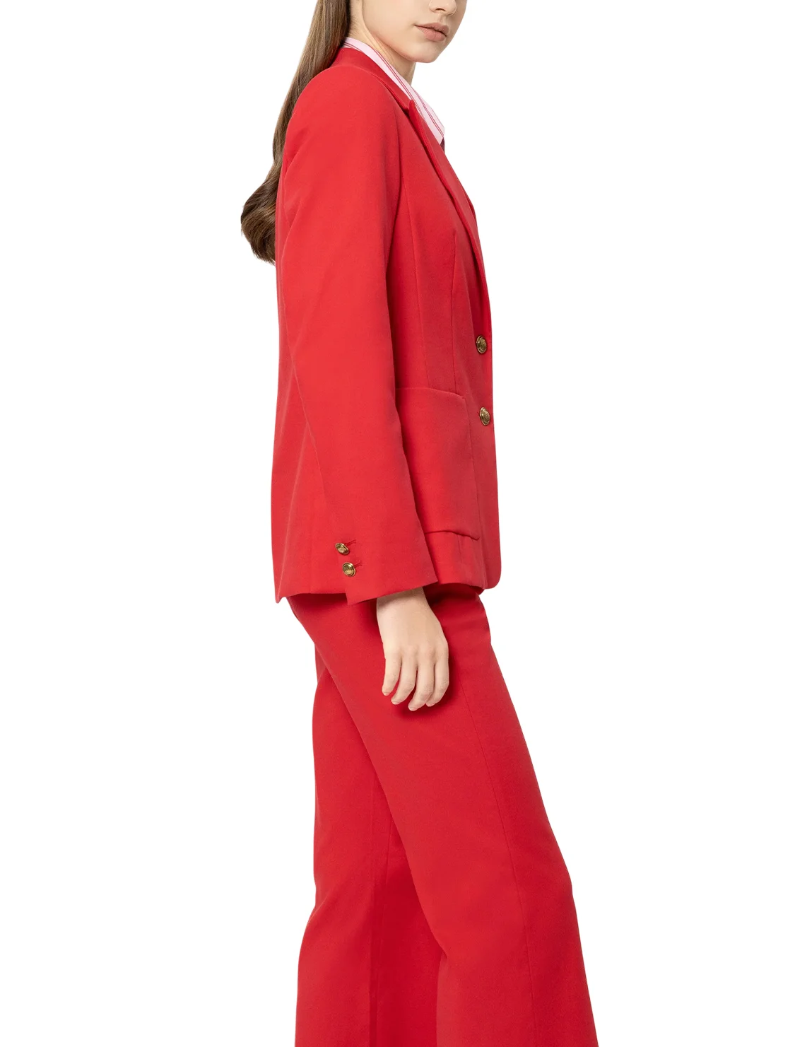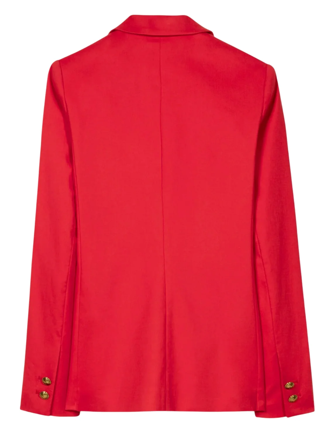 Однобортный пиджак изготовлен из хлопка и эластана, подкладка из вискозы и полиэстера. Модель выполнена в приталенном крое. Имеет отложной воротник с лацканами, застежку на пуговицах, передние накладные карманы и длинные рукава.