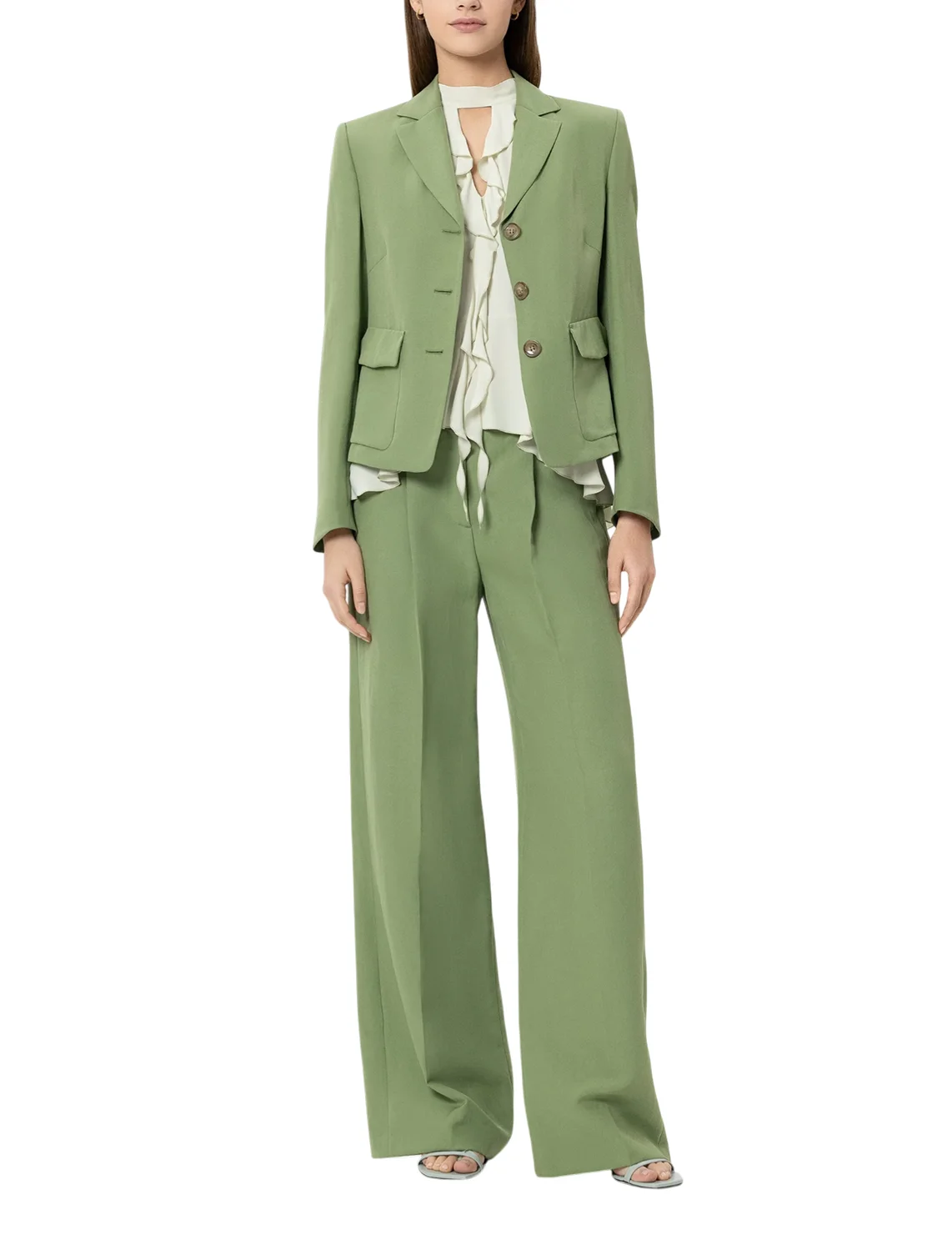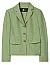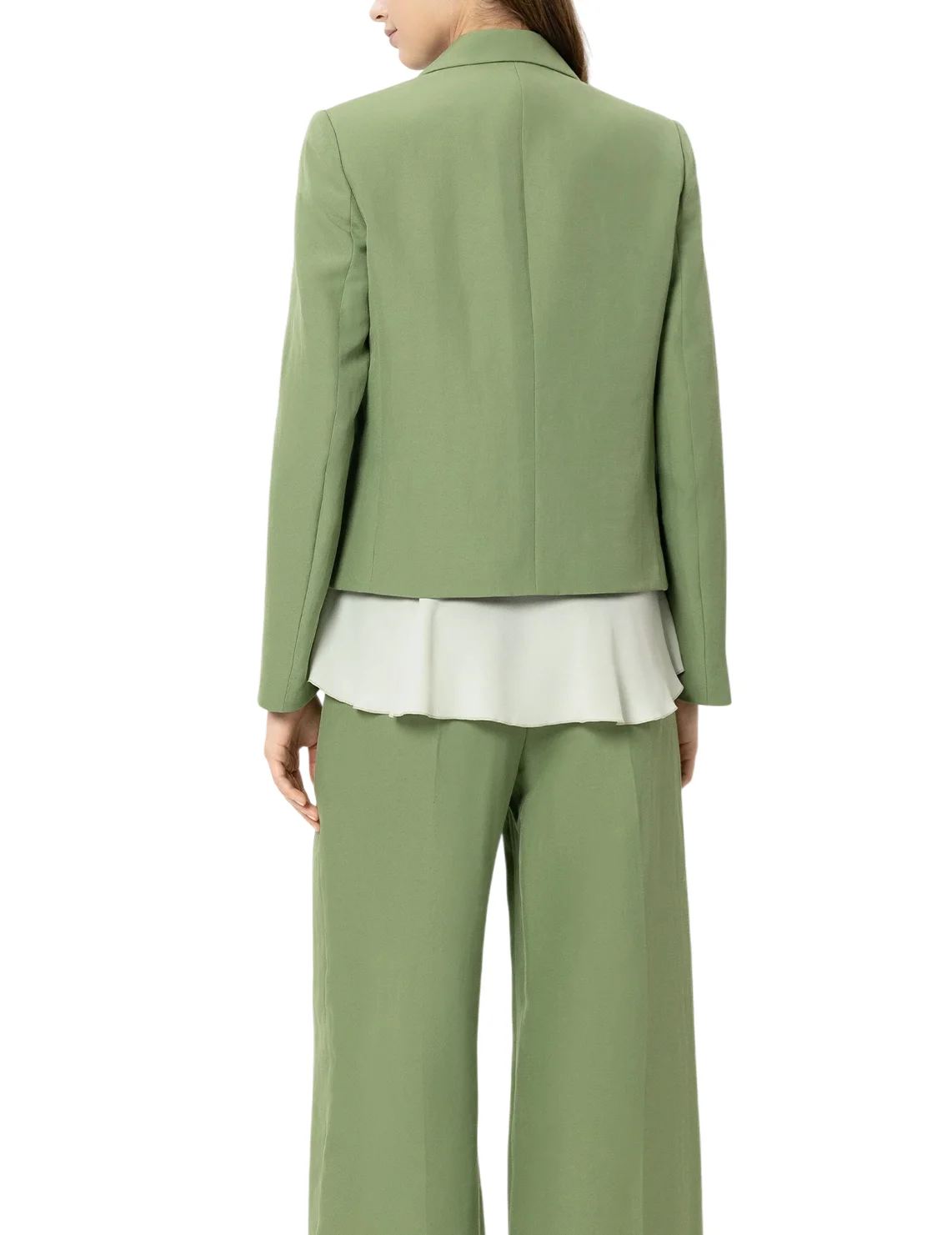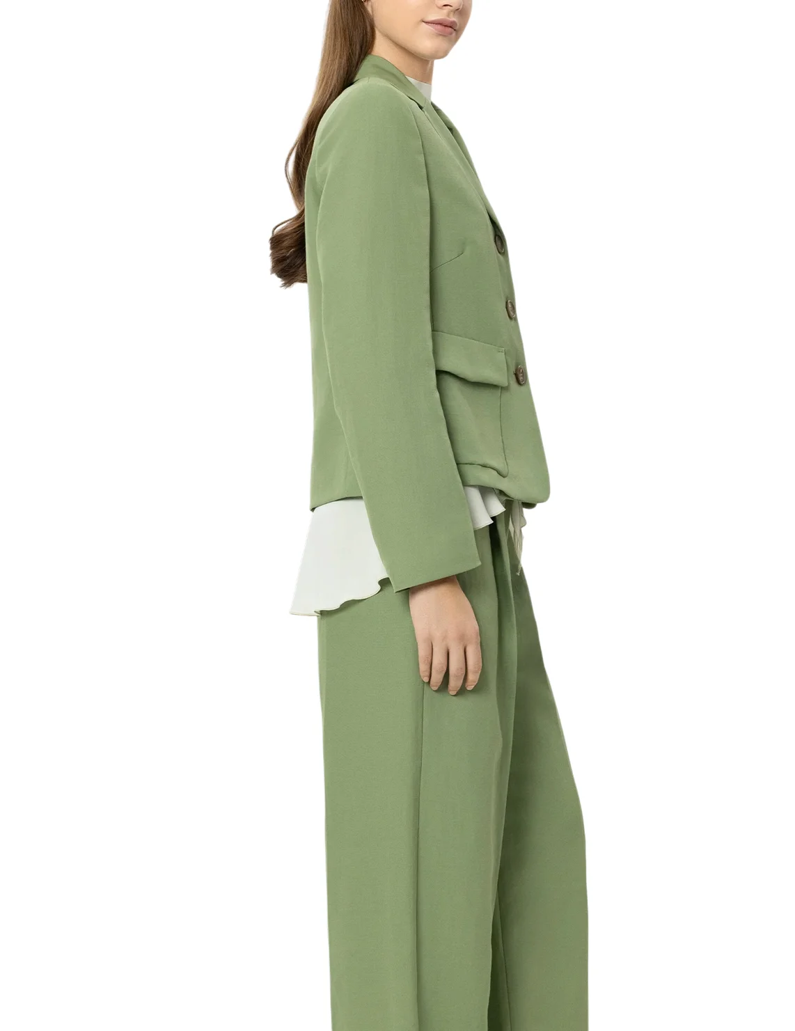 Однобортный пиджак изготовлен из полиэстера и льна, подкладка из вискозы и полиэстера. Модель выполнена в прямом крое. Имеет отложной воротник с лацканами, длинные рукава, застежку на пуговицах и накладные карманы с клапанами.
