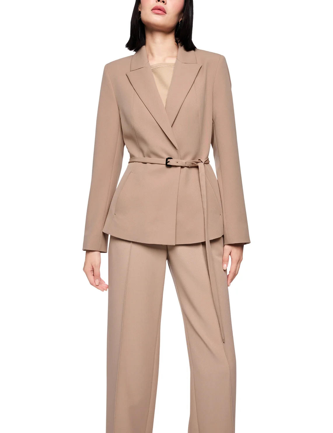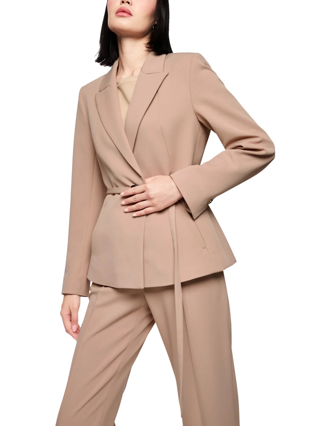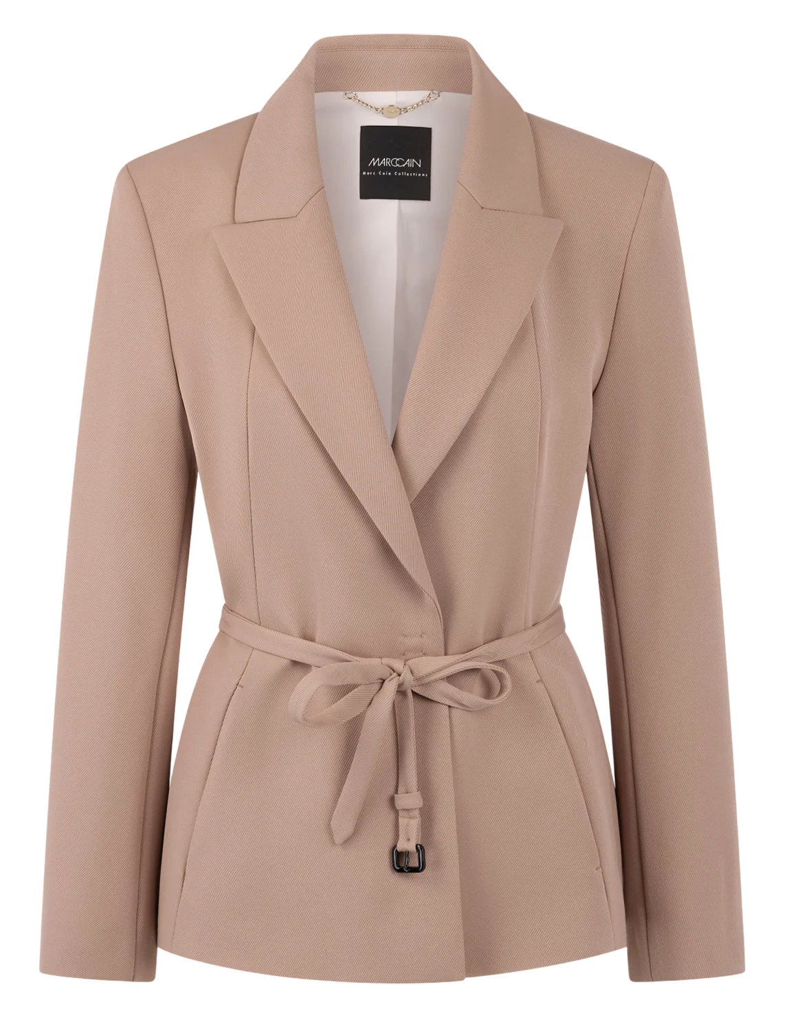 Однобортный пиджак изготовлен из полиэстера и эластана, подкладка из полиэстера. Модель выполнена в приталенном крое. Имеет отложной воротник с лацканами, пояс в тон, застежку на пуговице, прорезные карманы и длинные рукава.