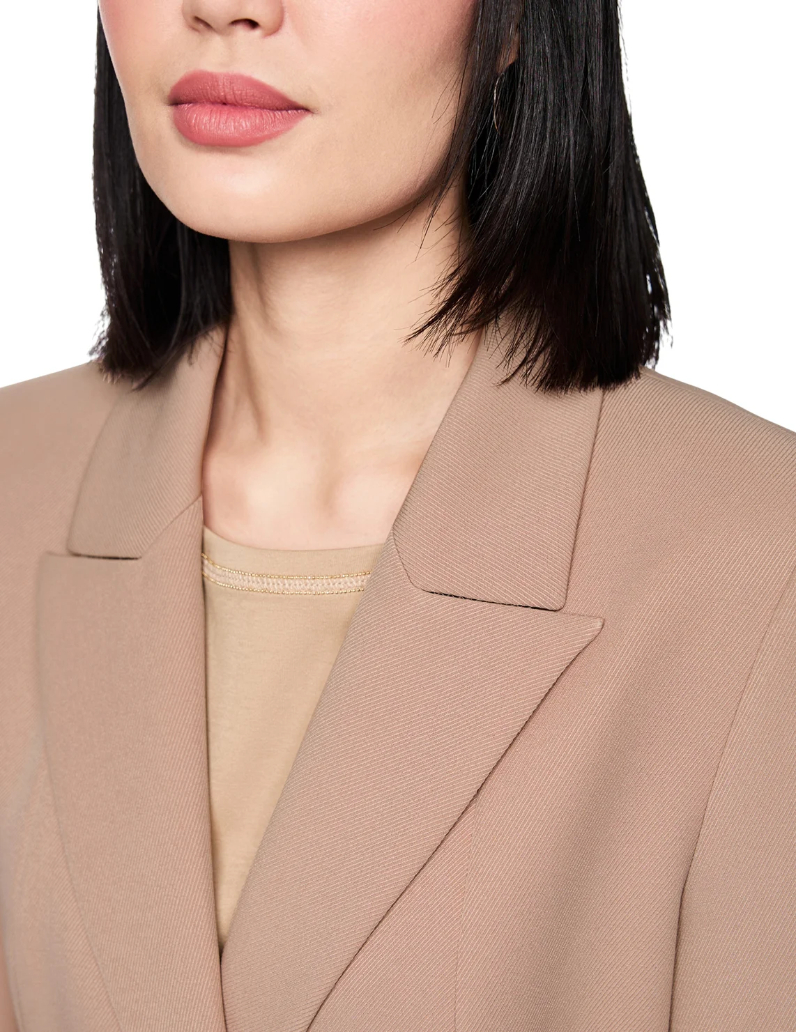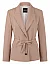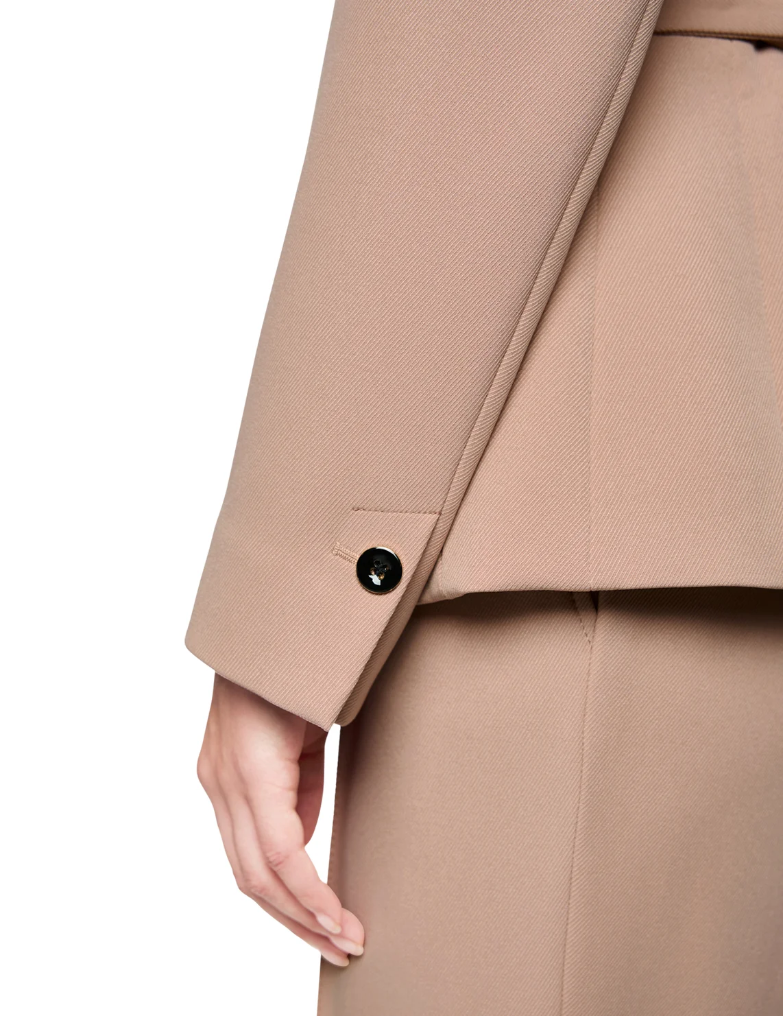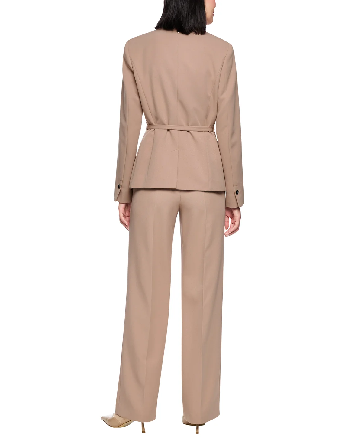 Однобортный пиджак изготовлен из полиэстера и эластана, подкладка из полиэстера. Модель выполнена в приталенном крое. Имеет отложной воротник с лацканами, пояс в тон, застежку на пуговице, прорезные карманы и длинные рукава.