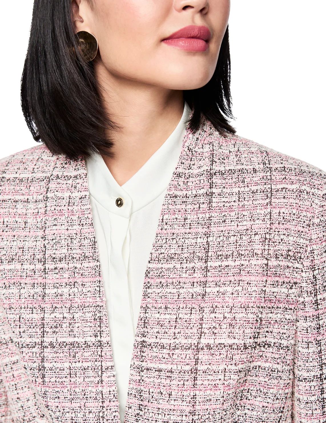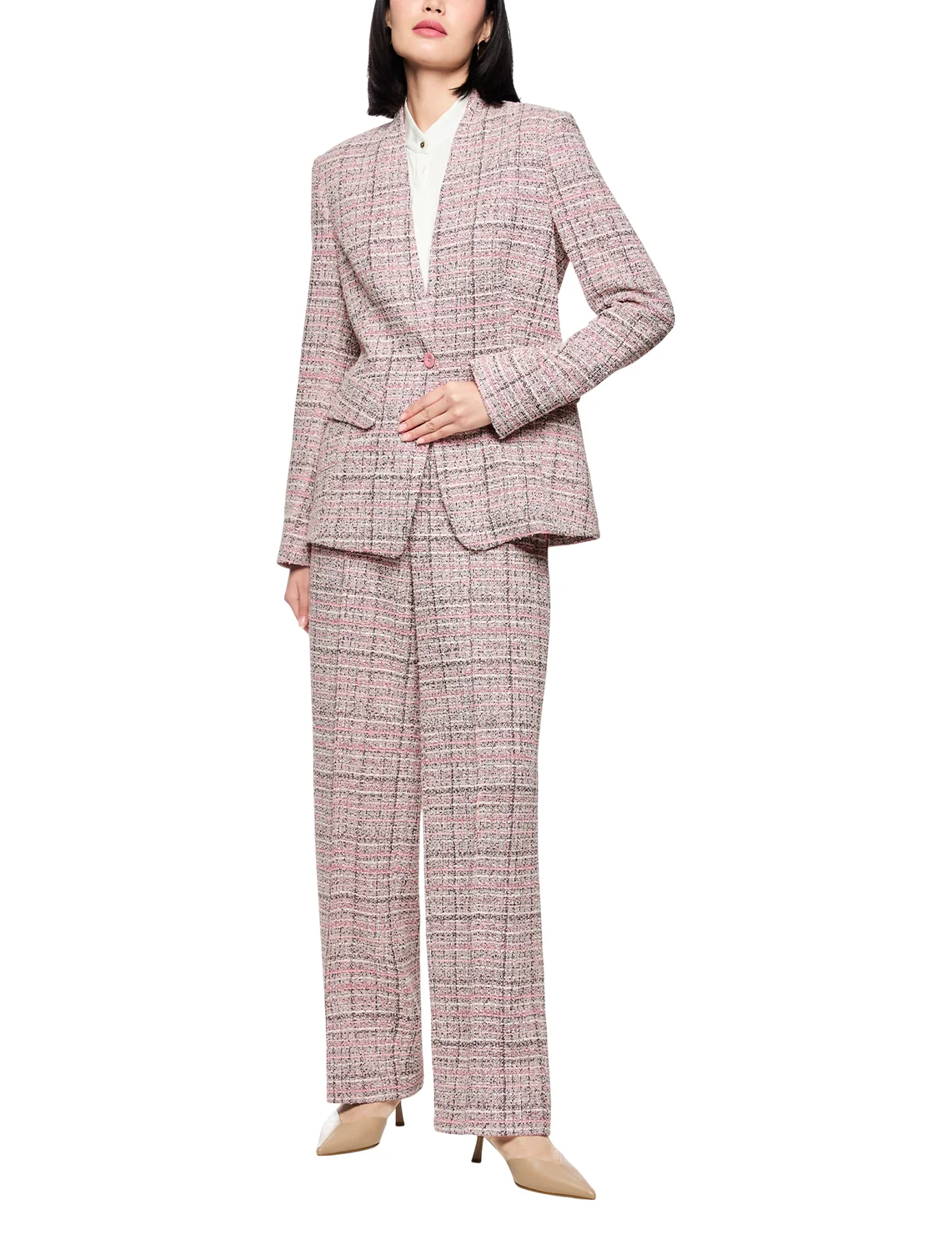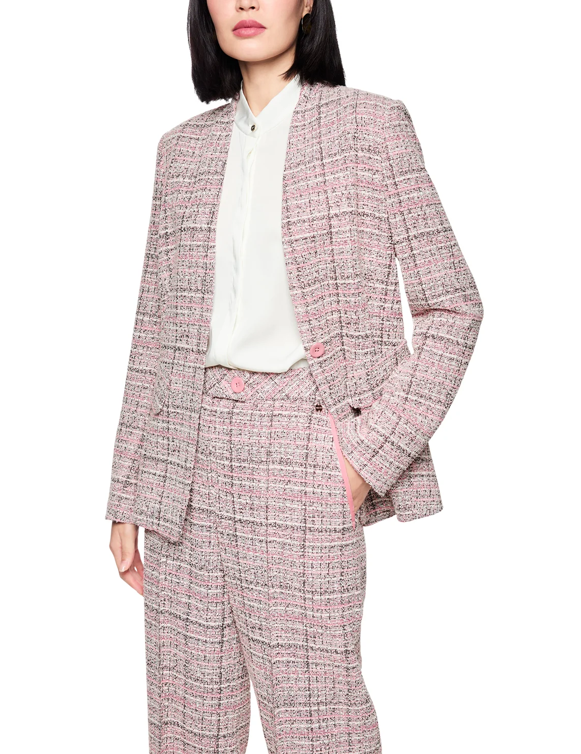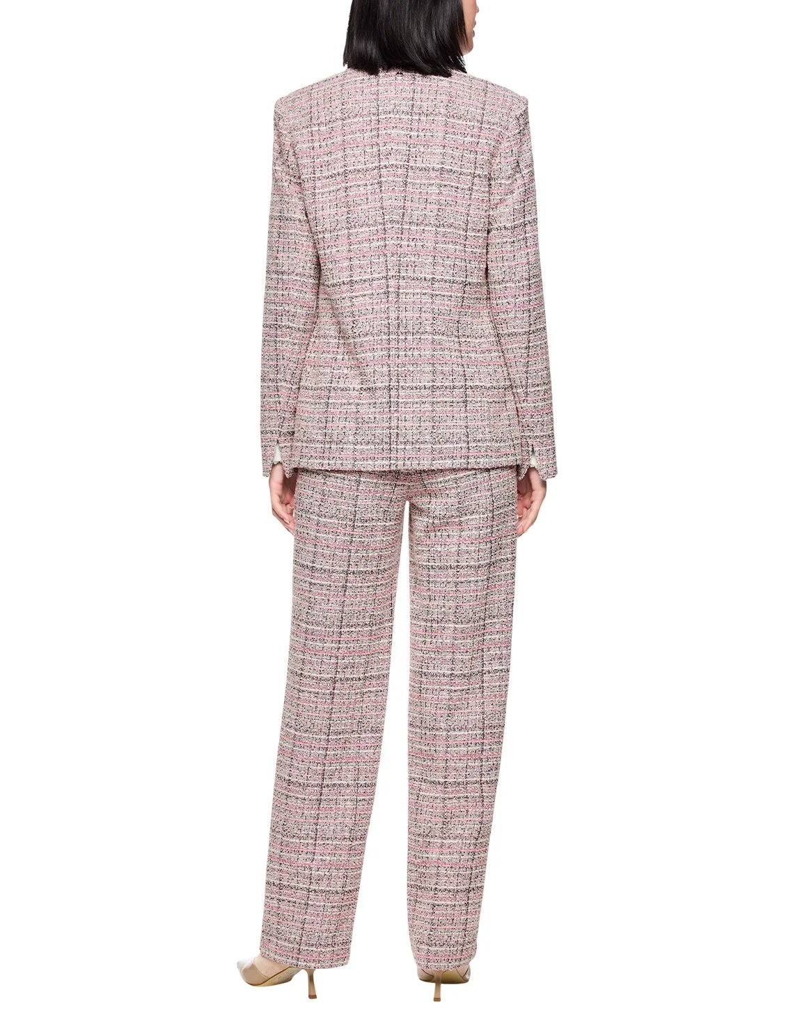 Однобортный пиджак изготовлен из полиэстера, хлопка, шерсти, полиакрила и эластана, подкладка из полиэстера и эластомультиэстера. Модель выполнена в приталенном крое. Имеет V-образный вырез горловины, длинные рукава и декоративные клапаны. Декорирован принтом в клетку.