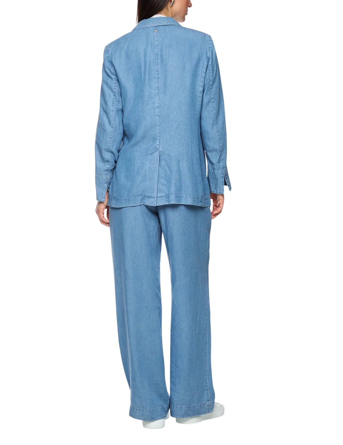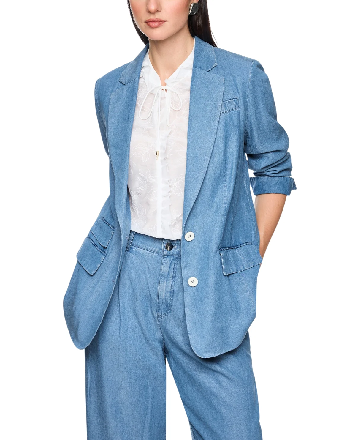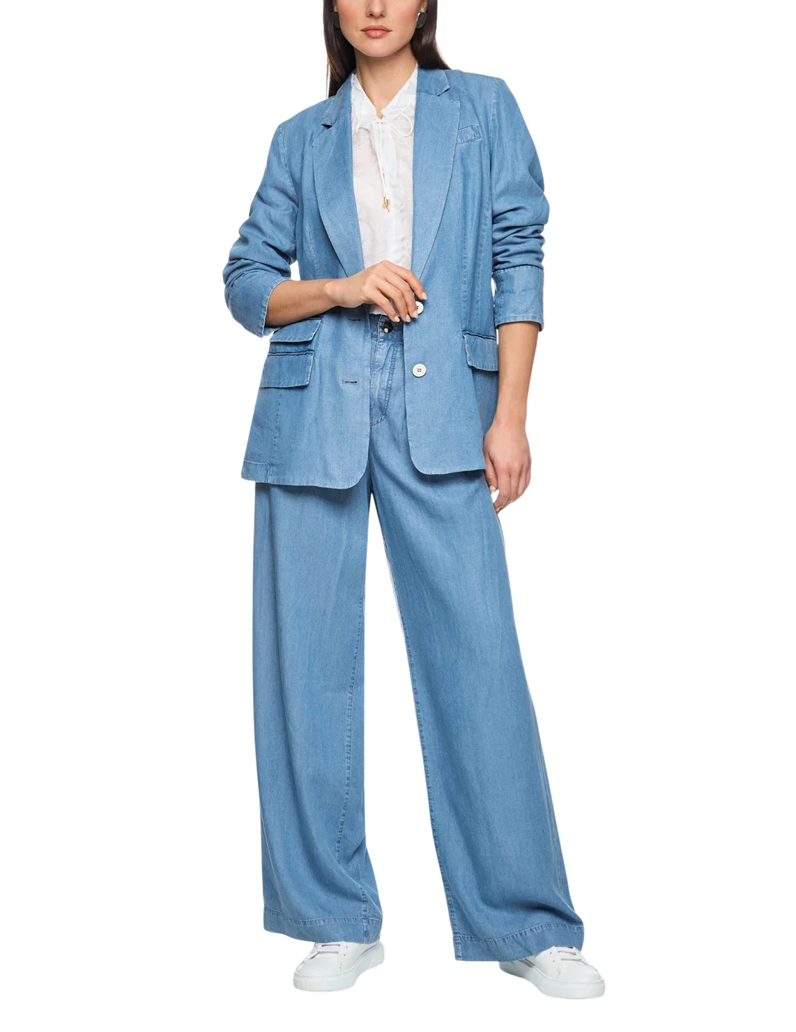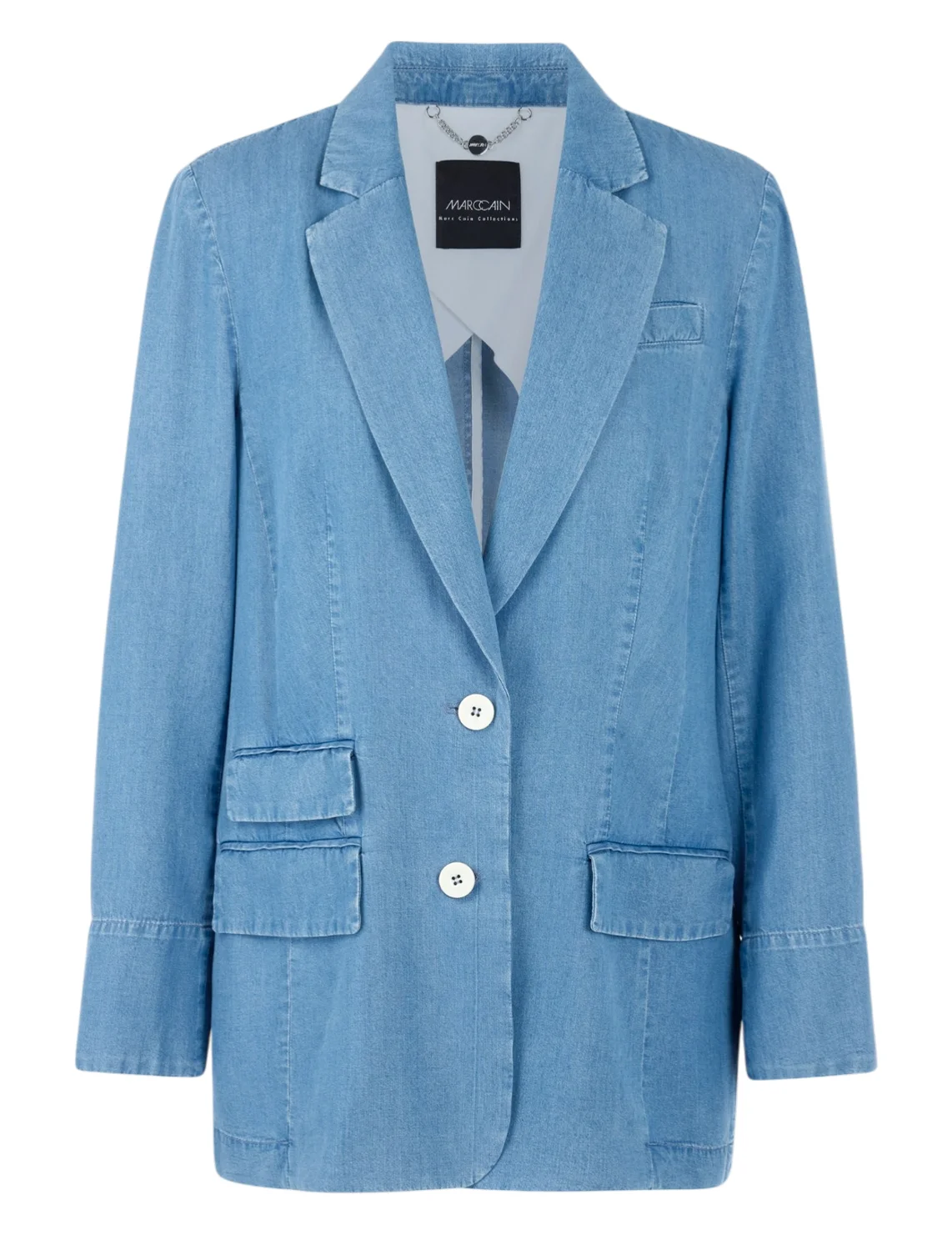 Однобортный джинсовый пиджак изготовлен из лиоцелла высокого качества, подкладка из хлопка. Модель выполнена в прямом крое. Имеет отложной воротник с лацканами, разрез сзади, декоративные клапаны и длинные рукава с манжетами.