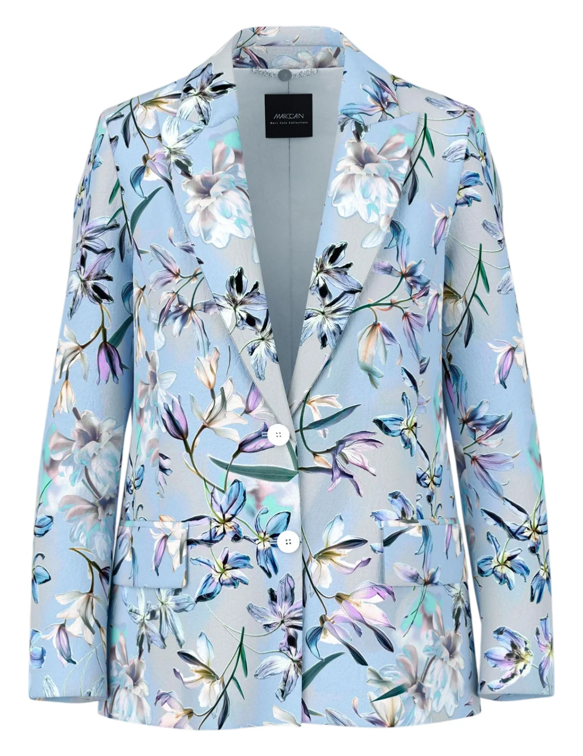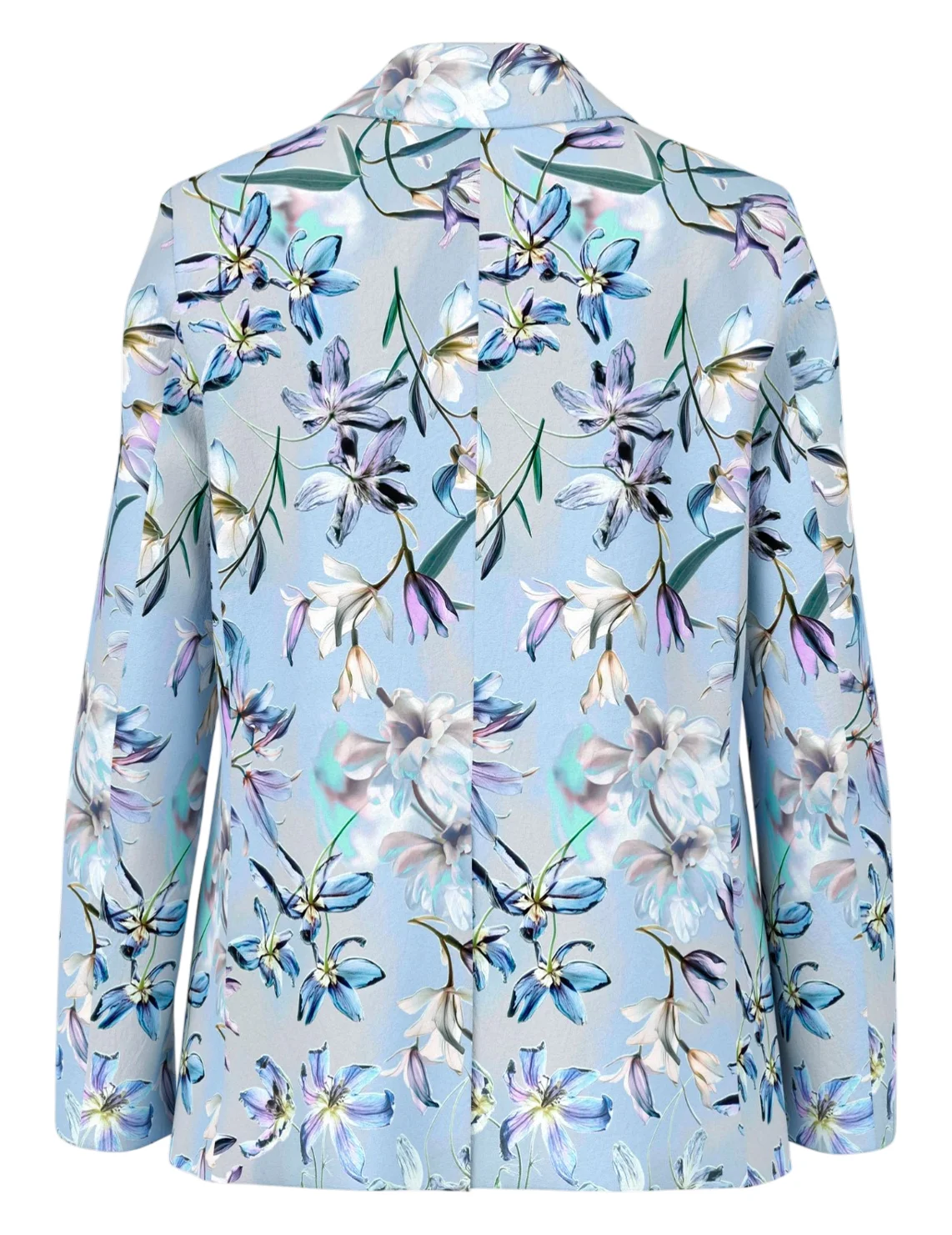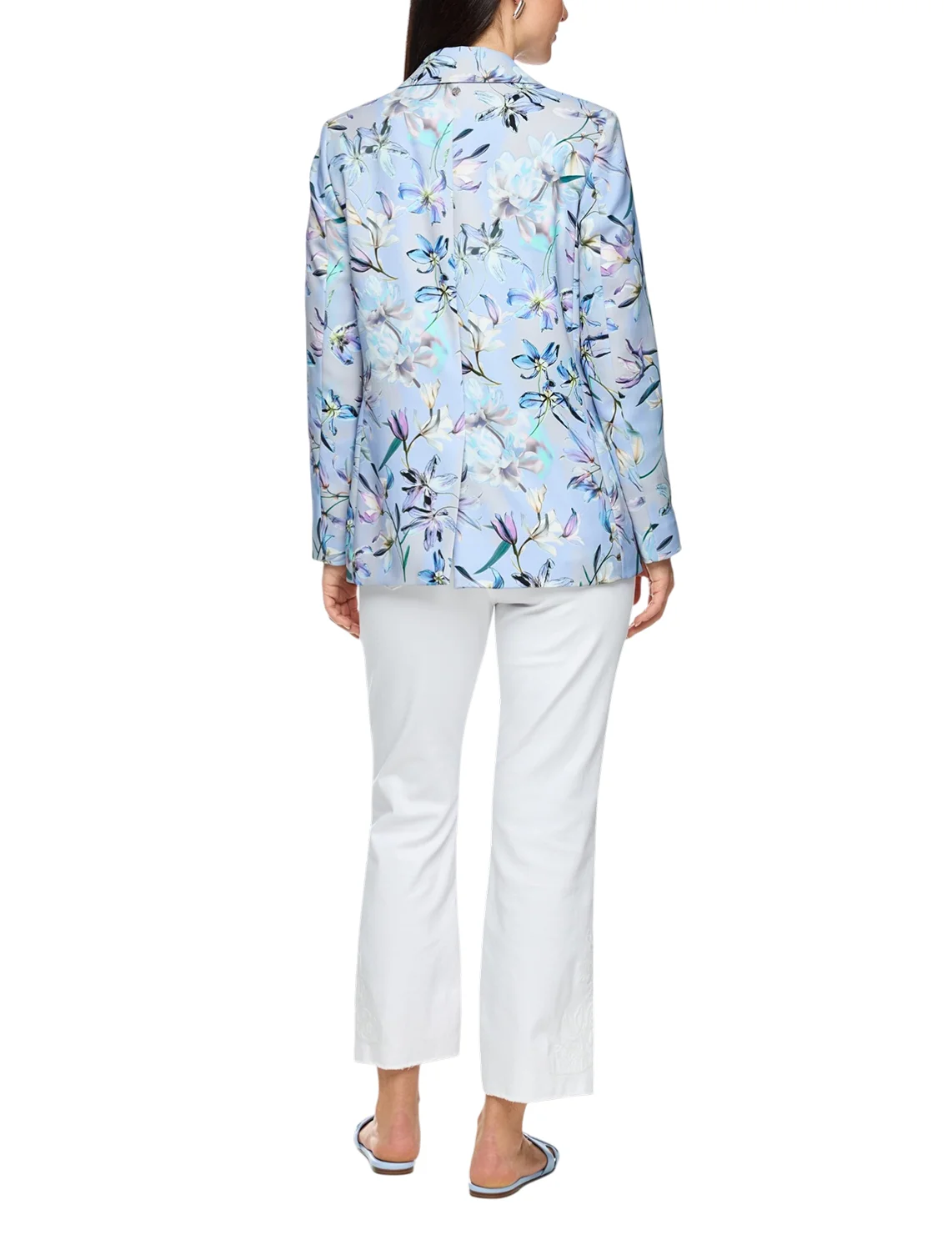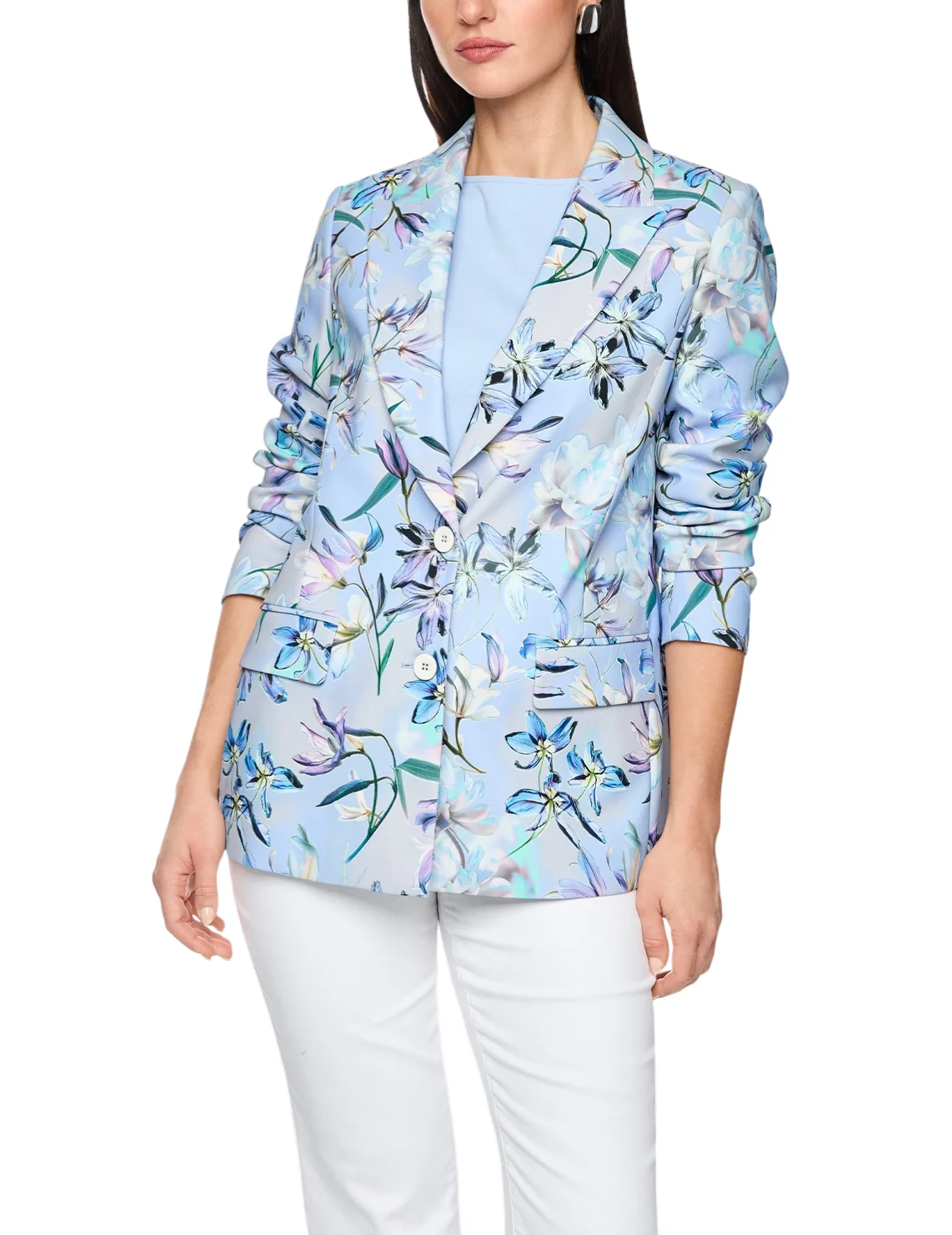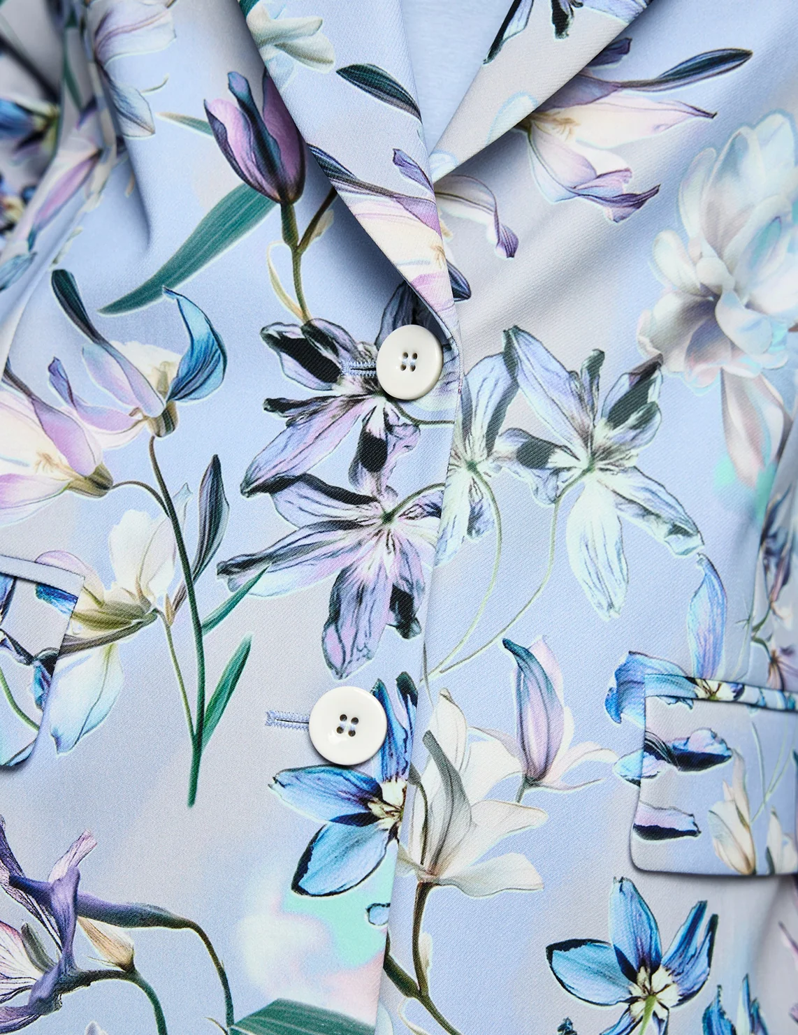 Однобортный пиджак изготовлен из 100% полиэстера, подкладка из полиэстера и эластомультиэстера. Модель выполнена в прямом крое. Имеет отложной воротник с лацканами, разрез сзади, передние карманы с клапанами и длинные рукава. Декорирован цветочным принтом.