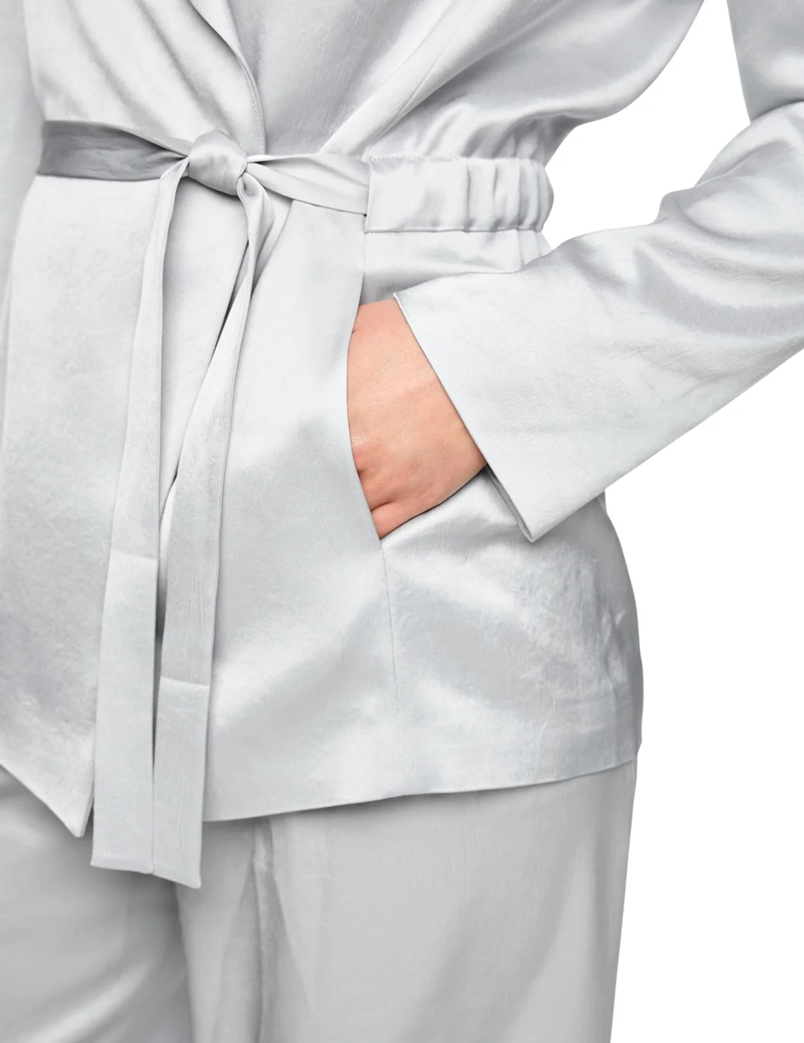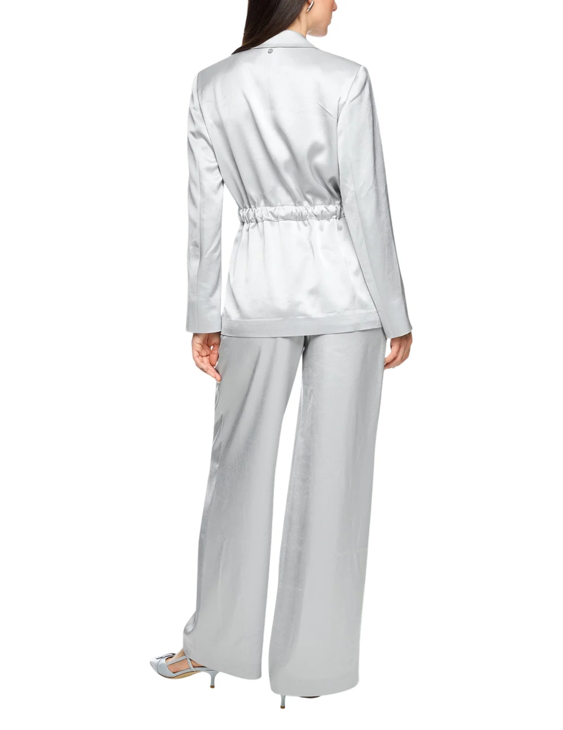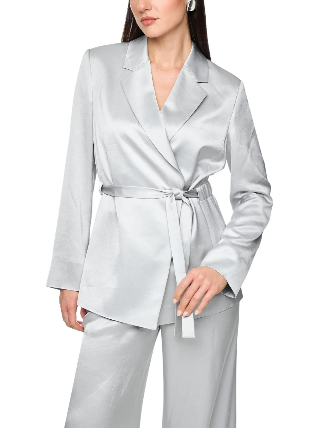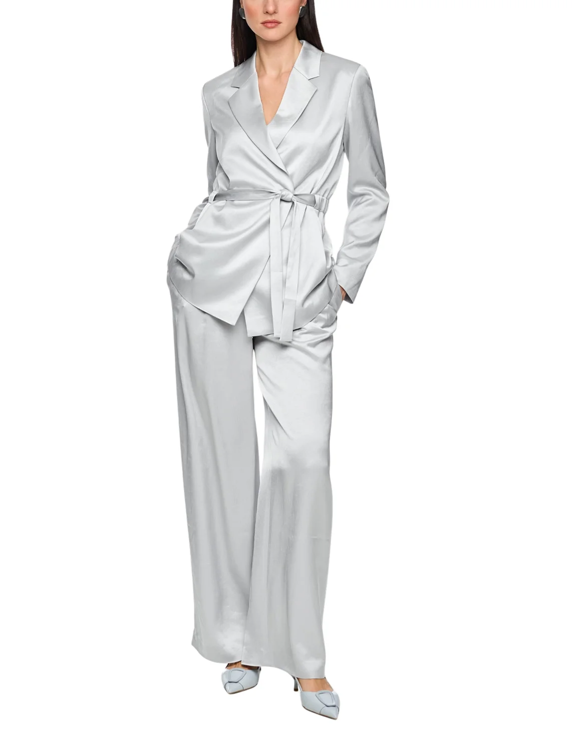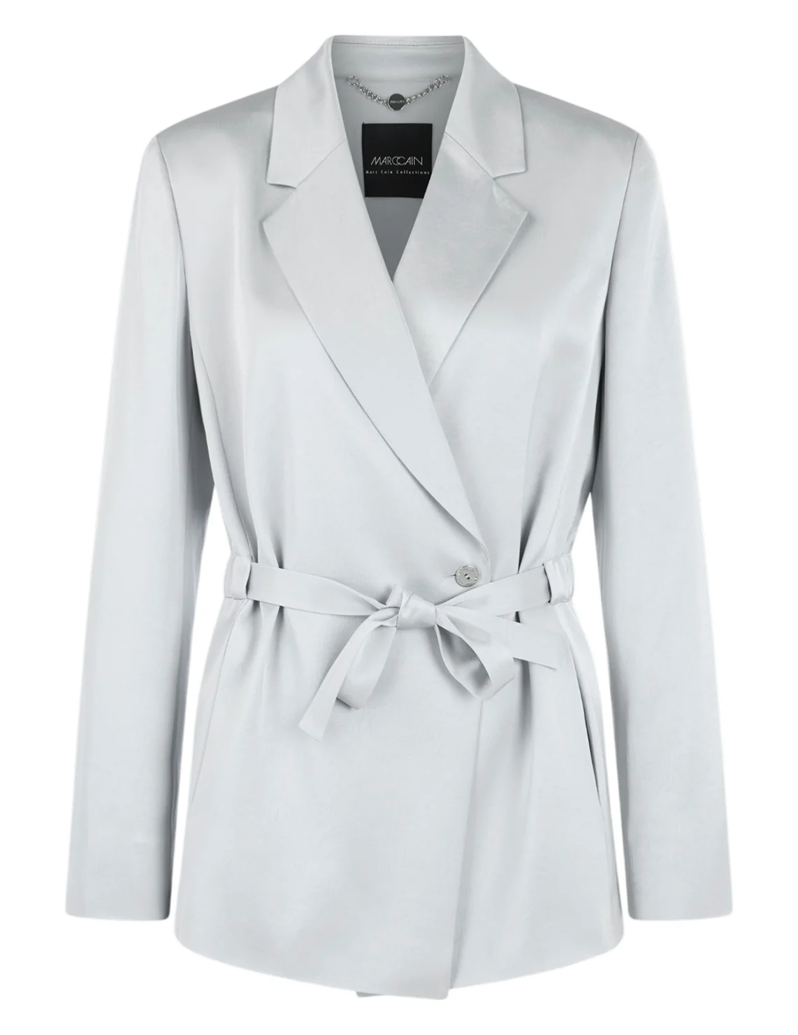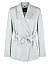 Однобортный пиджак изготовлен из ацетата и полиэстера, подкладка из полиэстера. Модель выполнена в приталенном крое. Имеет отложной воротник с лацканами, пояс в тон, боковые прорезные карманы и длинные рукава.