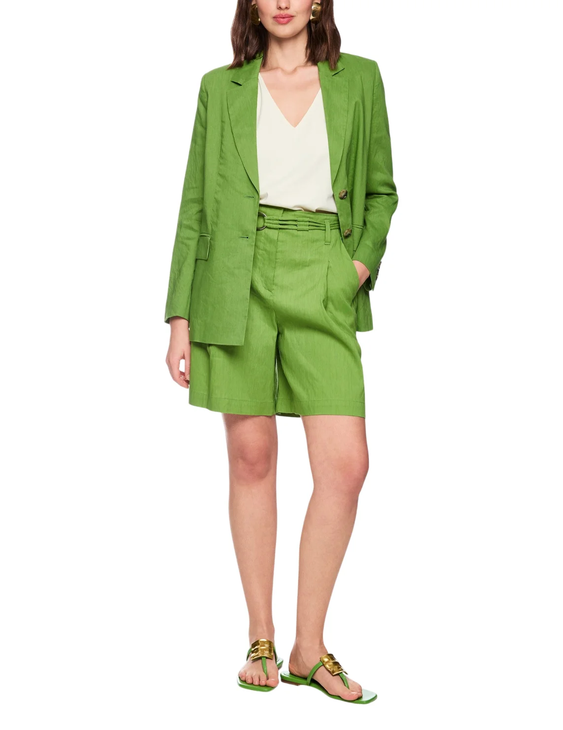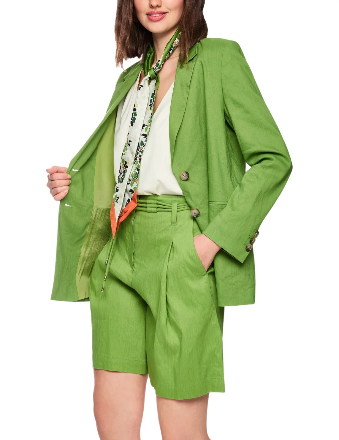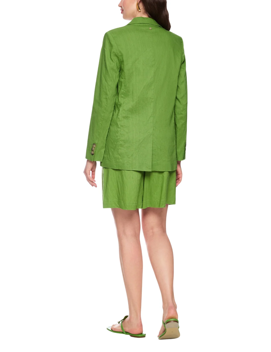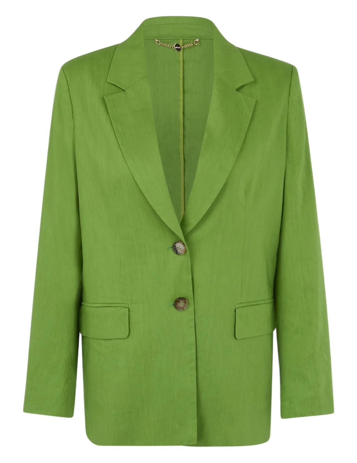 Однобортный пиджак изготовлен из льна, вискозы и эластана. Модель выполнена в прямом крое. Имеет отложной воротник с лацканами, разрез сзади, карманы с декоративными клапанами и длинные рукава.