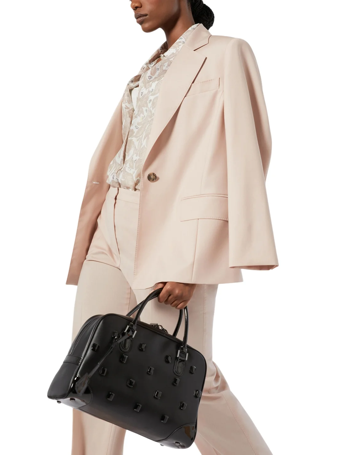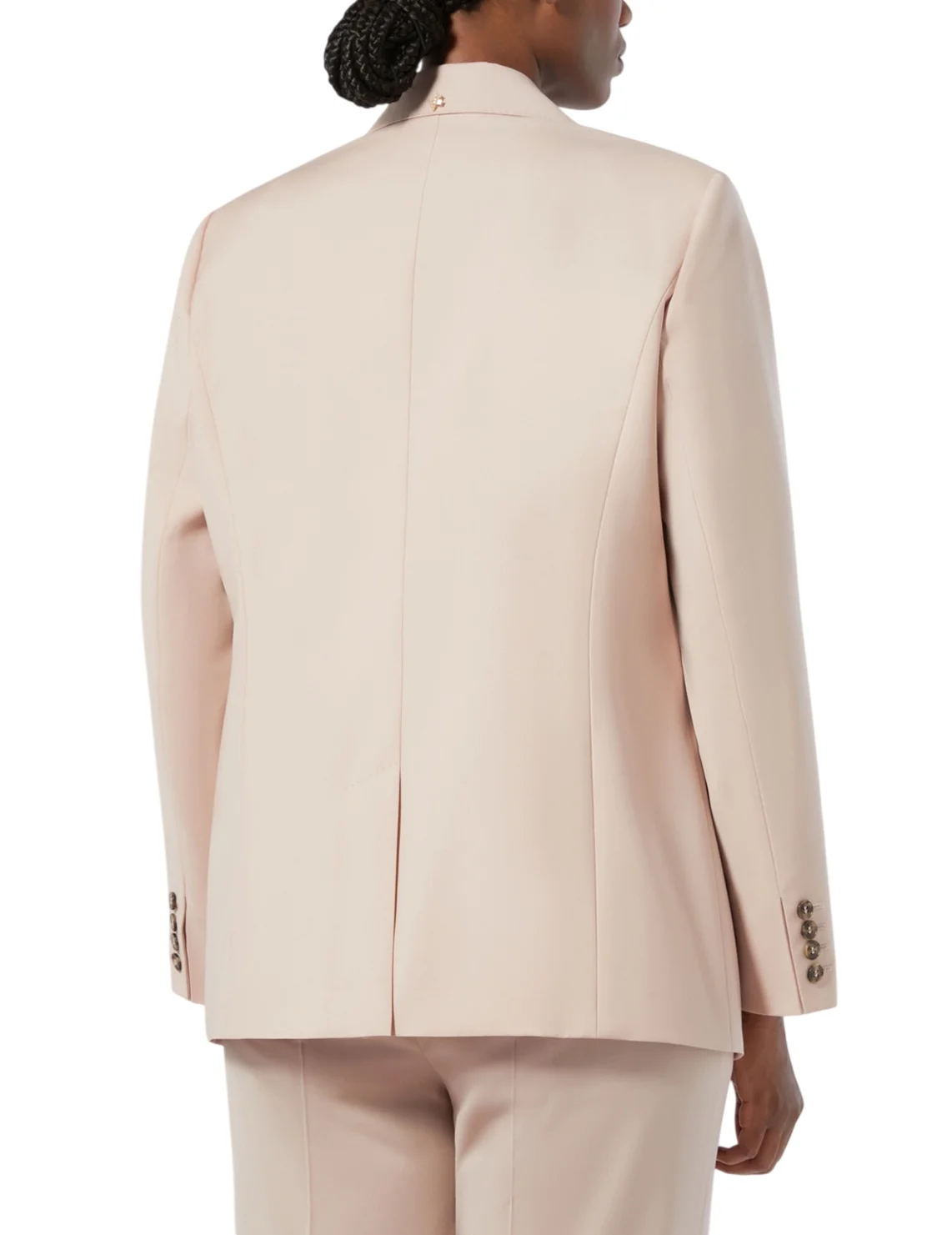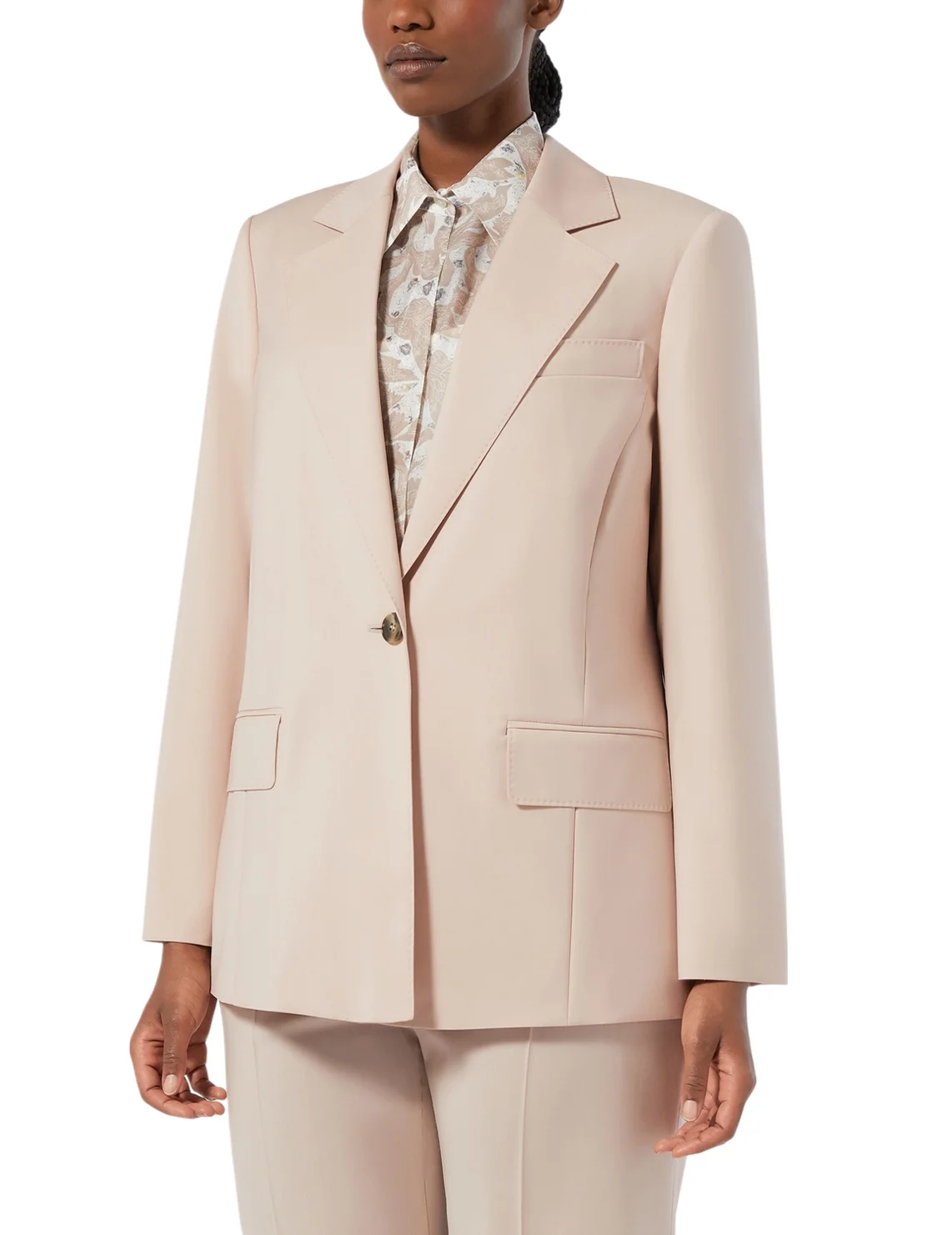 Однобортный пиджак изготовлен из 100% шерсти высокого качества. Модель полуприталенного кроя. Имеет отложной воротник с лацканами, длинные рукава, нагрудный прорезной карман, разрез сзади и передние карманы с клапанами.