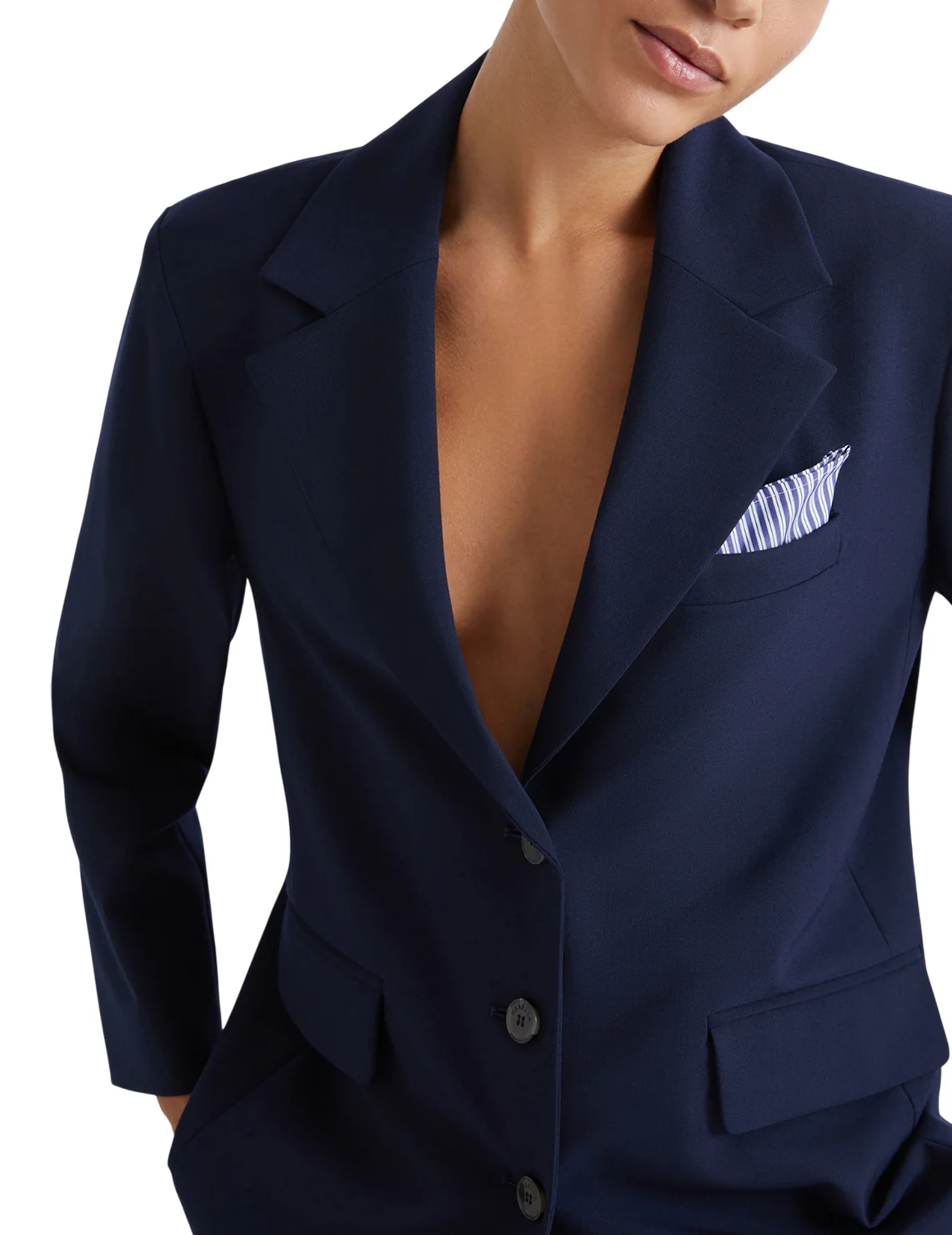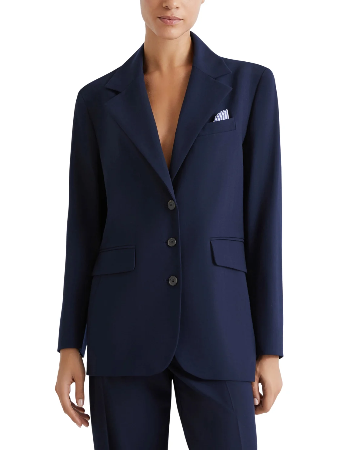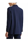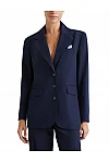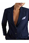 Однобортный пиджак изготовлен из полиэстера, шерсти и эластана, подкладка их ацетата и полиэстера. Модель выполнена в прямом крое. Имеет отложной воротник с лацканами, передние прорезные карманы с клапанами, нагрудный карман с декоративным платком, застежку на пуговицах и длинные рукава.