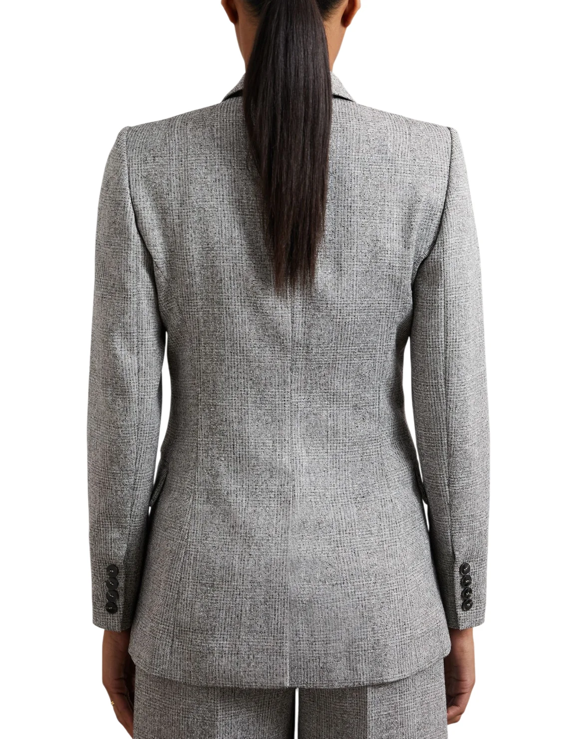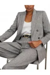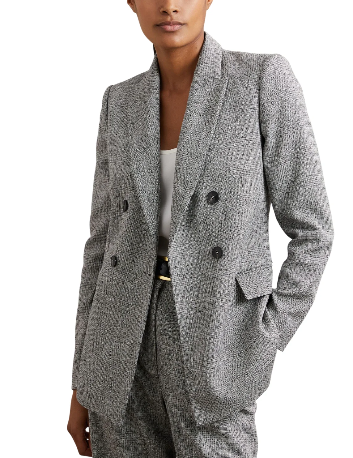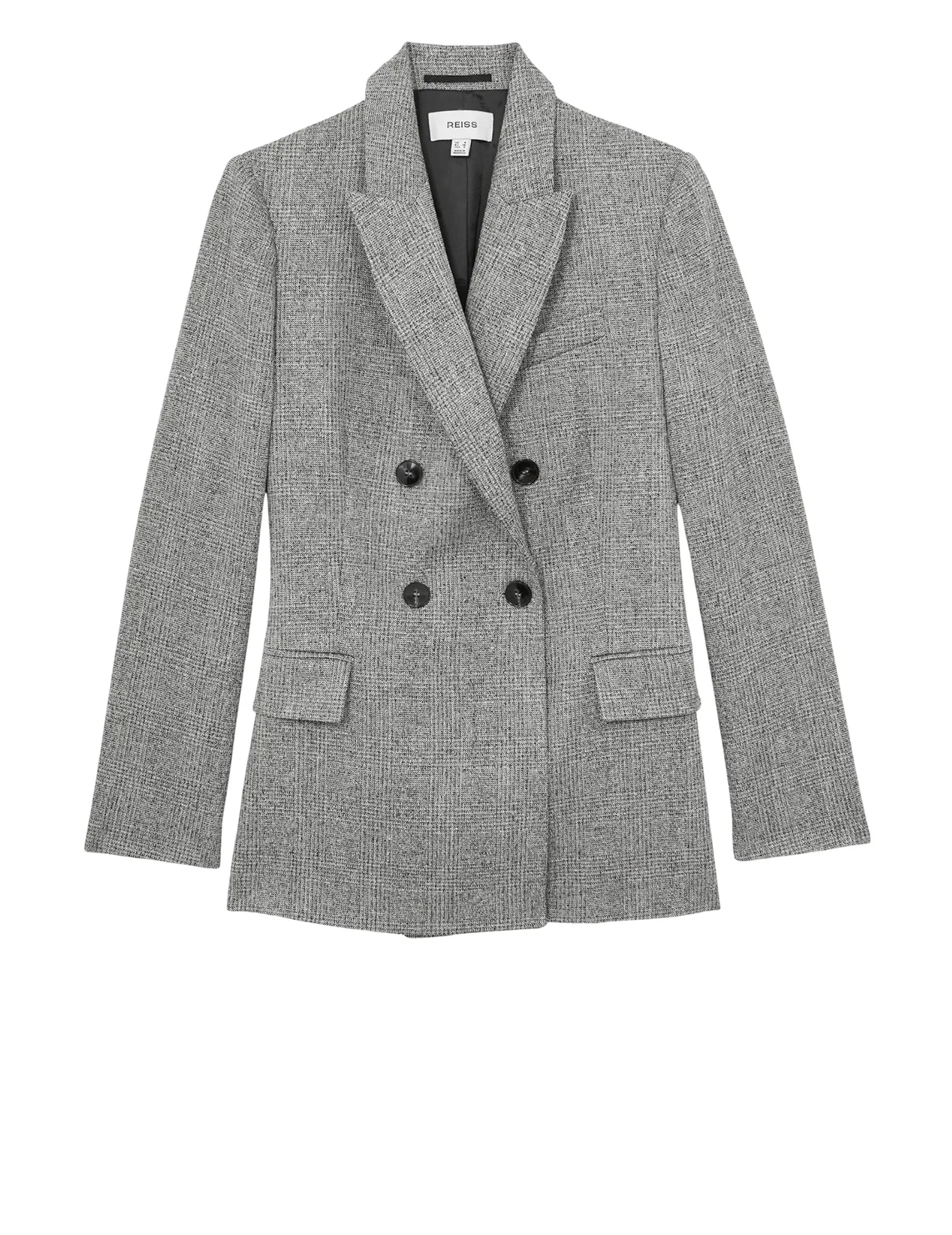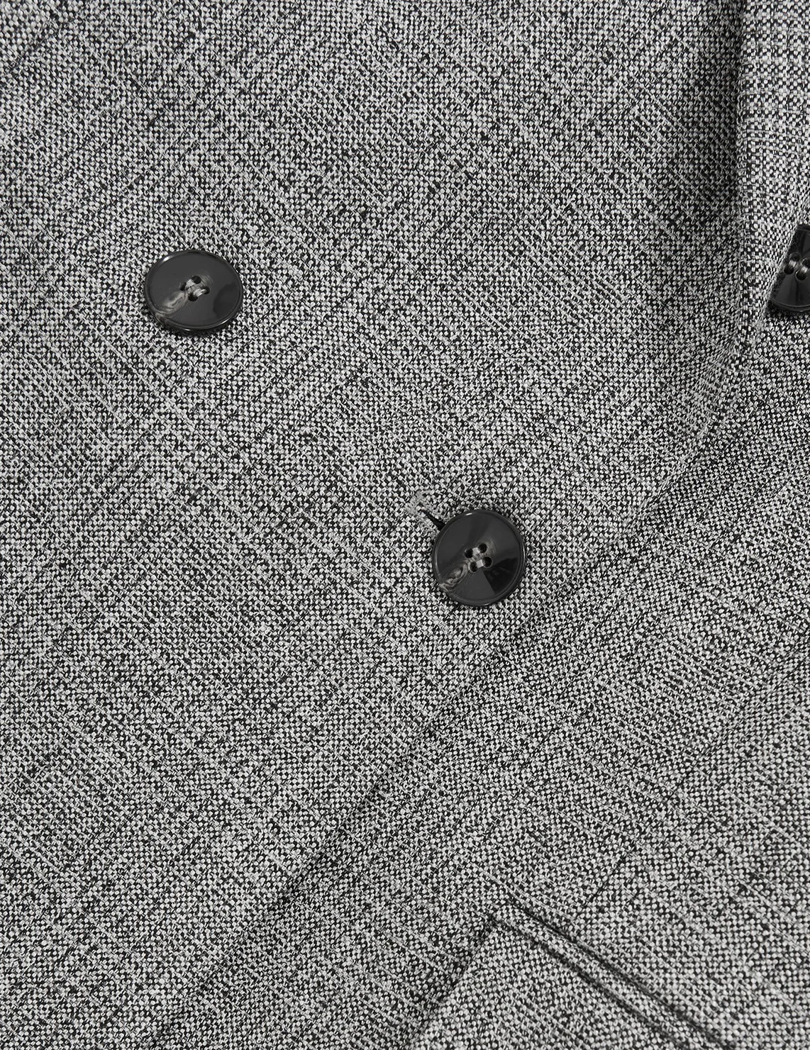 Двубортный пиджак изготовлен из полиэстера, вискозы и эластана. Модель выполнена в прямом крое. Имеет отложной воротник с лацканами, длинные рукава, застежку на пуговицах и декоративные клапаны. Декорирован принтом в клетку.