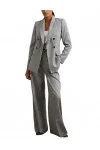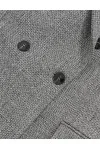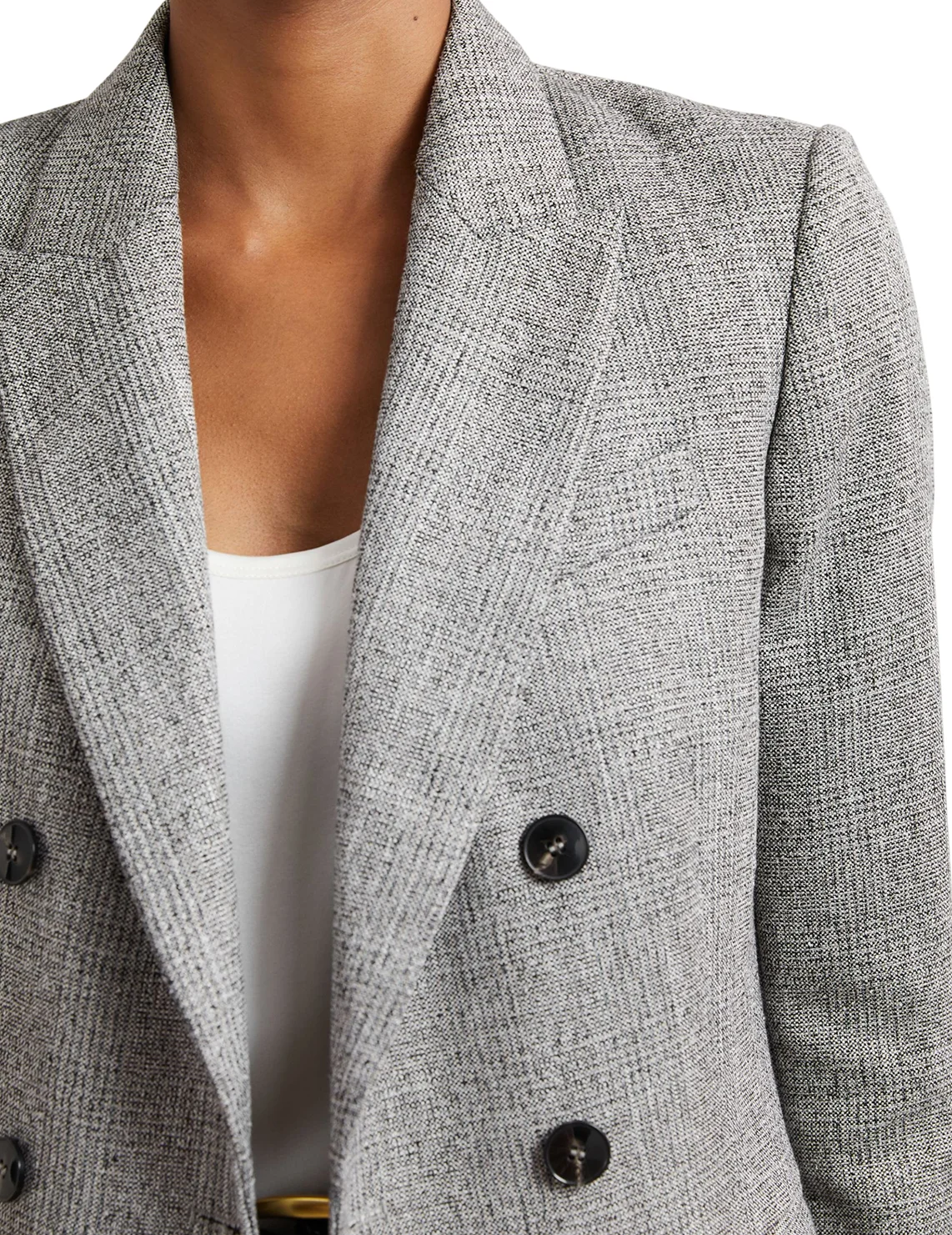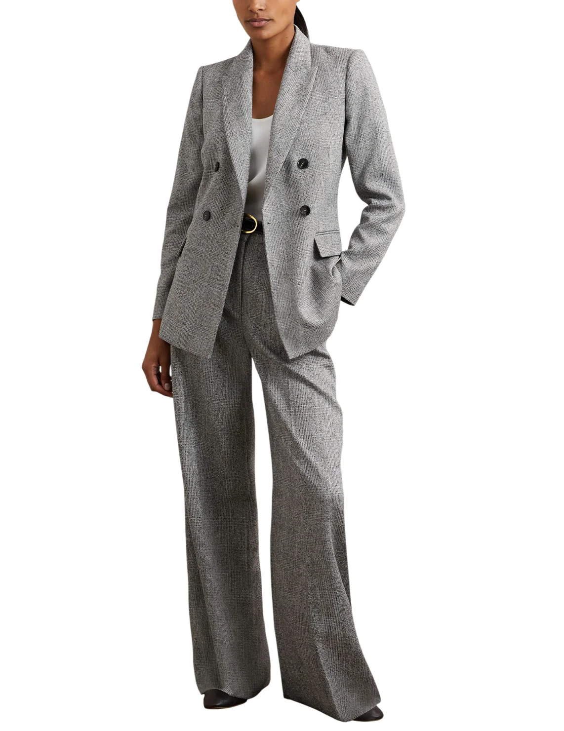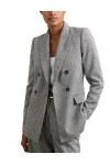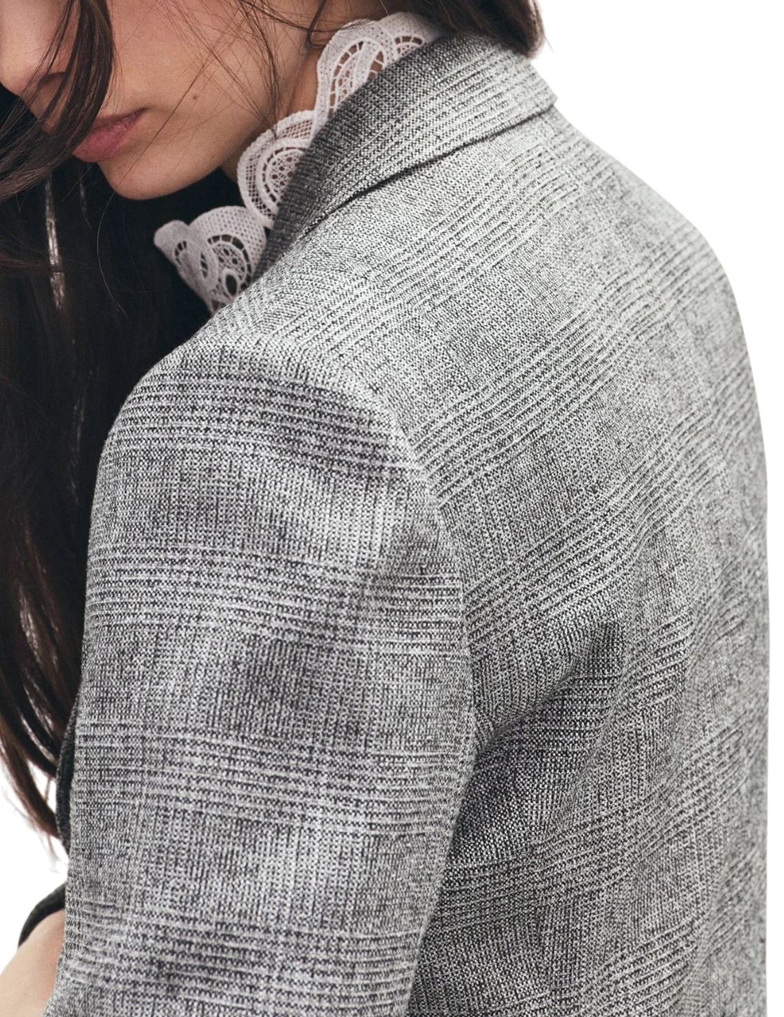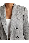 Двубортный пиджак изготовлен из полиэстера, вискозы и эластана. Модель выполнена в прямом крое. Имеет отложной воротник с лацканами, длинные рукава, застежку на пуговицах и декоративные клапаны. Декорирован принтом в клетку.