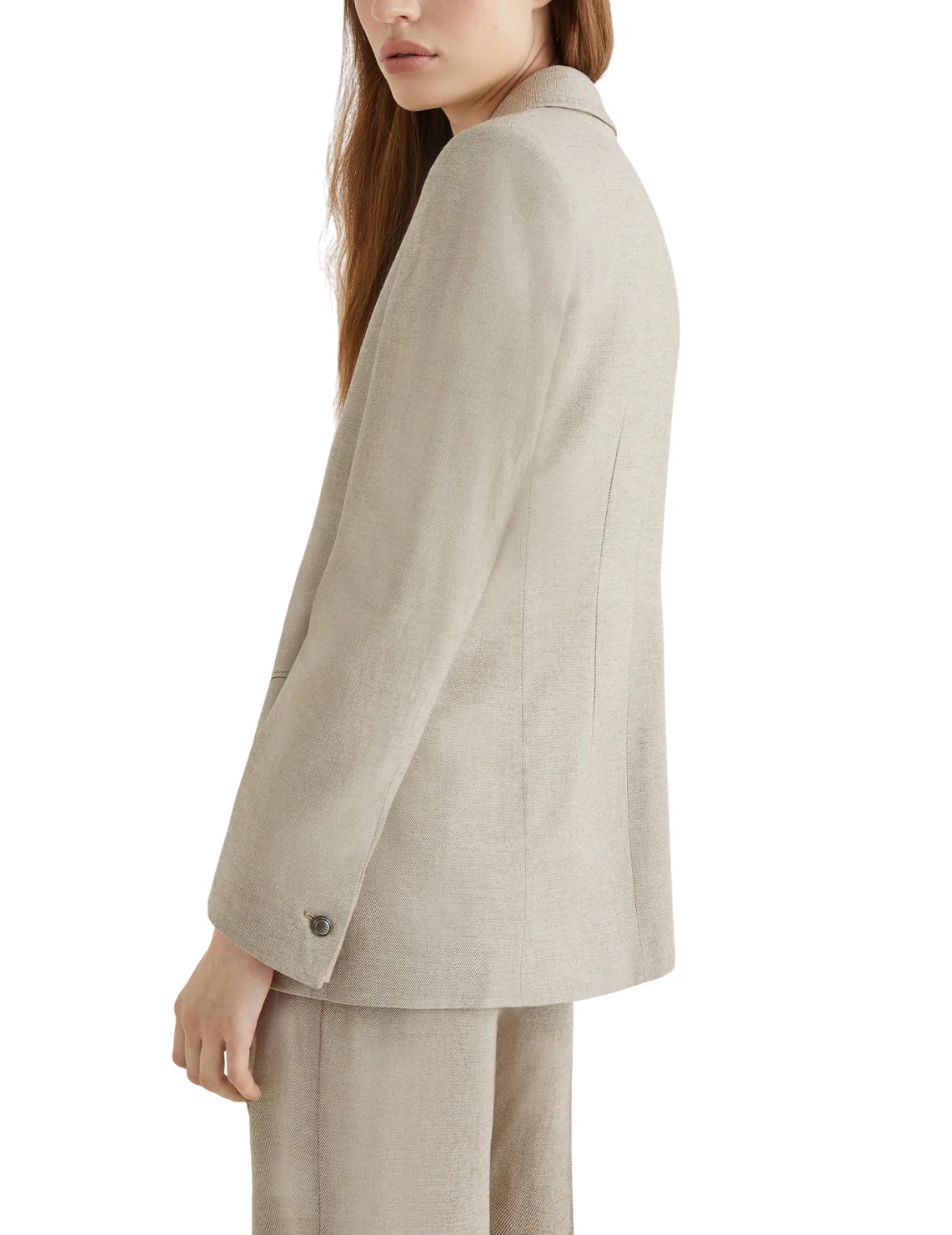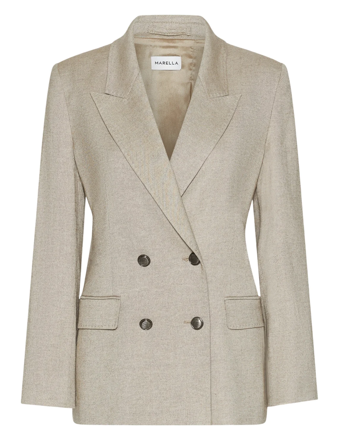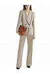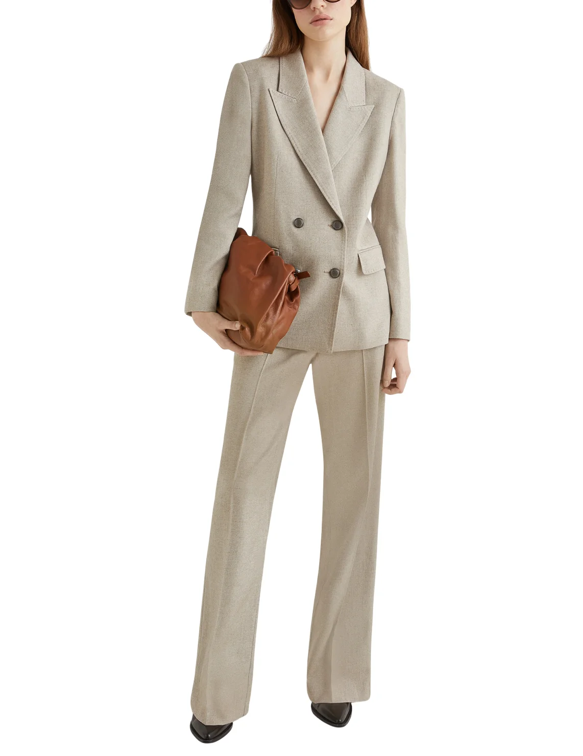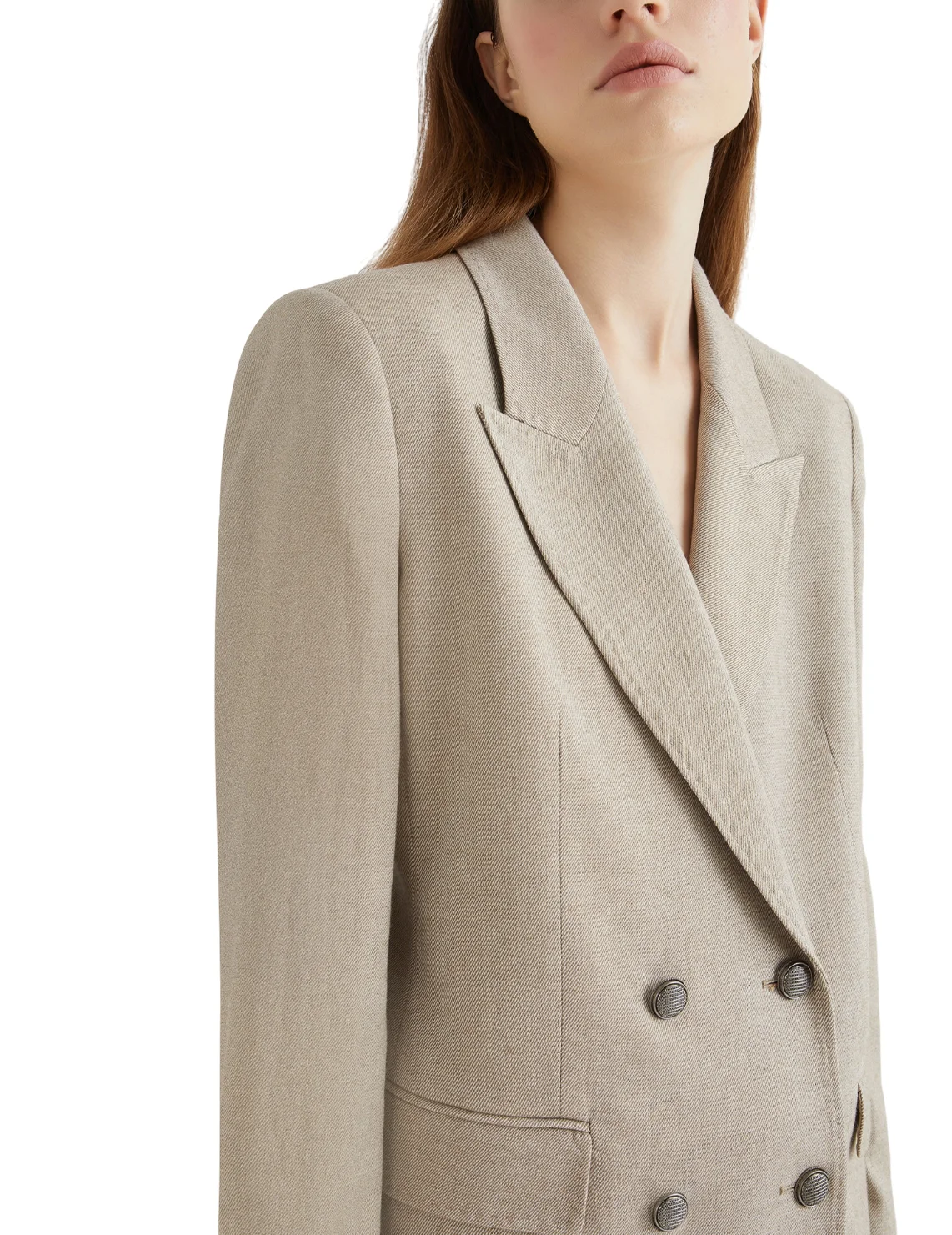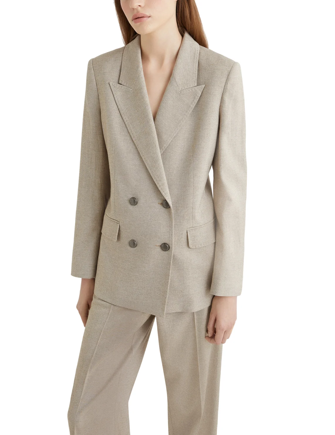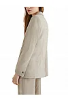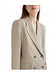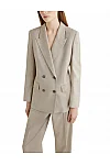 Двубортный пиджак изготовлен из полиэстера, хлопка, шерсти, вискозы, полиамида и эластана, подкладка из ацетата и полиэстера. Модель выполнена в прямом крое. Имеет отложной воротник с лацканами, застежку на пуговицах, боковые карманы с клапанами и длинные рукава.