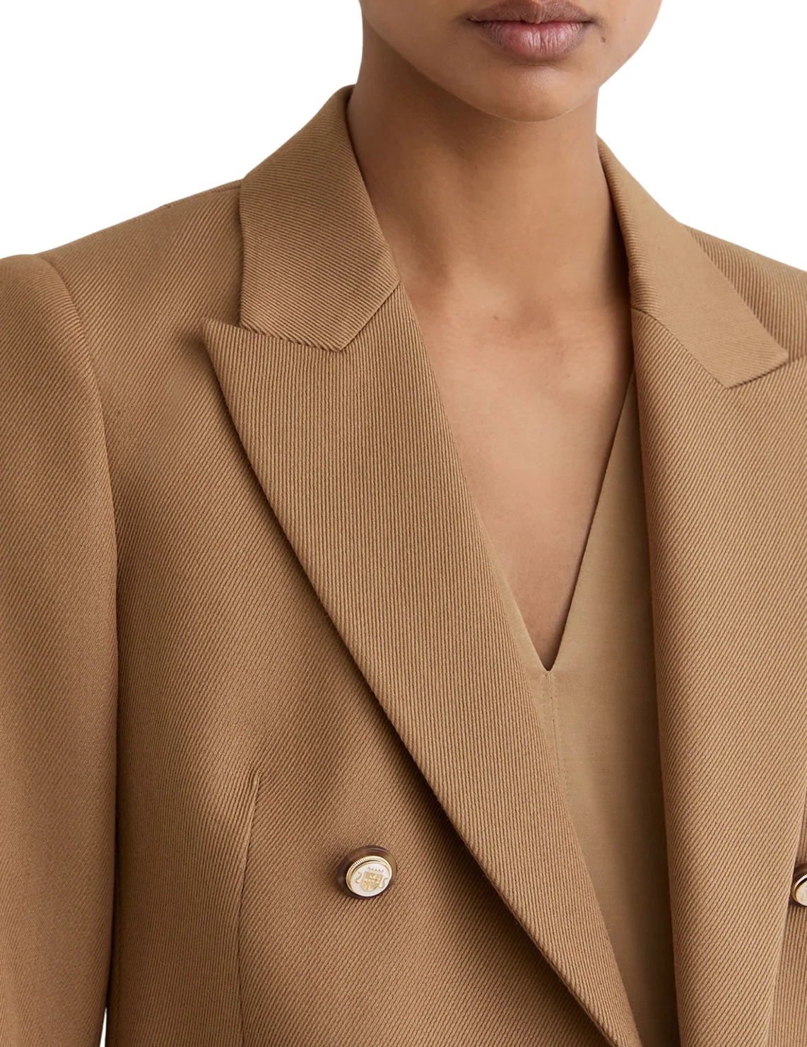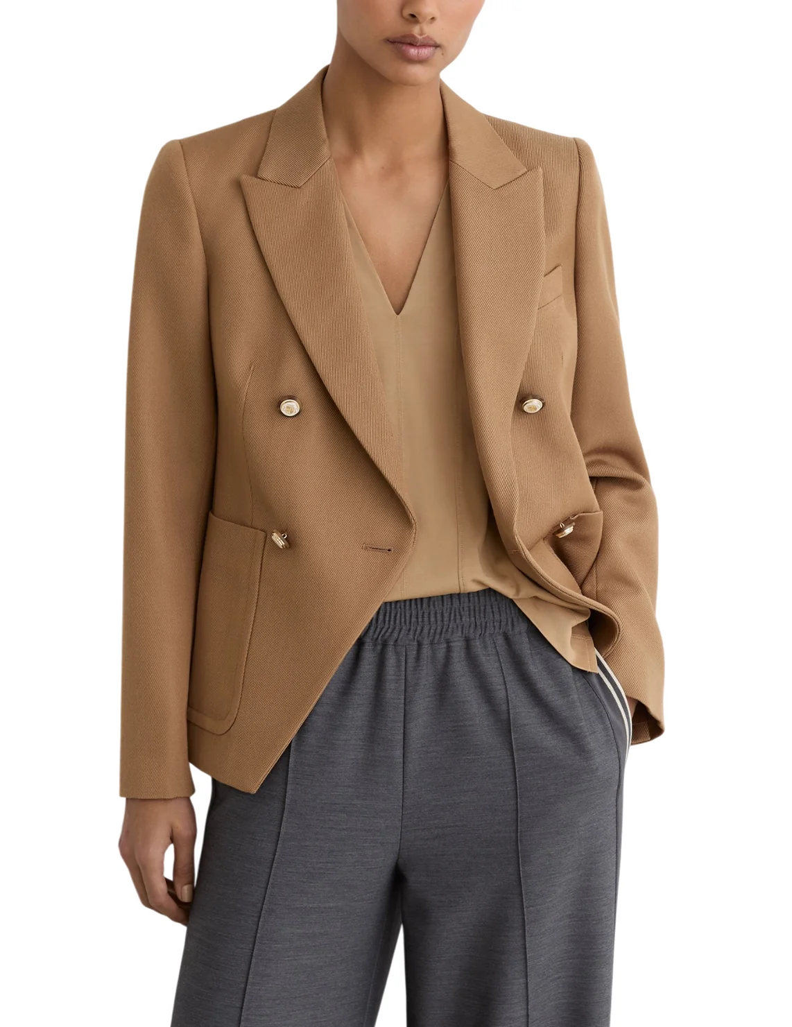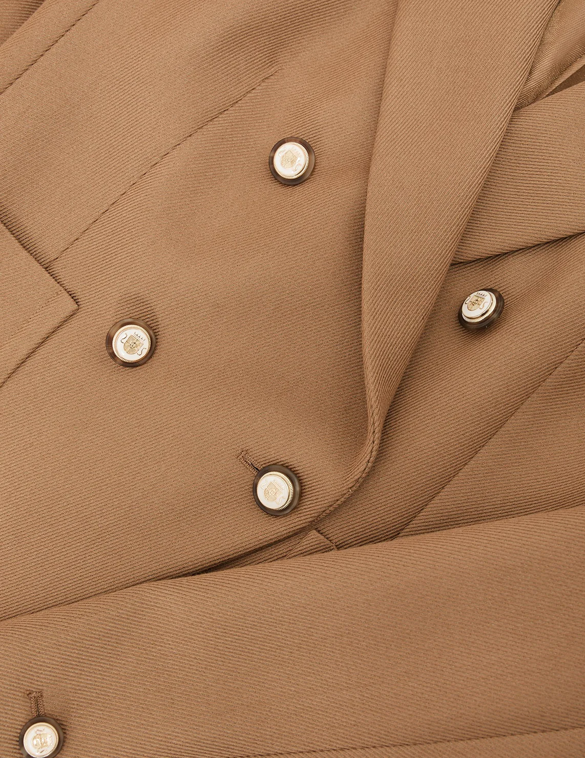 Двубортный пиджак изготовлен из шерсти, вискозы и полиэстера. Модель выполнена в прямом крое. Имеет отложной воротник с лацканами, накладные передние карманы, декоративный нагрудный карман, длинные рукава и застежку на золотистых пуговицах.