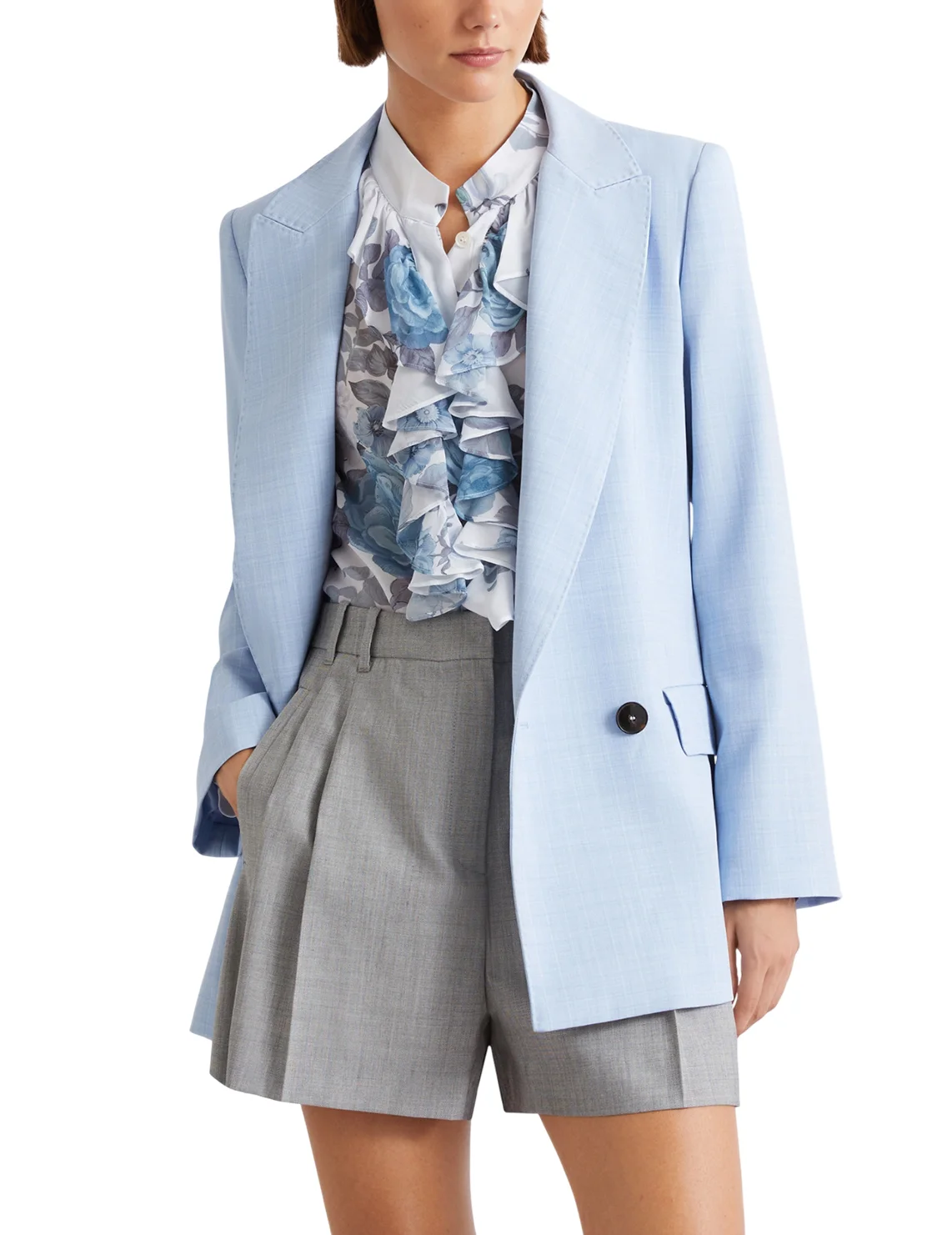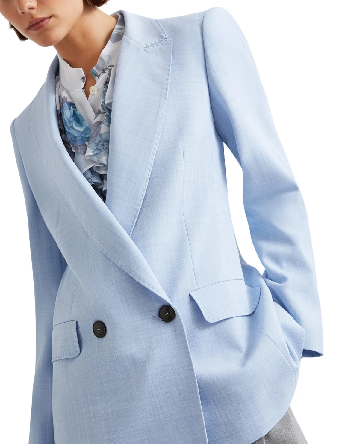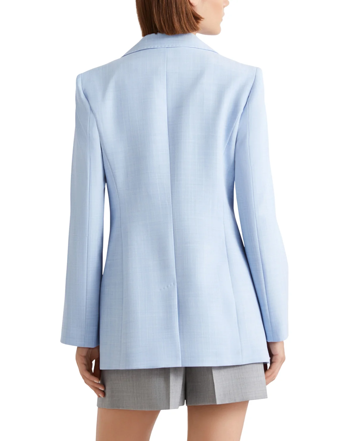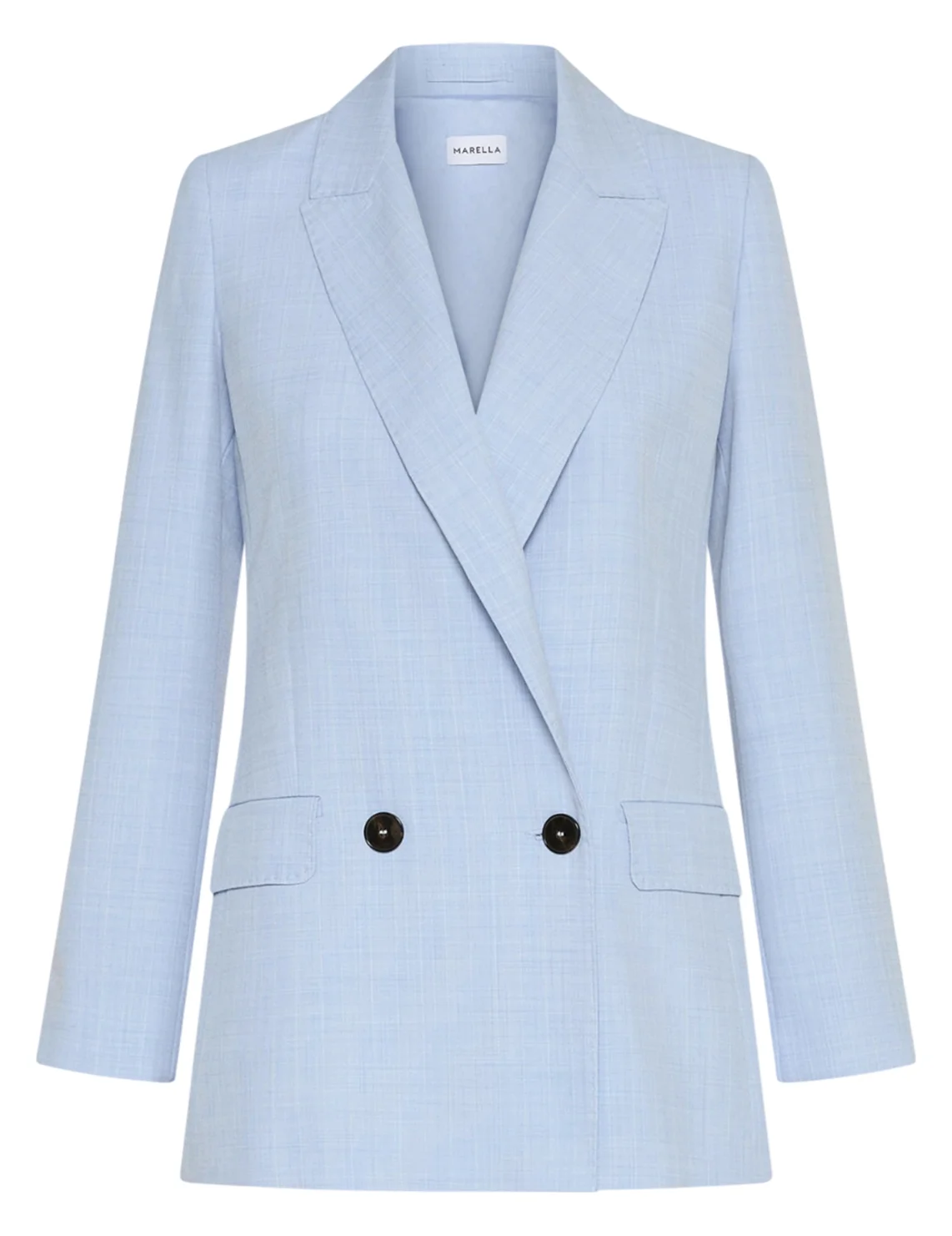 Двубортный пиджак изготовлен из полиэстера и эластана, подкладка из ацетата и полиэстера. Модель выполнена в приталенном крое. Имеет отложной воротник с лацканами, длинные рукава, застежку на пуговицах и карманы с клапанами. Декорирован принтом в полоску.