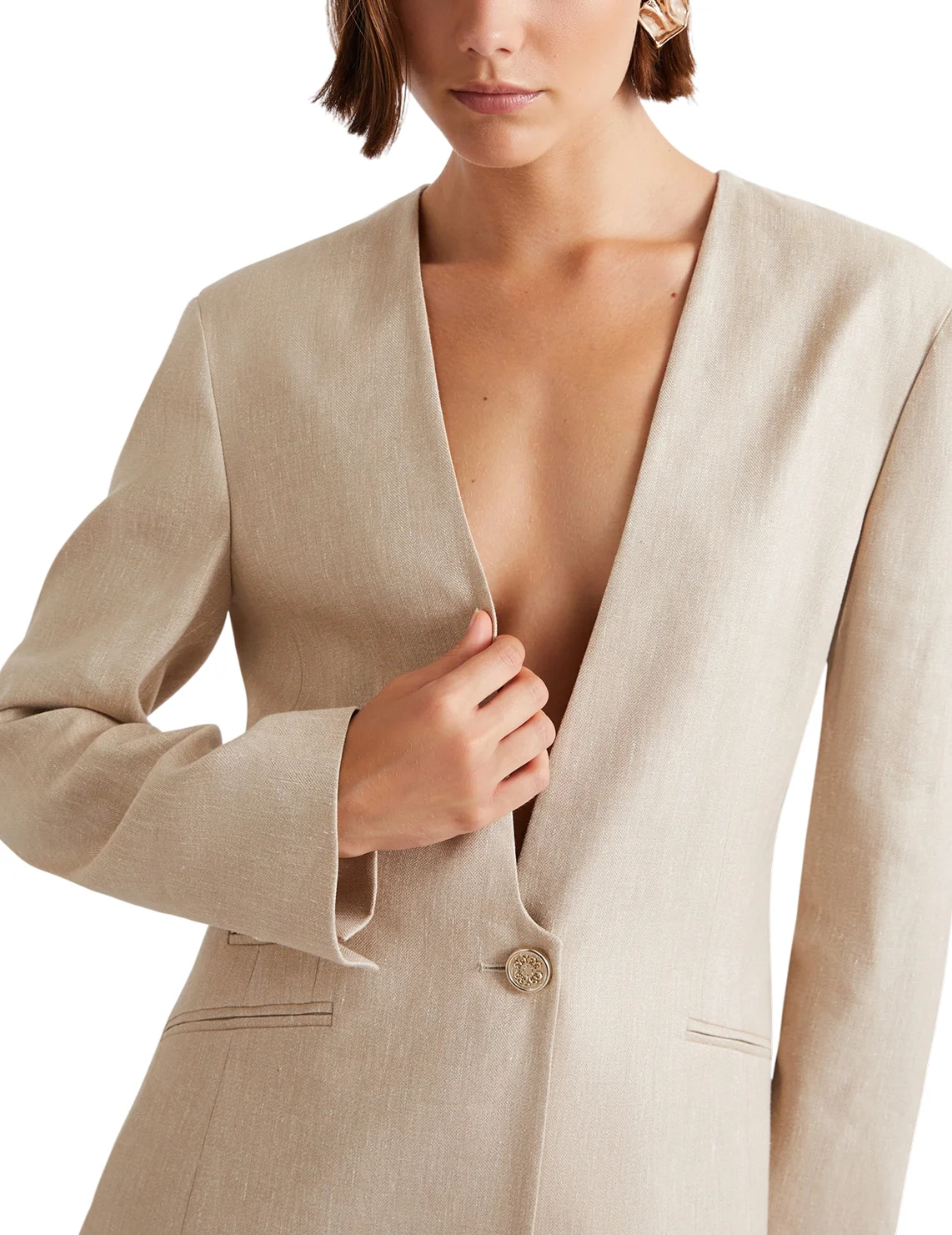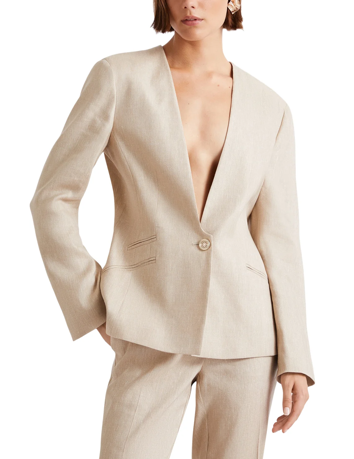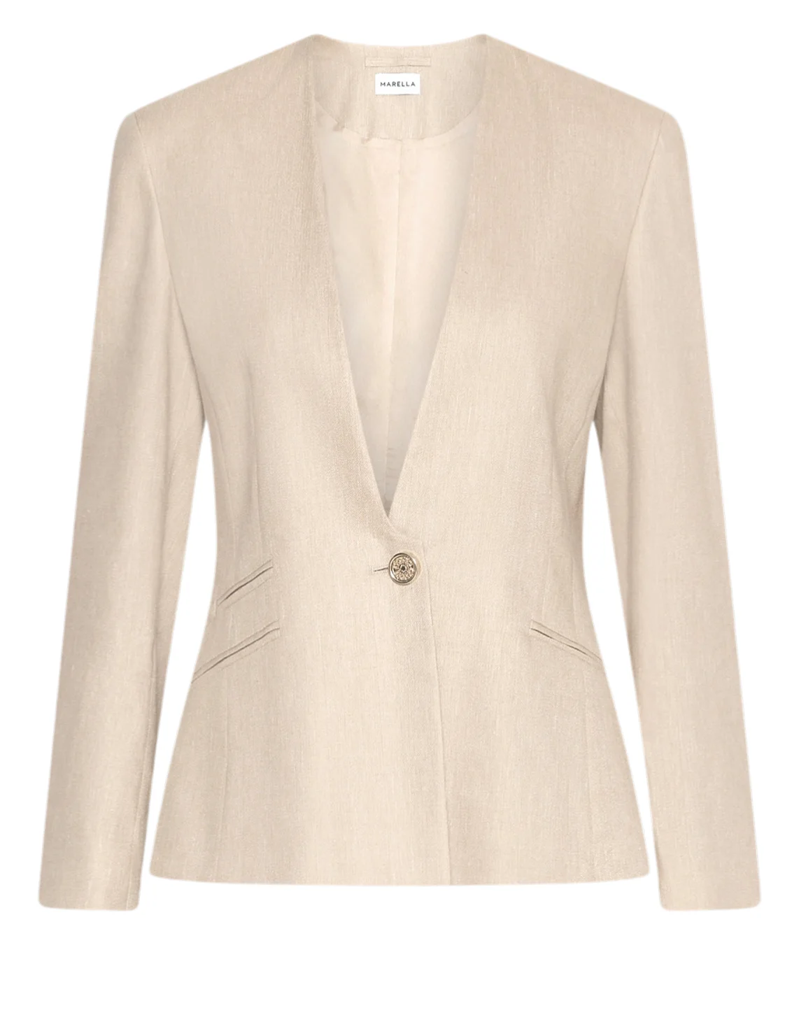 Однобортный пиджак изготовлен из льна, вискозы, полиэстера и эластана, подкладка из ацетата и полиэстера. Модель выполнена в приталенном крое. Имеет V-образный вырез горловины, застежку на пуговице, прорезные карманы и длинные рукава.