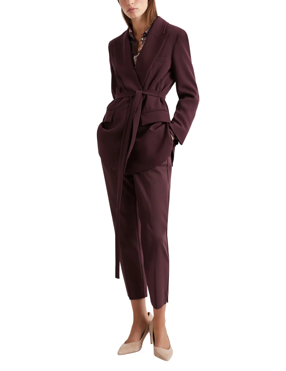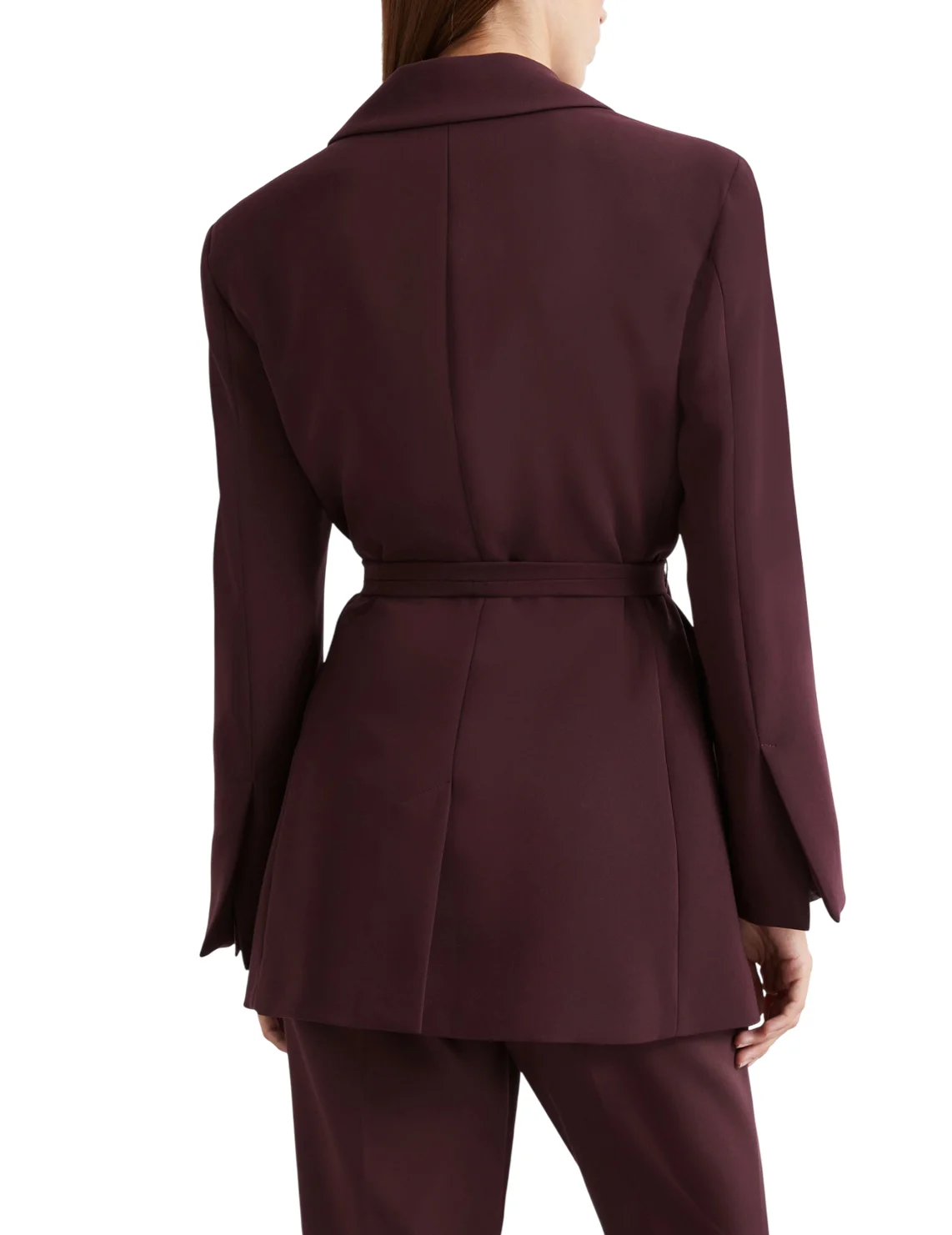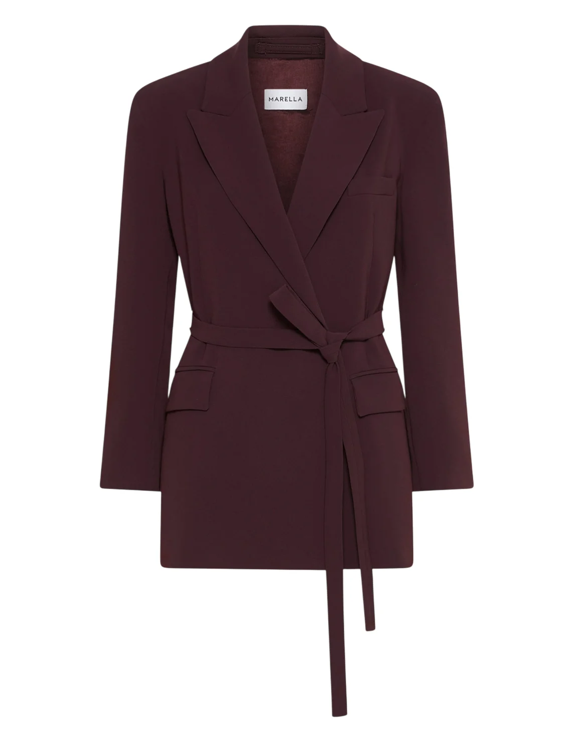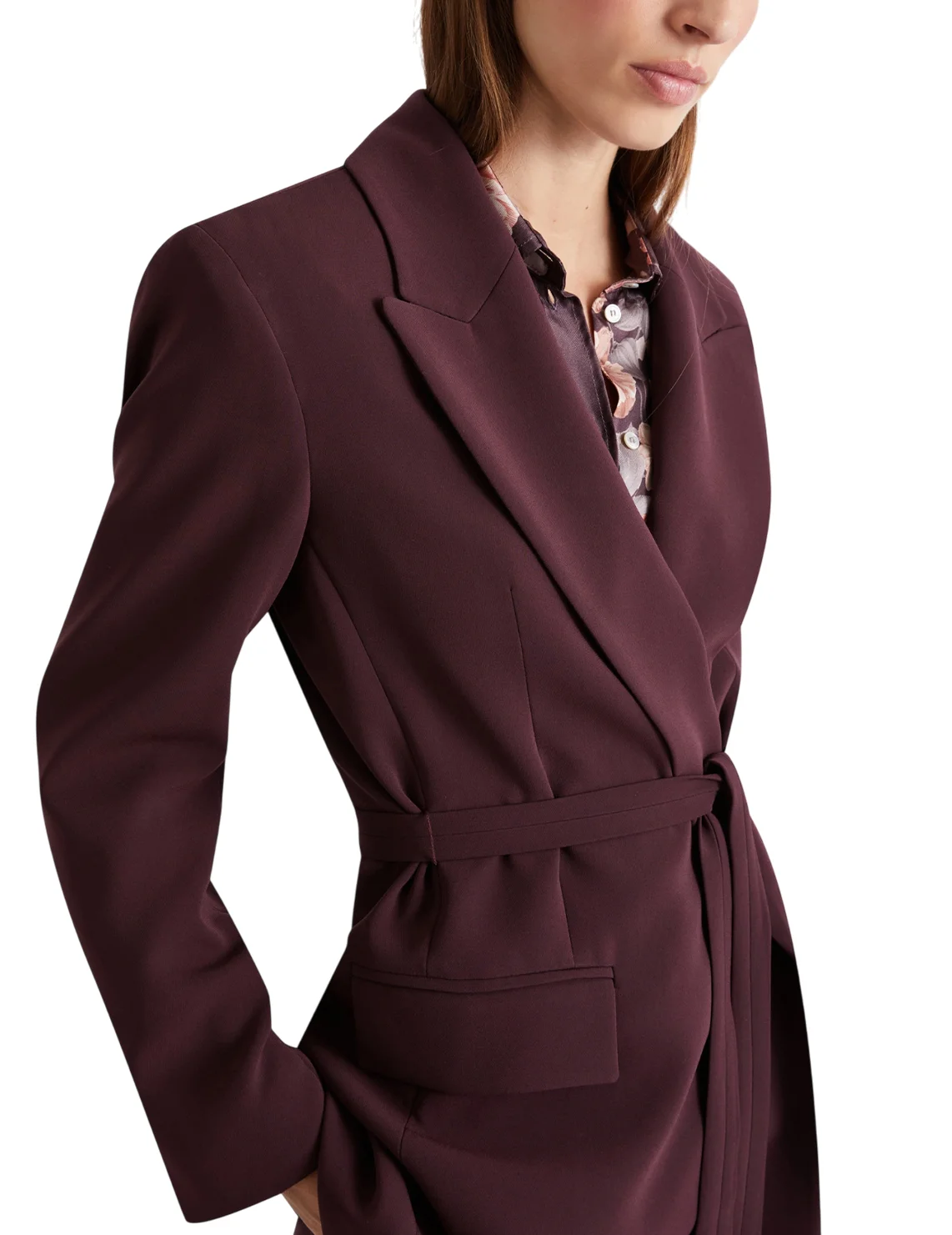 Пиджак изготовлен из триацетата и полиэстера, подкладка из ацетата и полиэстера. Модель без застежки приталенного кроя. Имеет отложной воротник с лацканами, длинные рукава с разрезами, нагрудный декоративный карман, тканевый пояс в тон и передние карманы с клапанами.