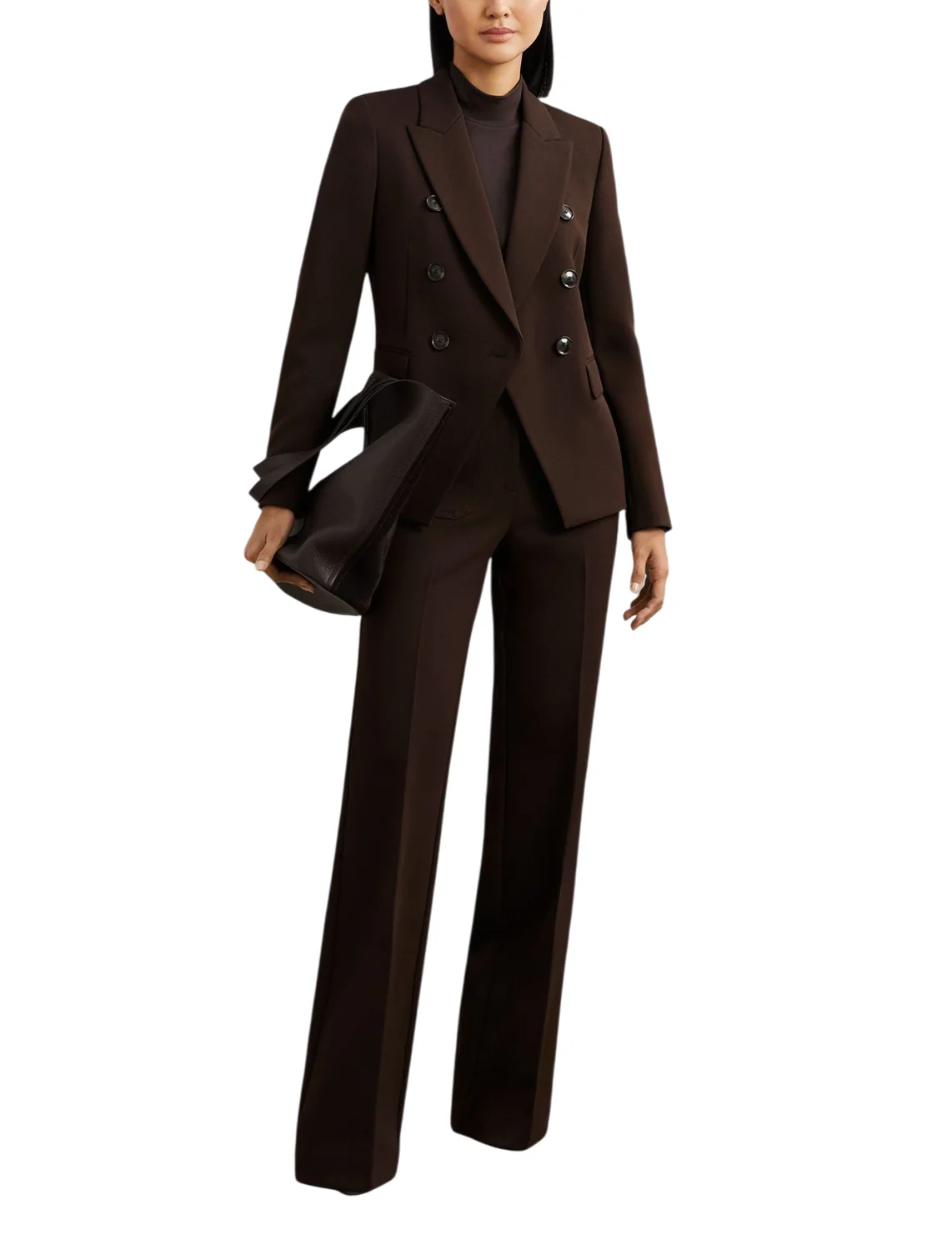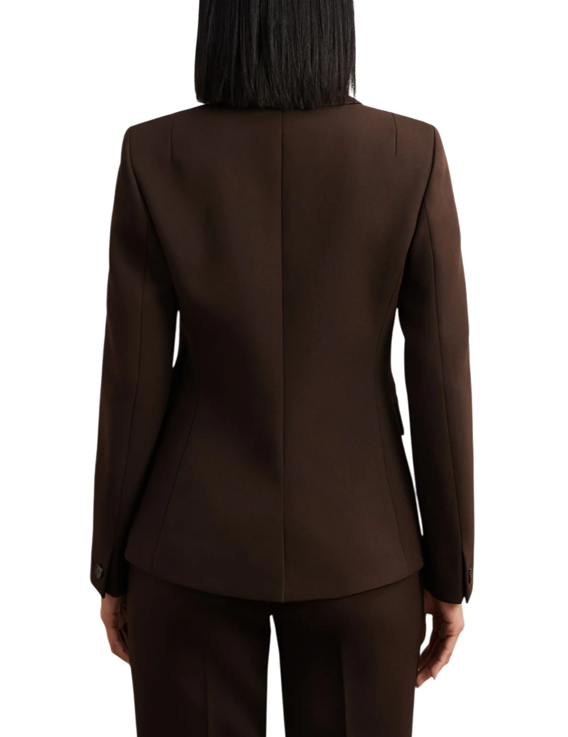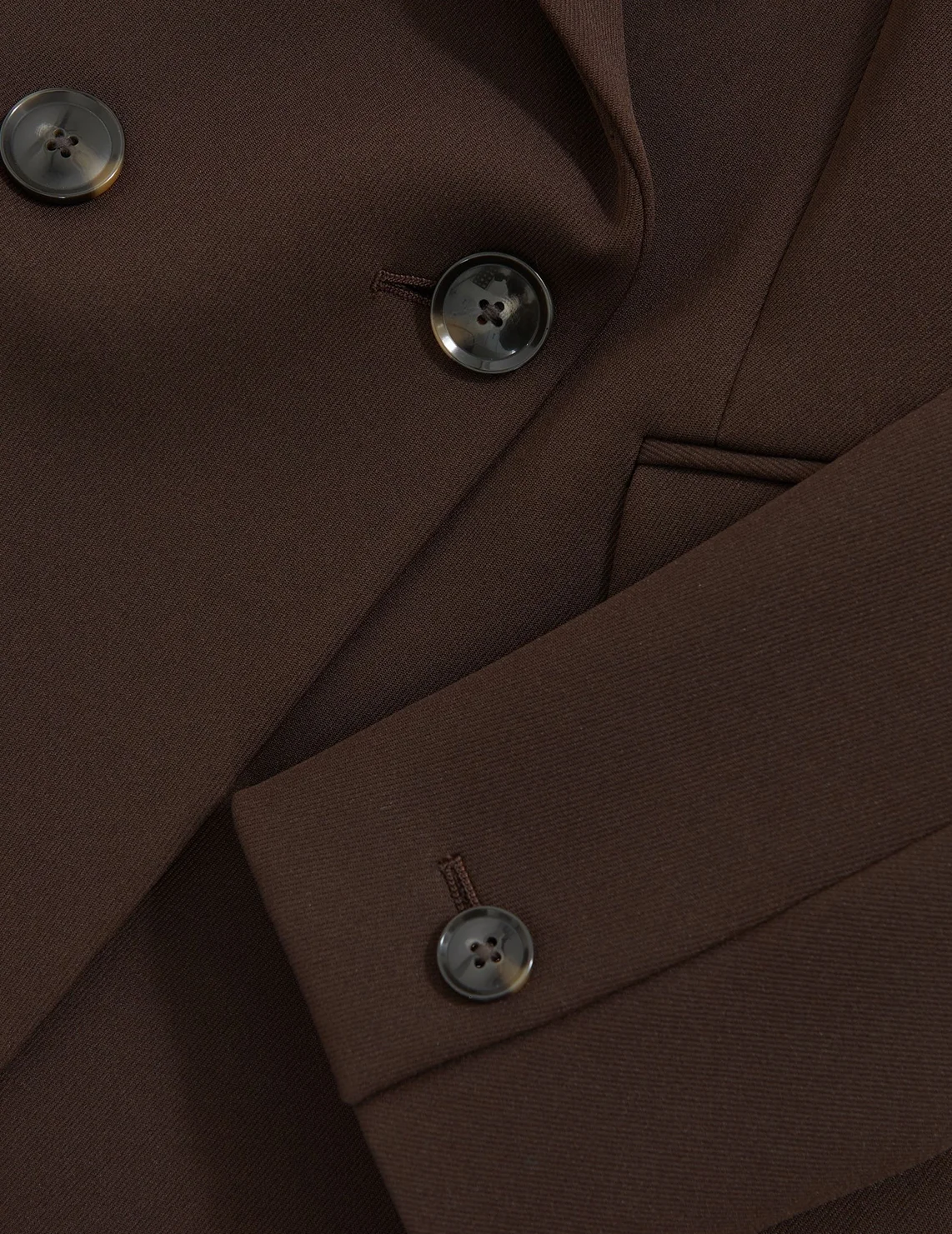 Двубортный пиджак изготовлен из полиэстера и ацетата. Модель выполнена в приталенном крое. Имеет отложной воротник с лацканами, длинные рукава, застежку на пуговицах и декоративные клапаны.