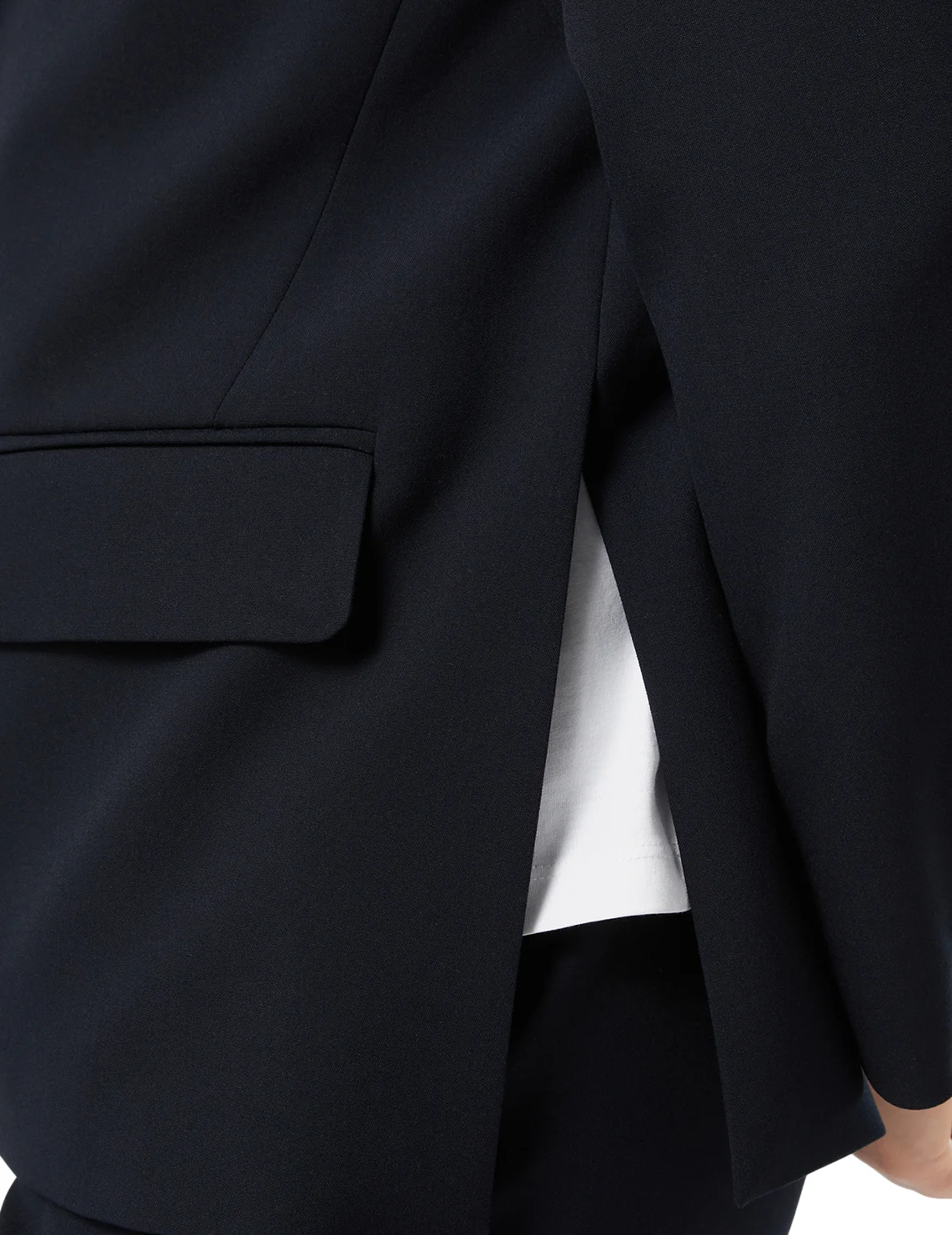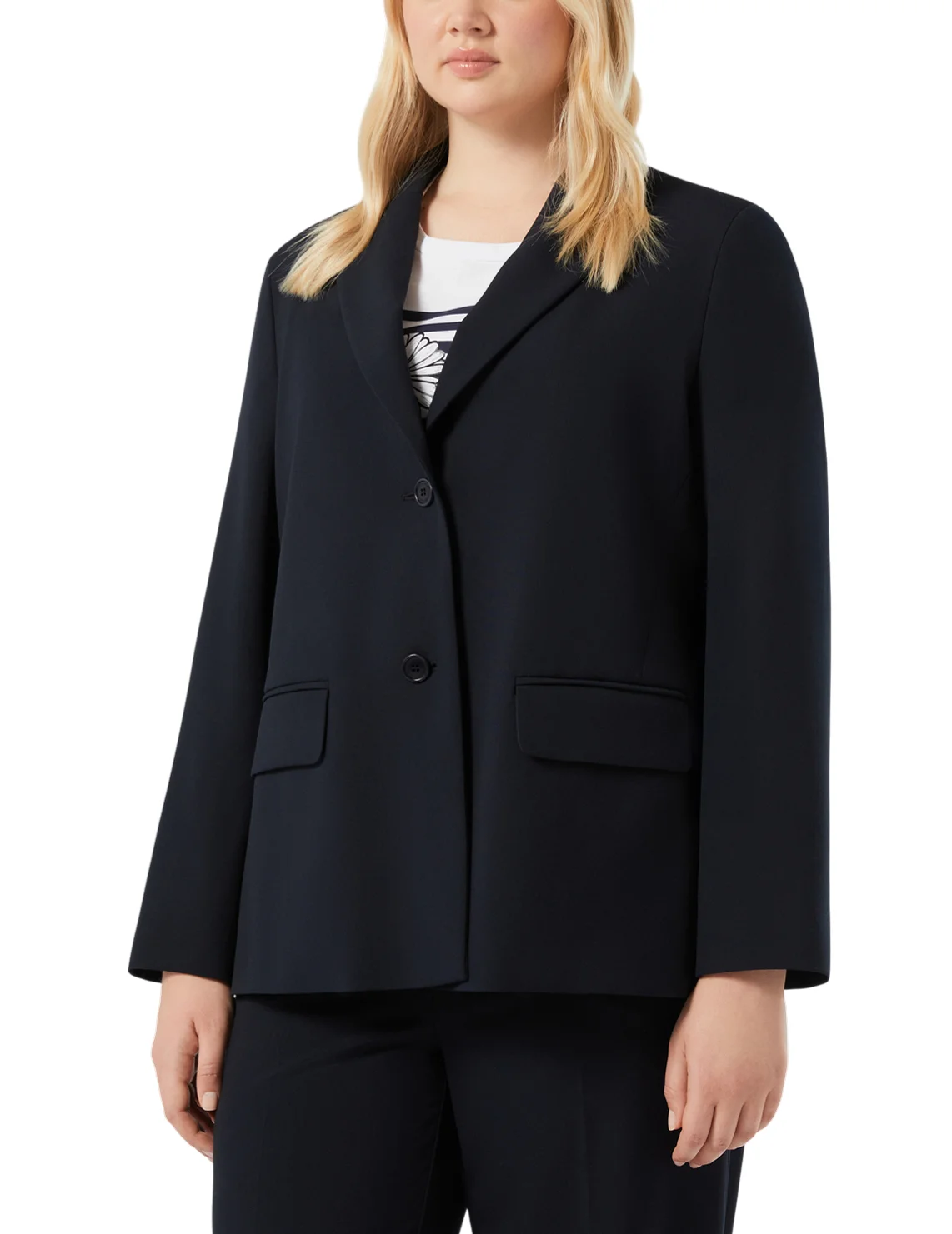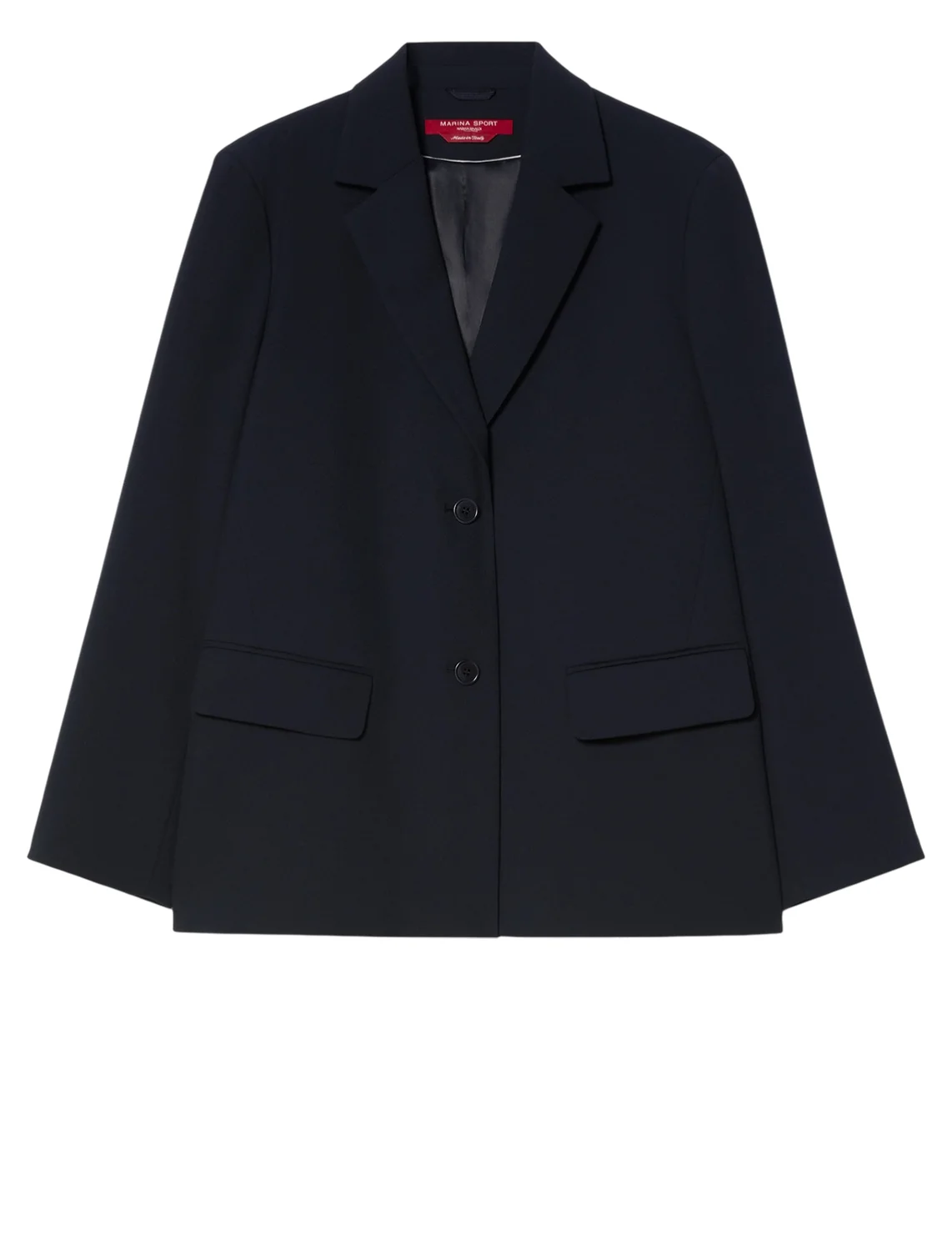 Пиджак изготовлен из полиэстера, вискозы и эластана, подкладка из ацетата и полиэстера. Модель выполнена в прямом крое. Имеет отложной воротник с лацканами, длинные рукава, боковые разрезы и карманы с клапанами.
