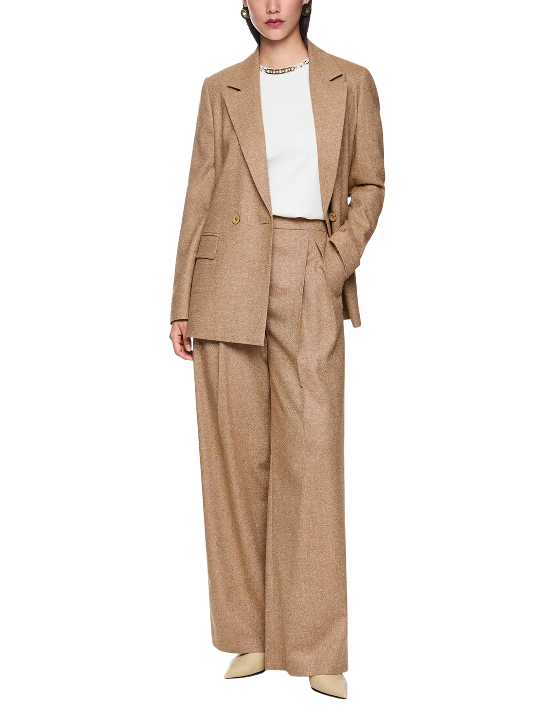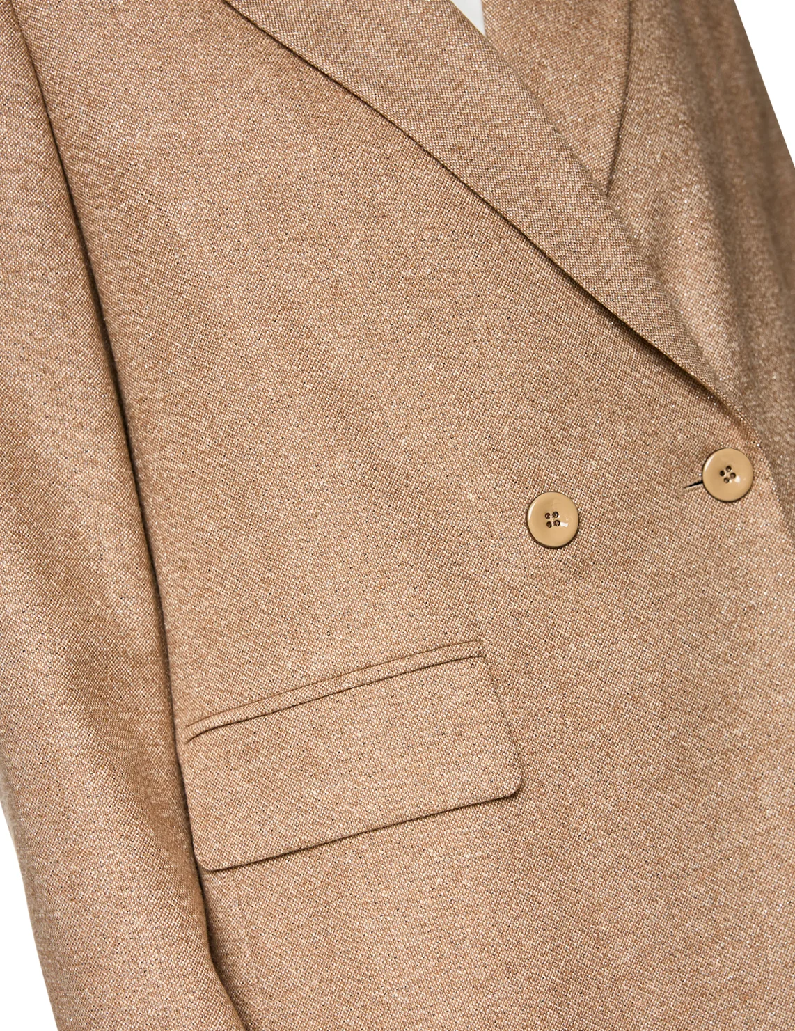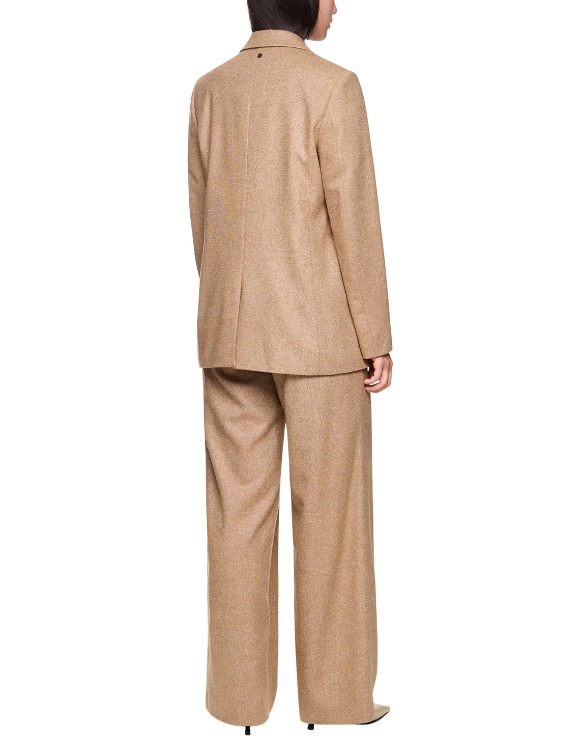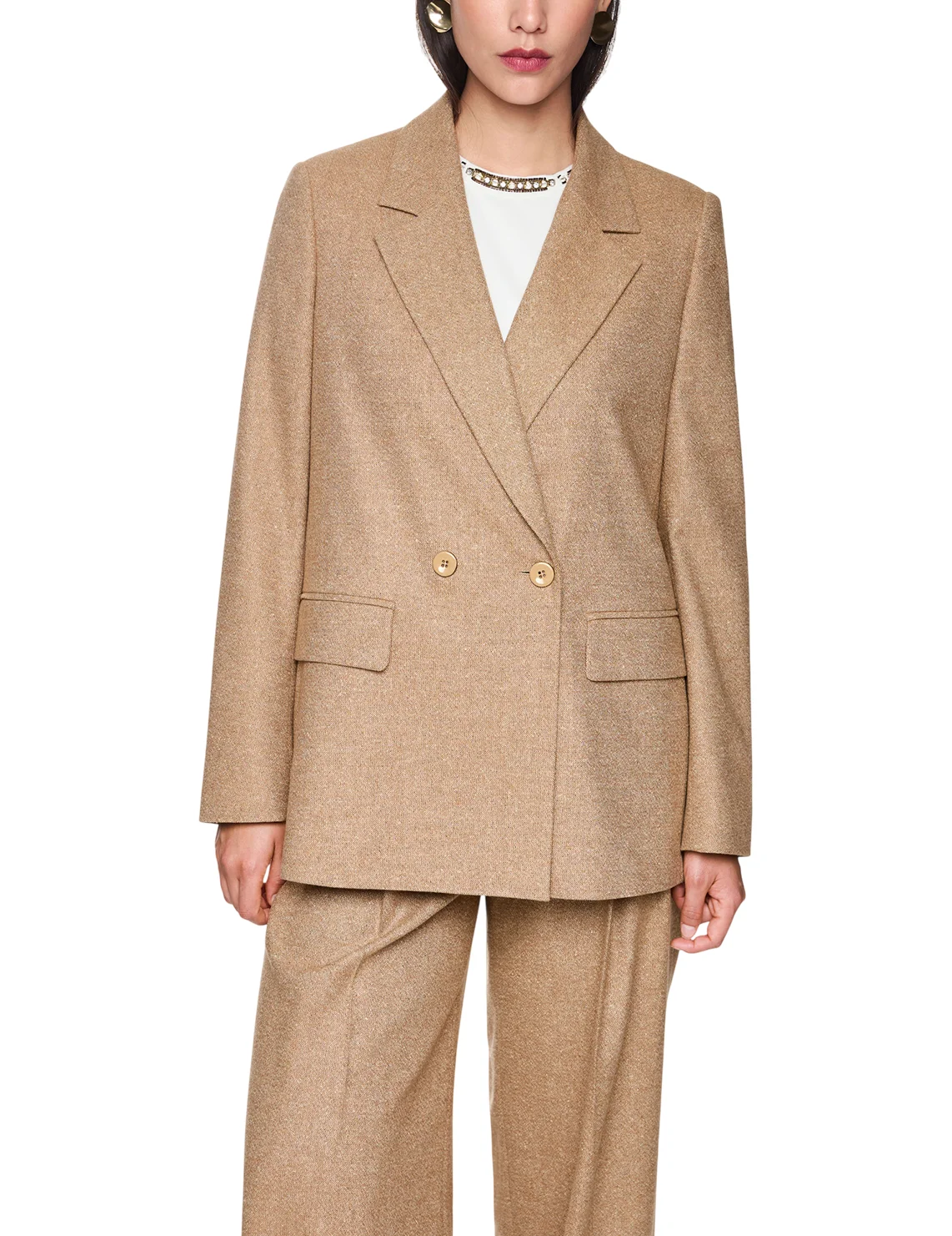 Двубортный пиджак изготовлен из акрила, шерсти, полиэстера, шелка, полиамида и других волокон, подкладка из полиэстера и эластомультиэстера. Модель выполнена в свободном крое. Имеет отложной воротник с лацканами, декоративные карманы с клапанами, разрез сзади и длинные рукава.