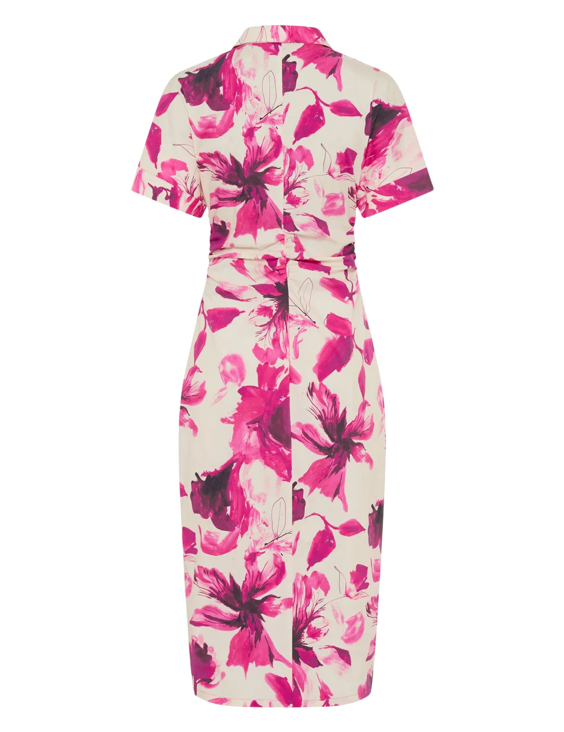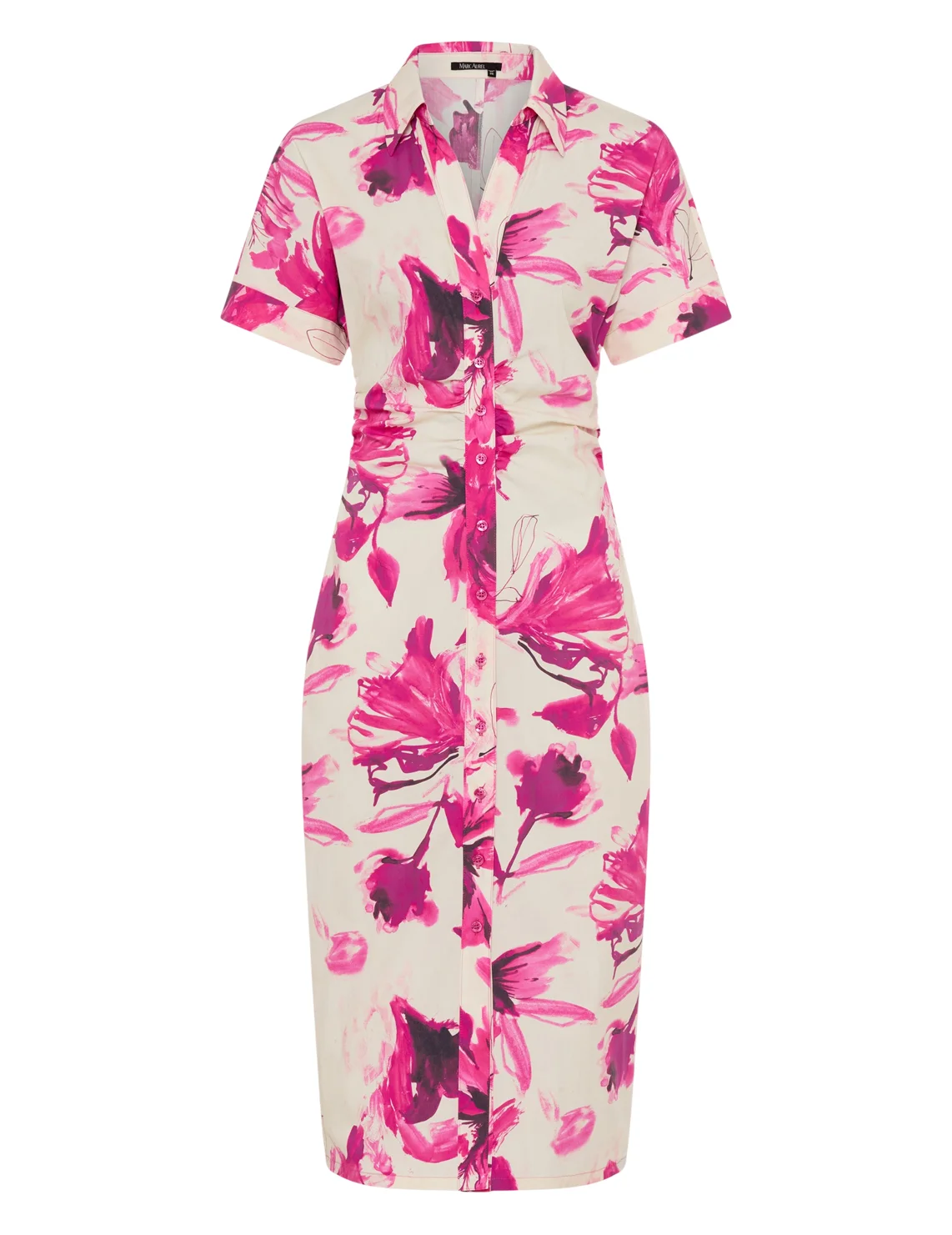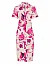 Платье изготовлено из хлопка, полиамида и эластана. Модель длины меди выполнена в приталенном крое. Имеет отложной воротник, короткие рукава и застежку на планку с пуговицами. Декорированная цветочным принтом.