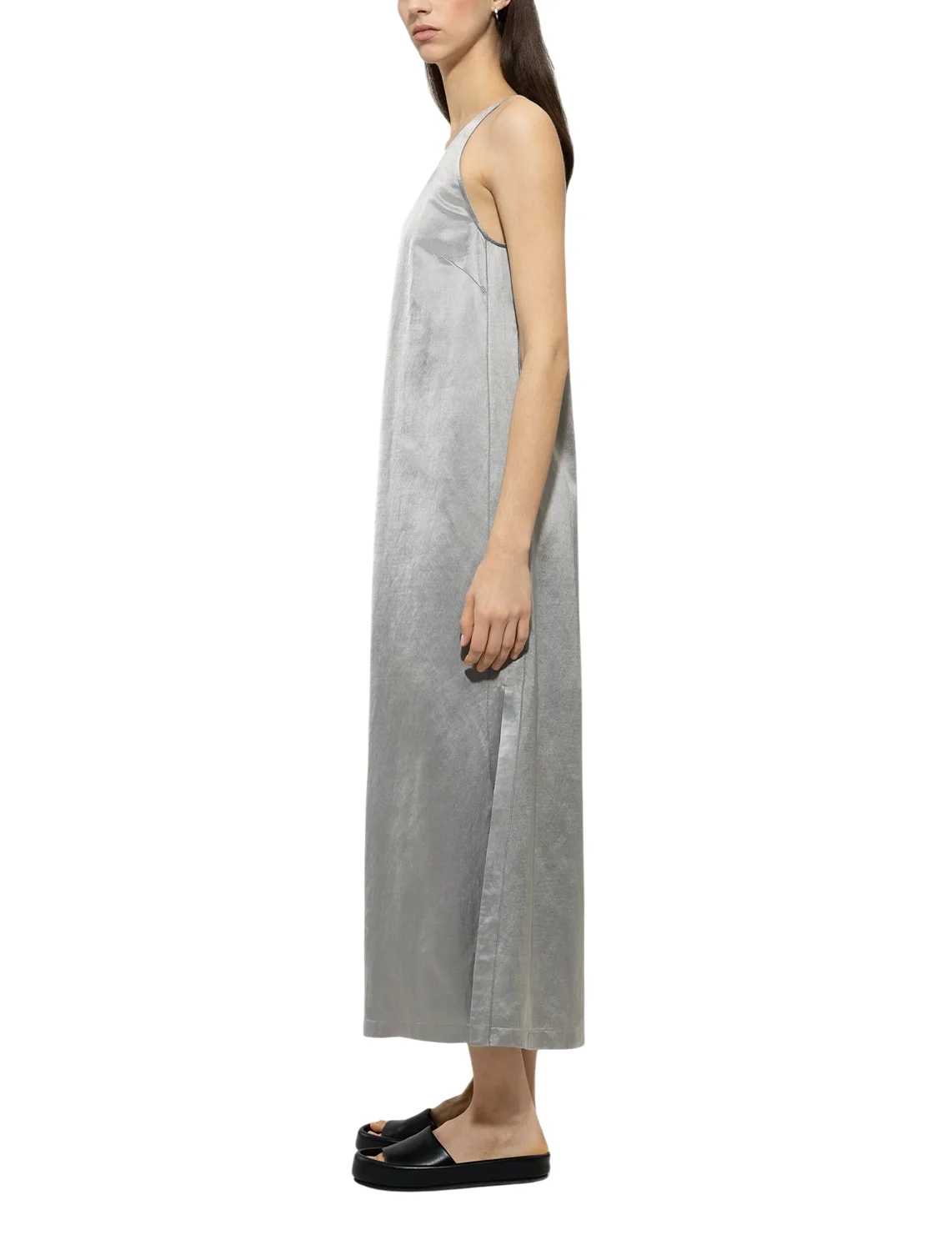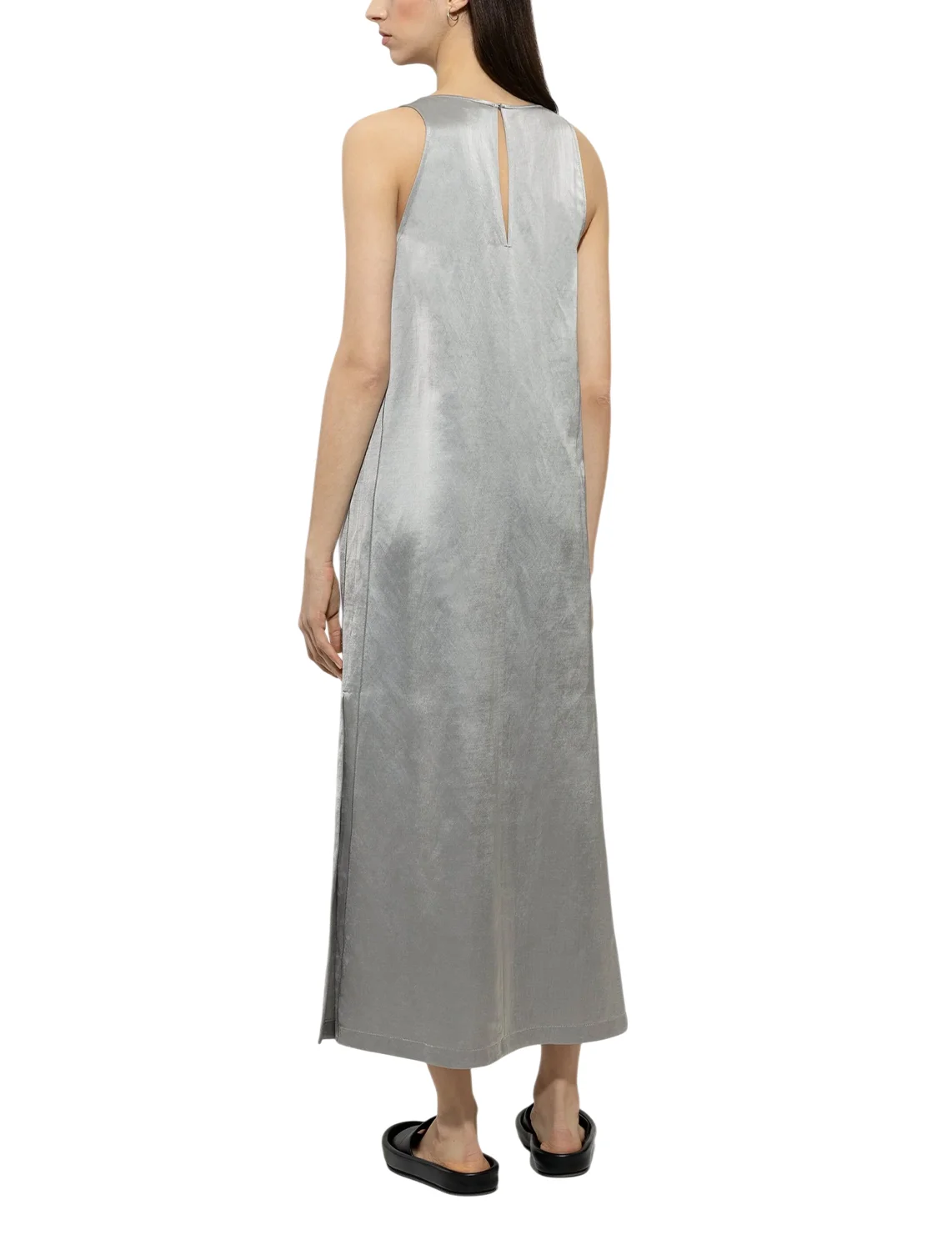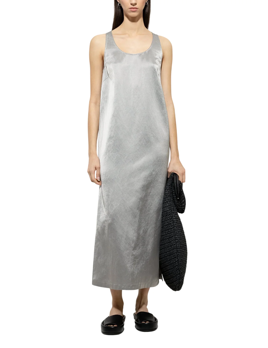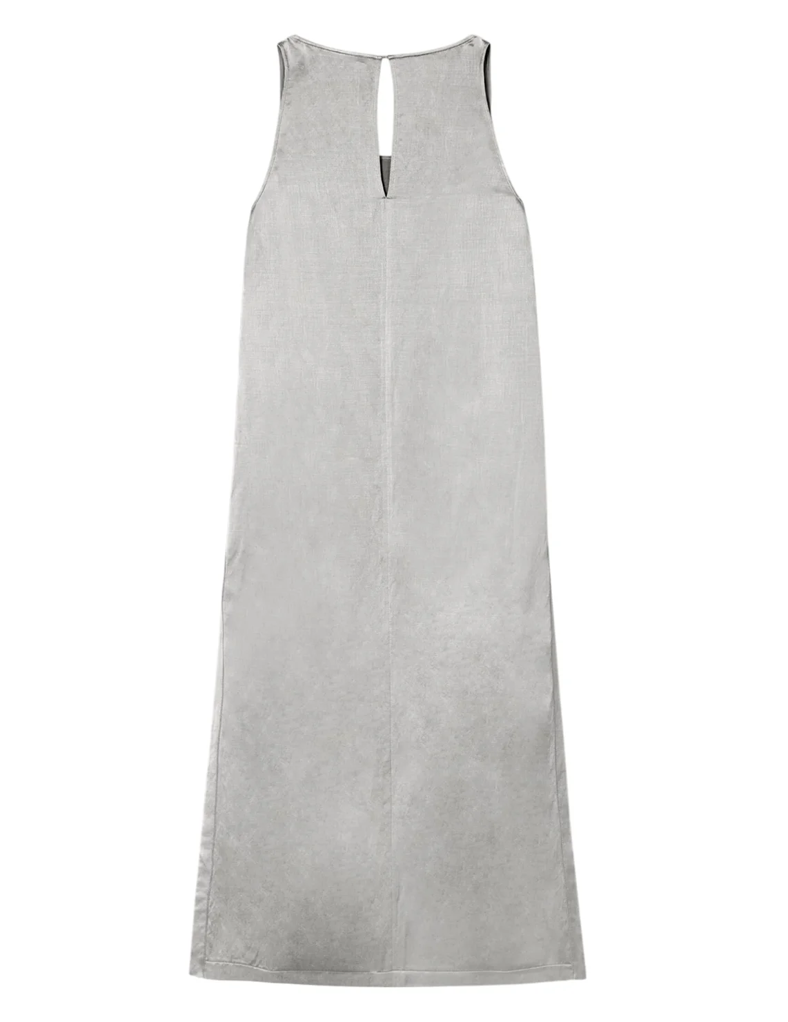 Платье изготовлено из вискозы, хлопка и льна. Модель длины миди выполнена в расклешенном крое. Имеет круглый вырез горловины, застежку на пуговицу сзади и боковые разрезы.