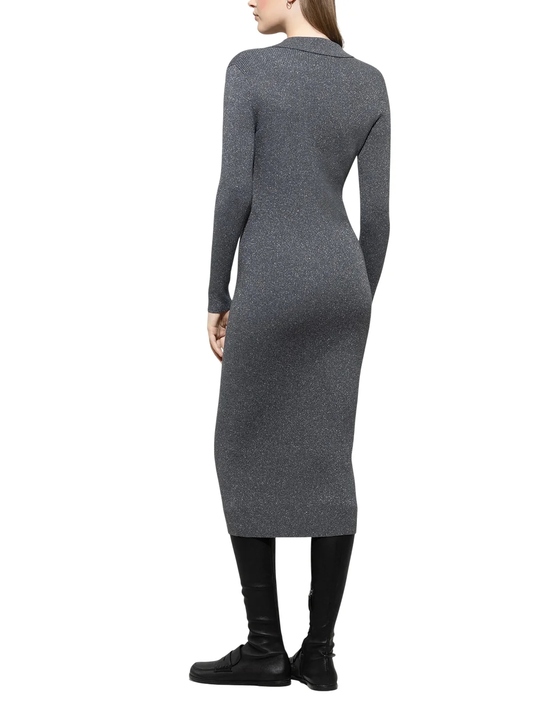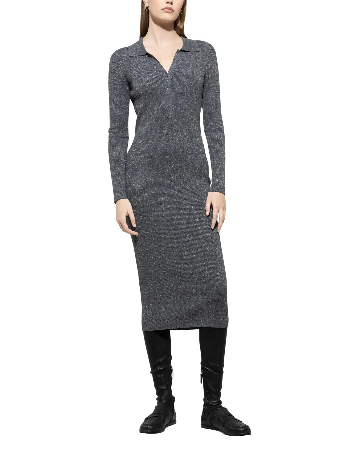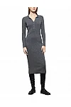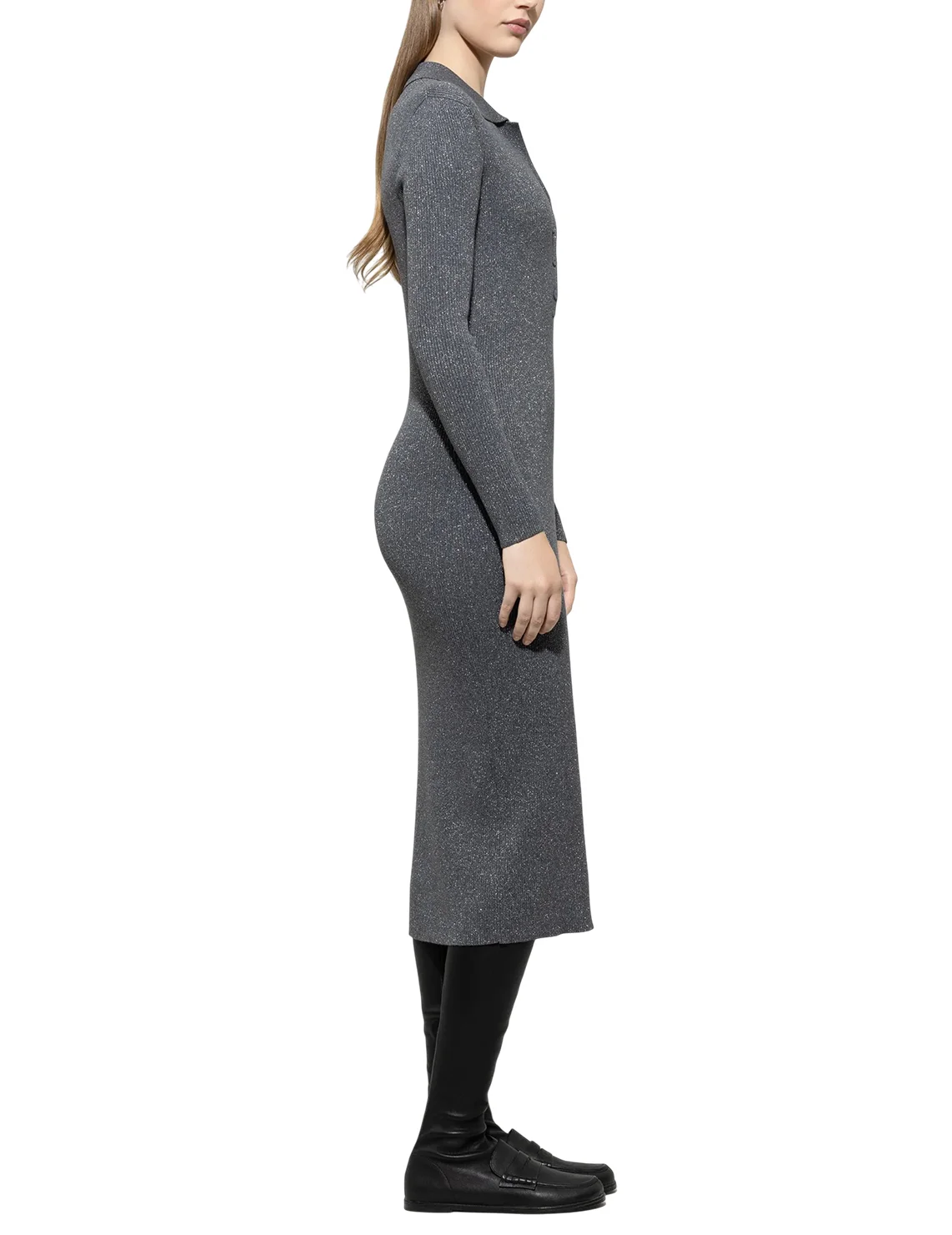 Платье изготовлено из вискозы, полиамида, полиэстера и шерсти. Модель длины миди выполнена в приталенном крое. Имеет отложной воротник, планку с пуговицами и длинные рукава.