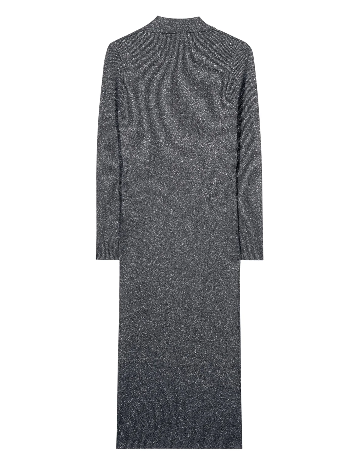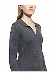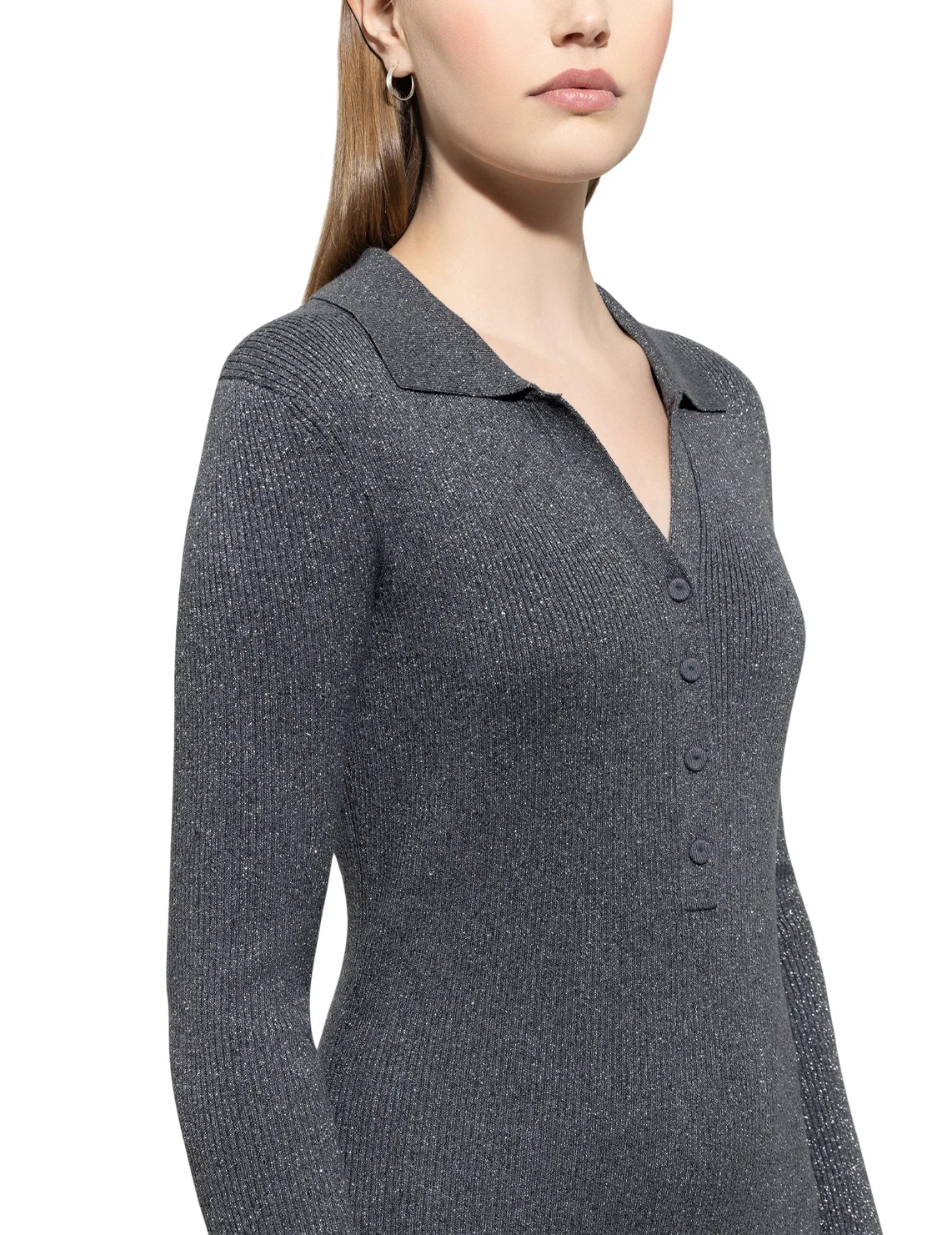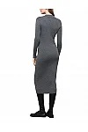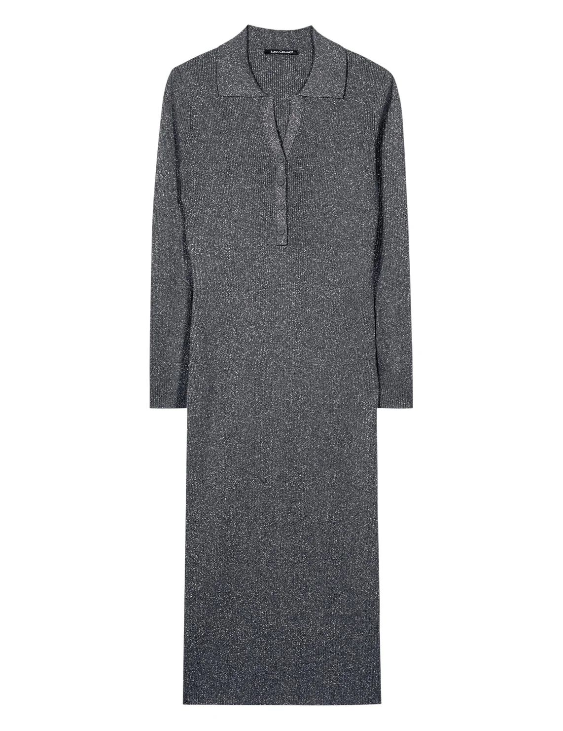 Платье изготовлено из вискозы, полиамида, полиэстера и шерсти. Модель длины миди выполнена в приталенном крое. Имеет отложной воротник, планку с пуговицами и длинные рукава.