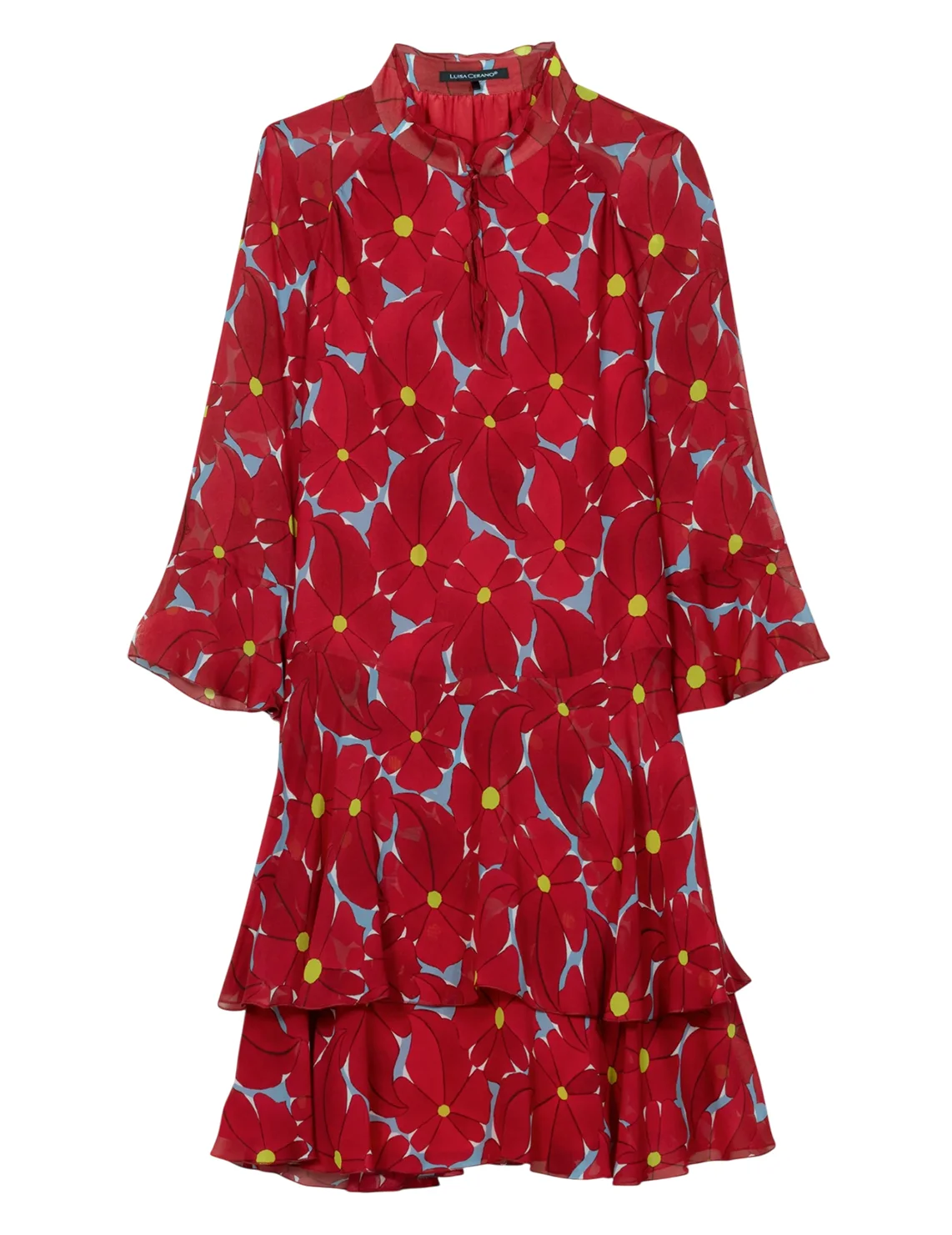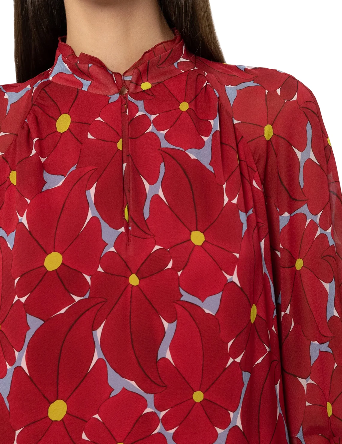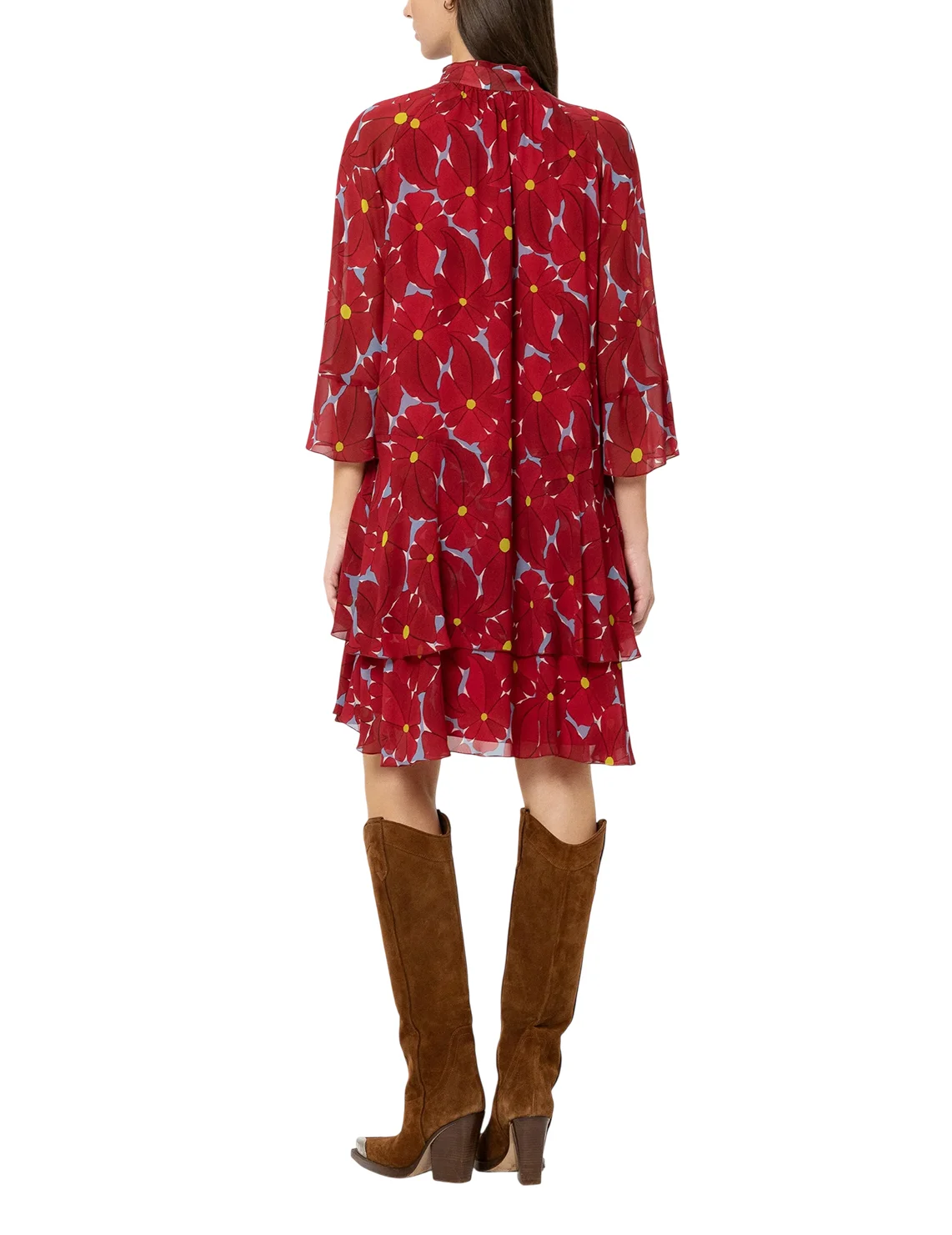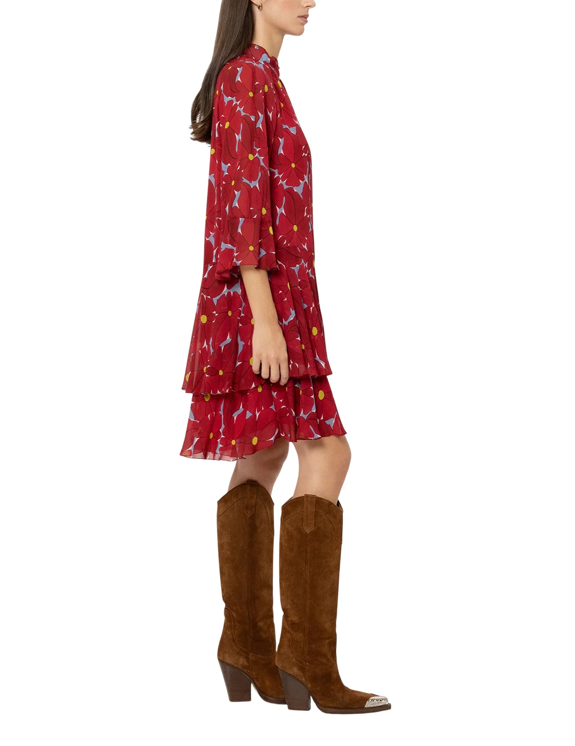 Платье изготовлено из 100% вискозы. Модель длины миди выполнена в расклешенном крое. Имеет воротник-стойку с застежкой на пуговице и рукава длиной 3/4. Декорировано цветочным принтом и оборками.