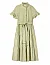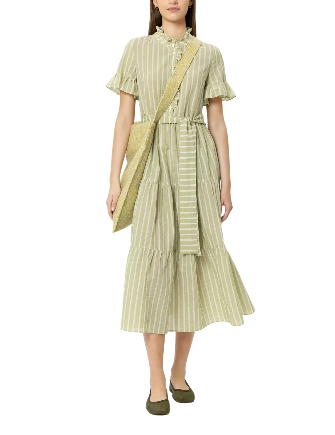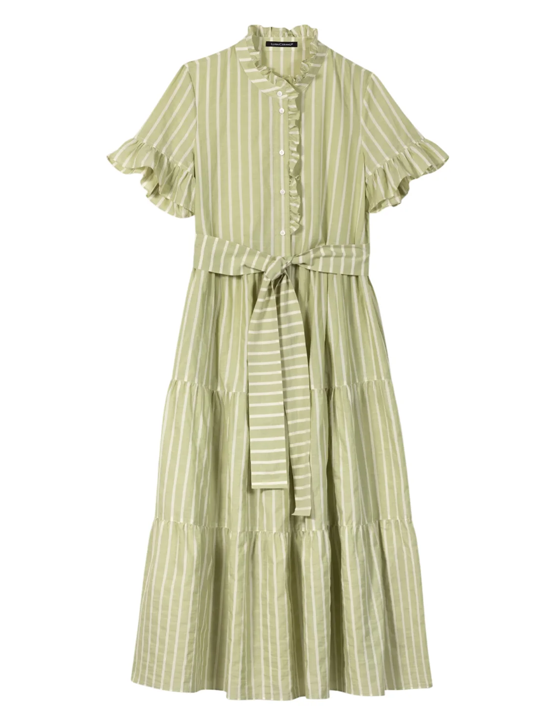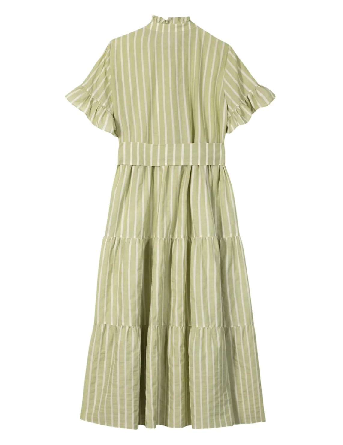 Платье изготовлено из хлопка высокого качества. Модель длины миди выполнена в расклешенном крое. Имеет воротник-стойку с рюшами, скрытую застежку на пуговицах, прорезные карманы, короткие рукава с оборками и пояс в тон. Декорировано принтом в полоску.