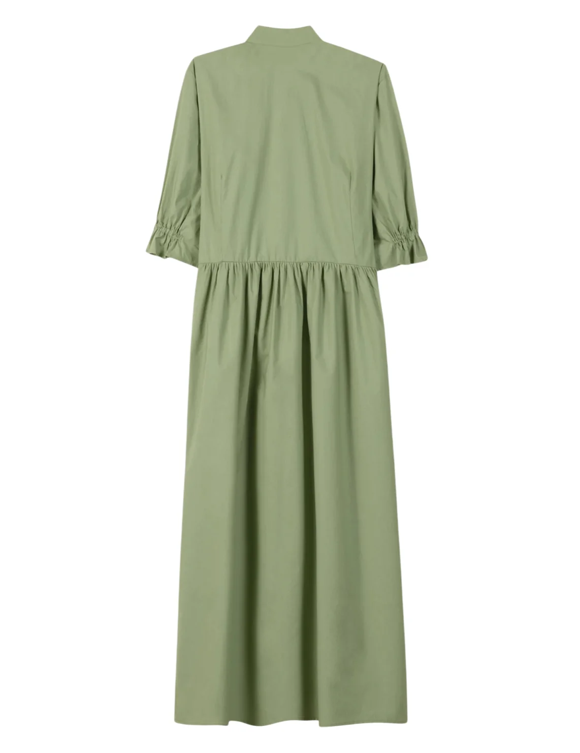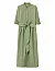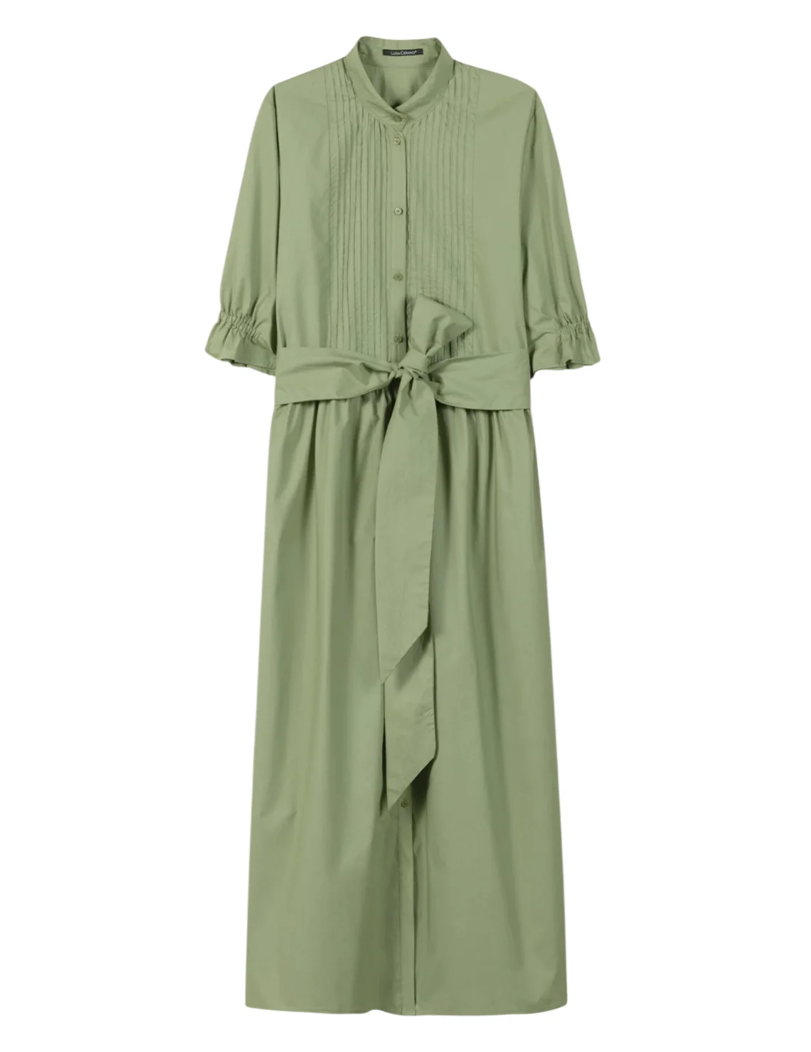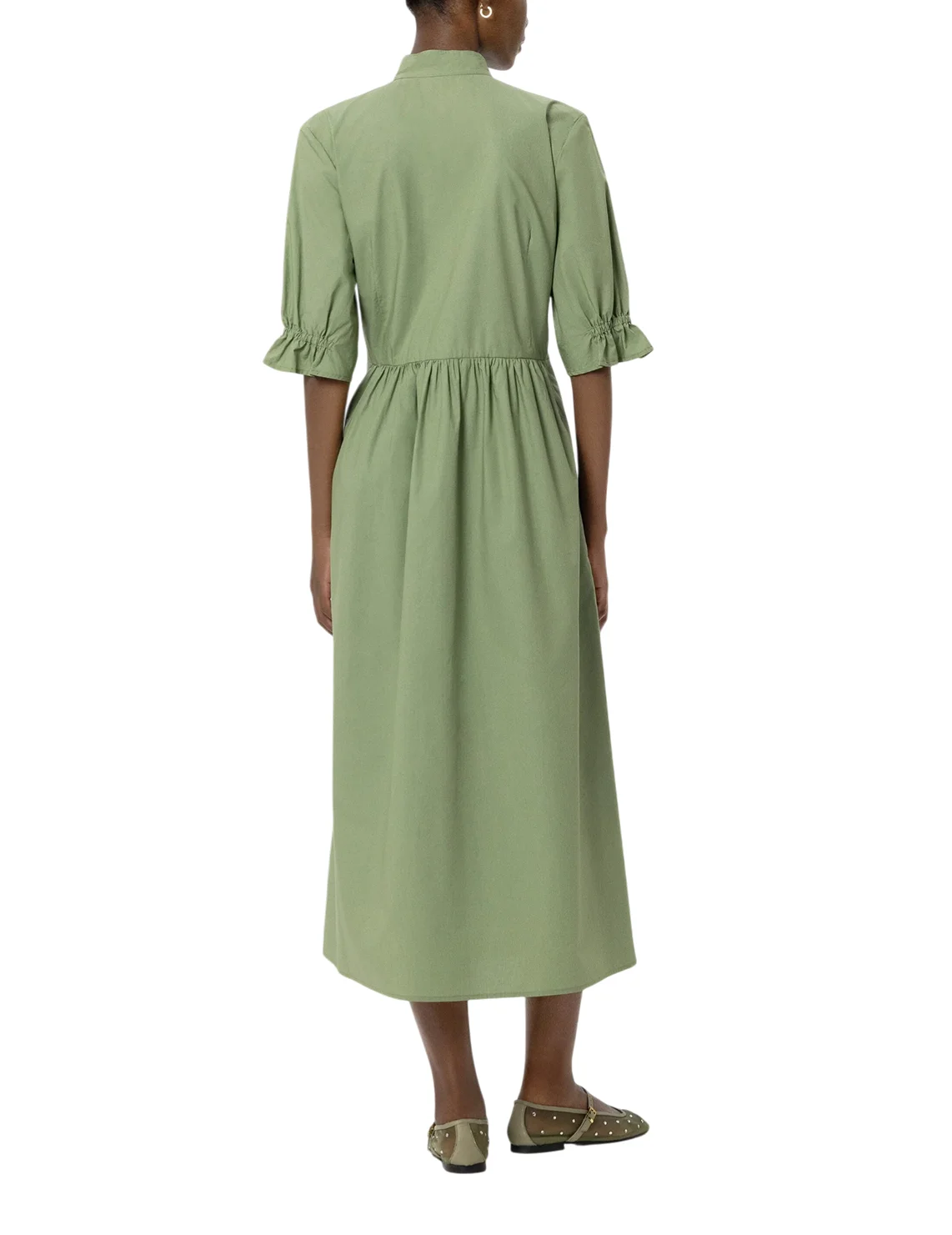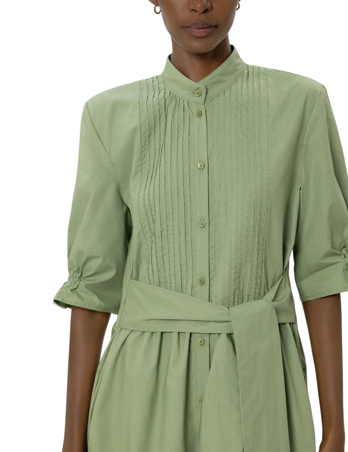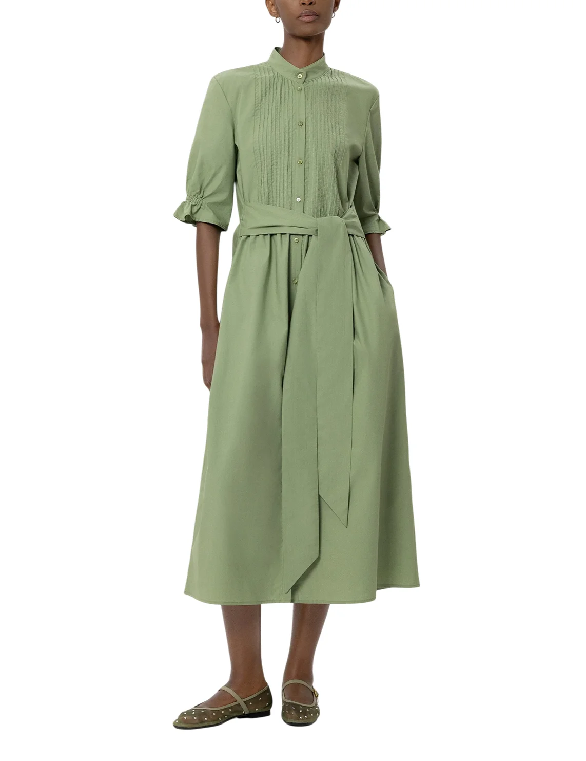 Платье изготовлено из хлопка высокого качества. Модель длины миди выполнена в расклешенном крое. Имеет воротник-стойку, застежку на пуговицах, прорезные карманы, короткие рукава с оборками и манжетами, а также пояс в тон. Декорировано плиссировкой на груди.