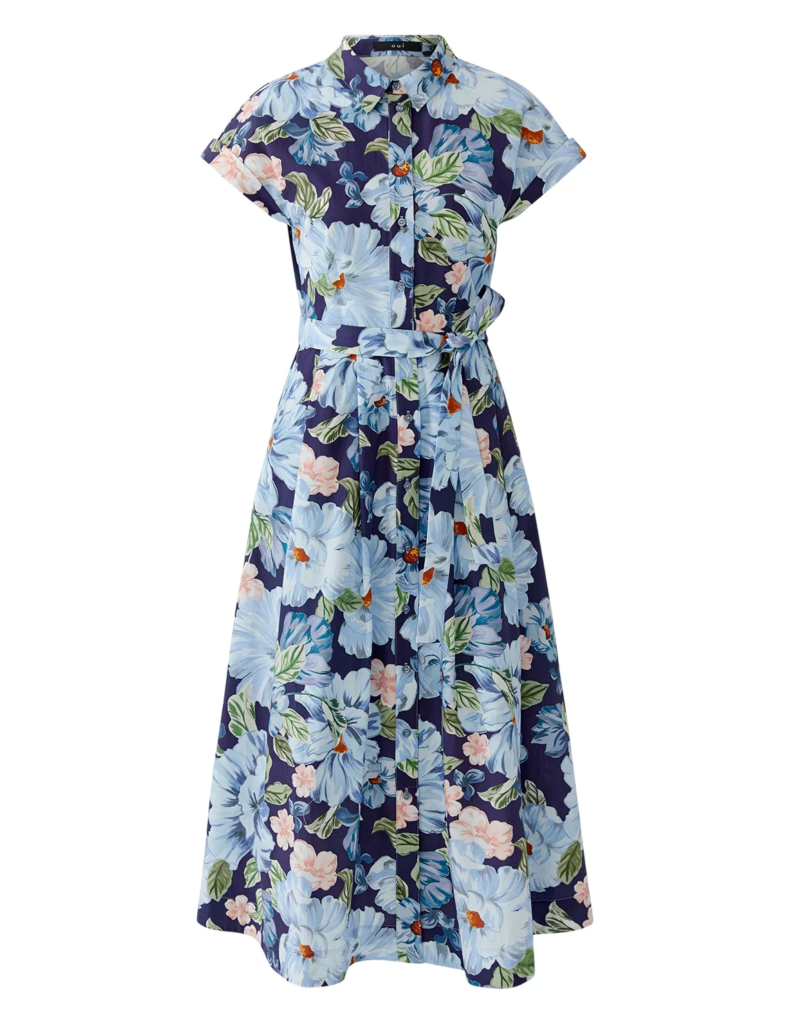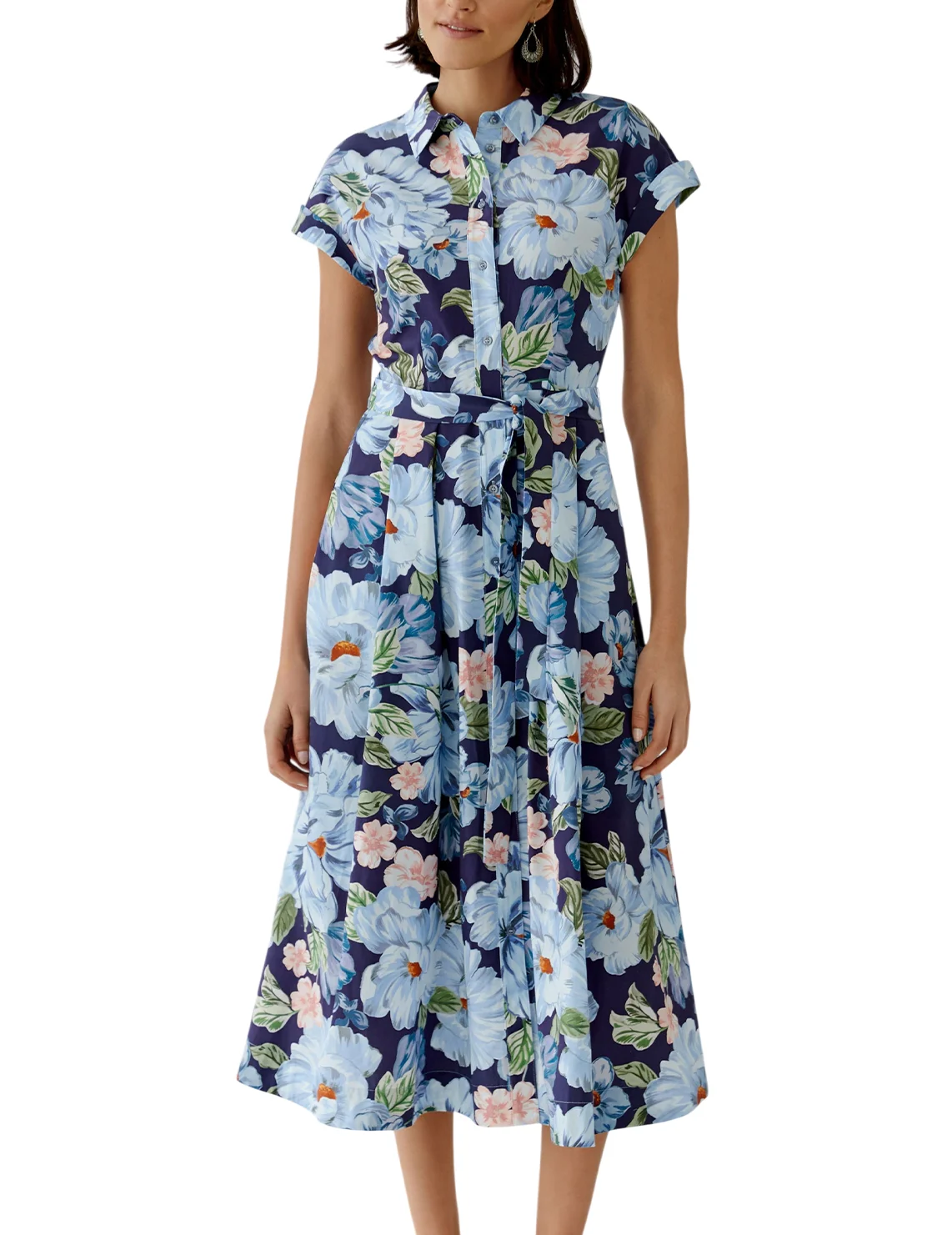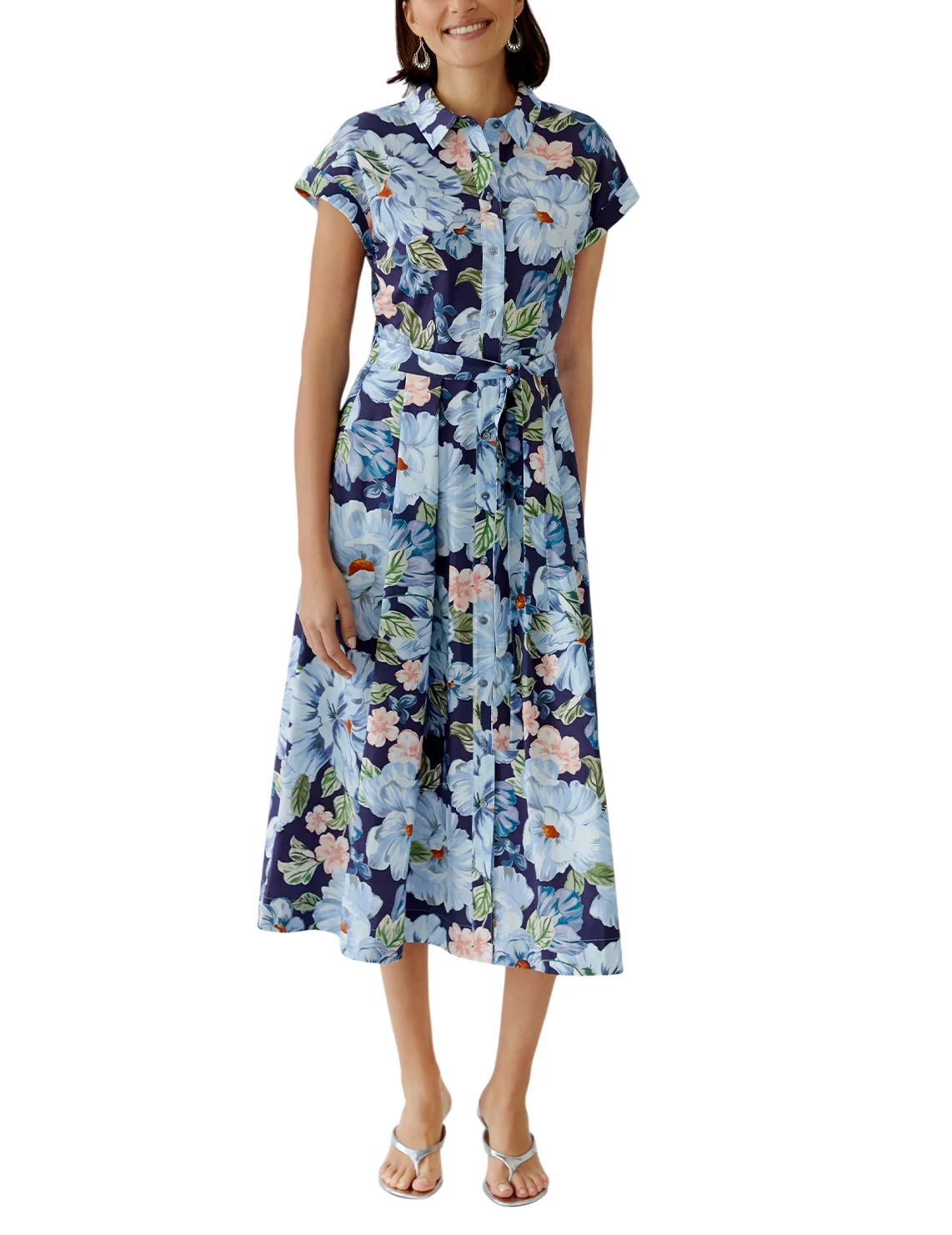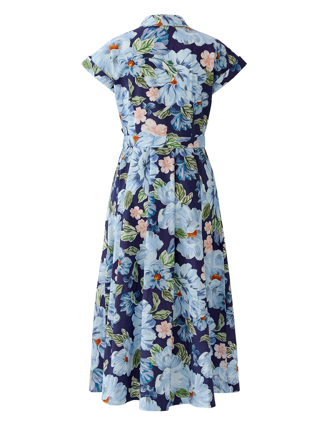 Платье изготовлено из 100% хлопка высокого качества. Модель длины миди выполнена в расклешенном крое. Имеет отложной воротник, планку на пуговицах, пояс в тон и короткие рукава с отворотами. Декорировано цветочным принтом.