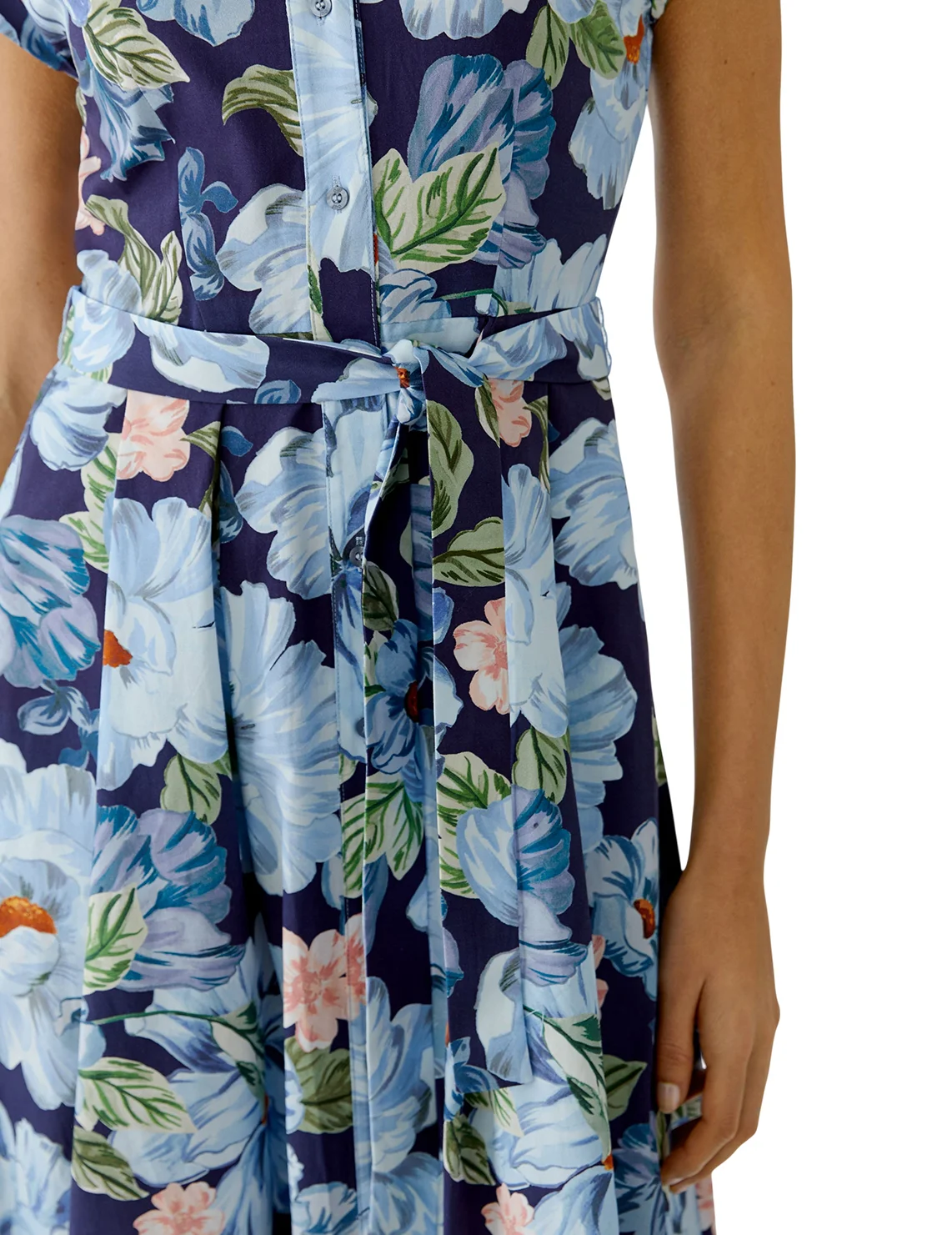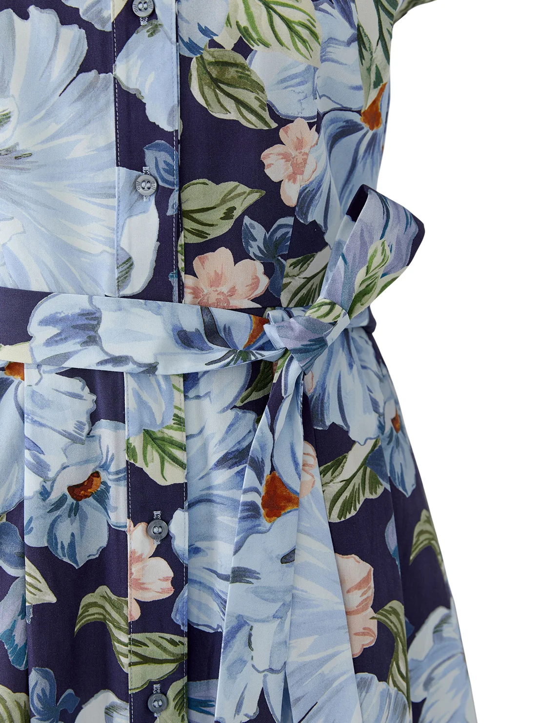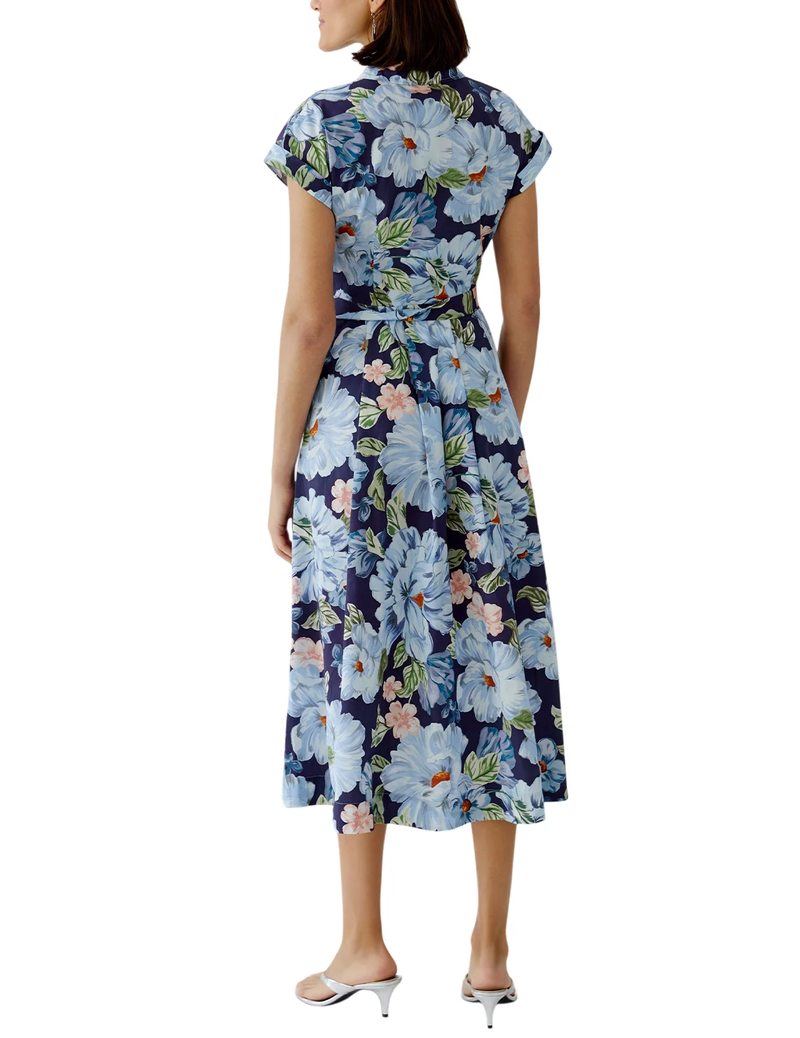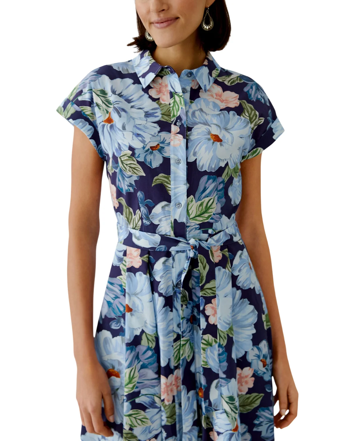 Платье изготовлено из 100% хлопка высокого качества. Модель длины миди выполнена в расклешенном крое. Имеет отложной воротник, планку на пуговицах, пояс в тон и короткие рукава с отворотами. Декорировано цветочным принтом.