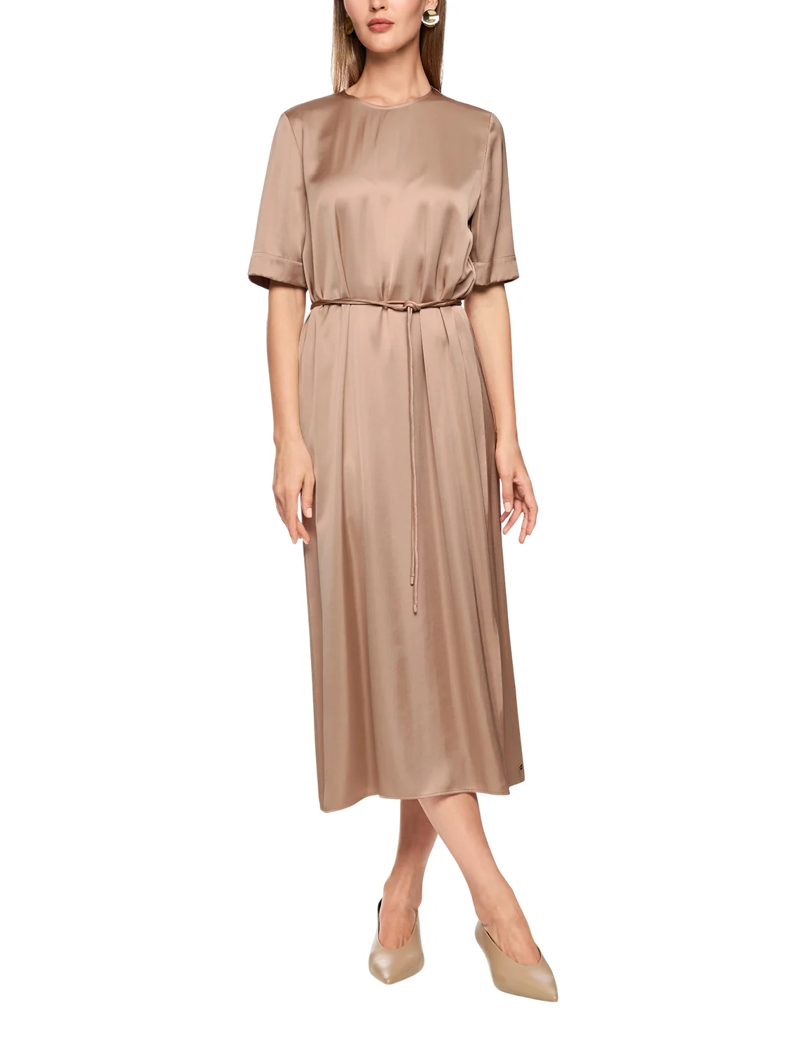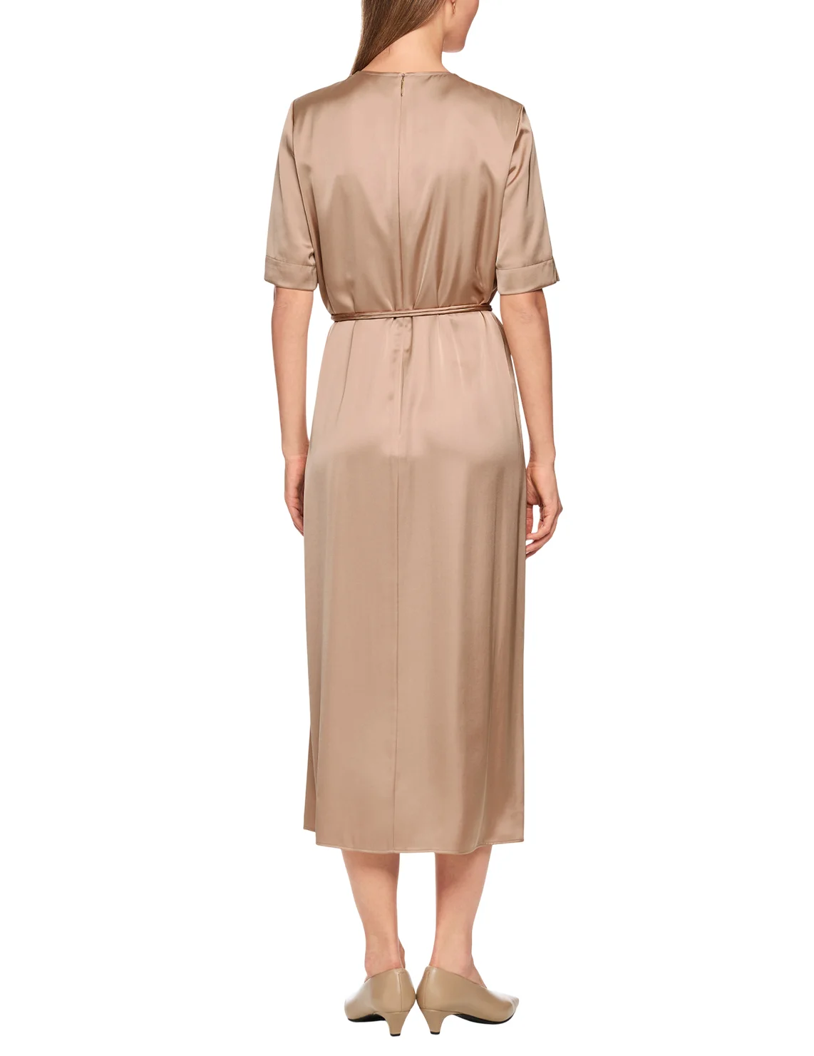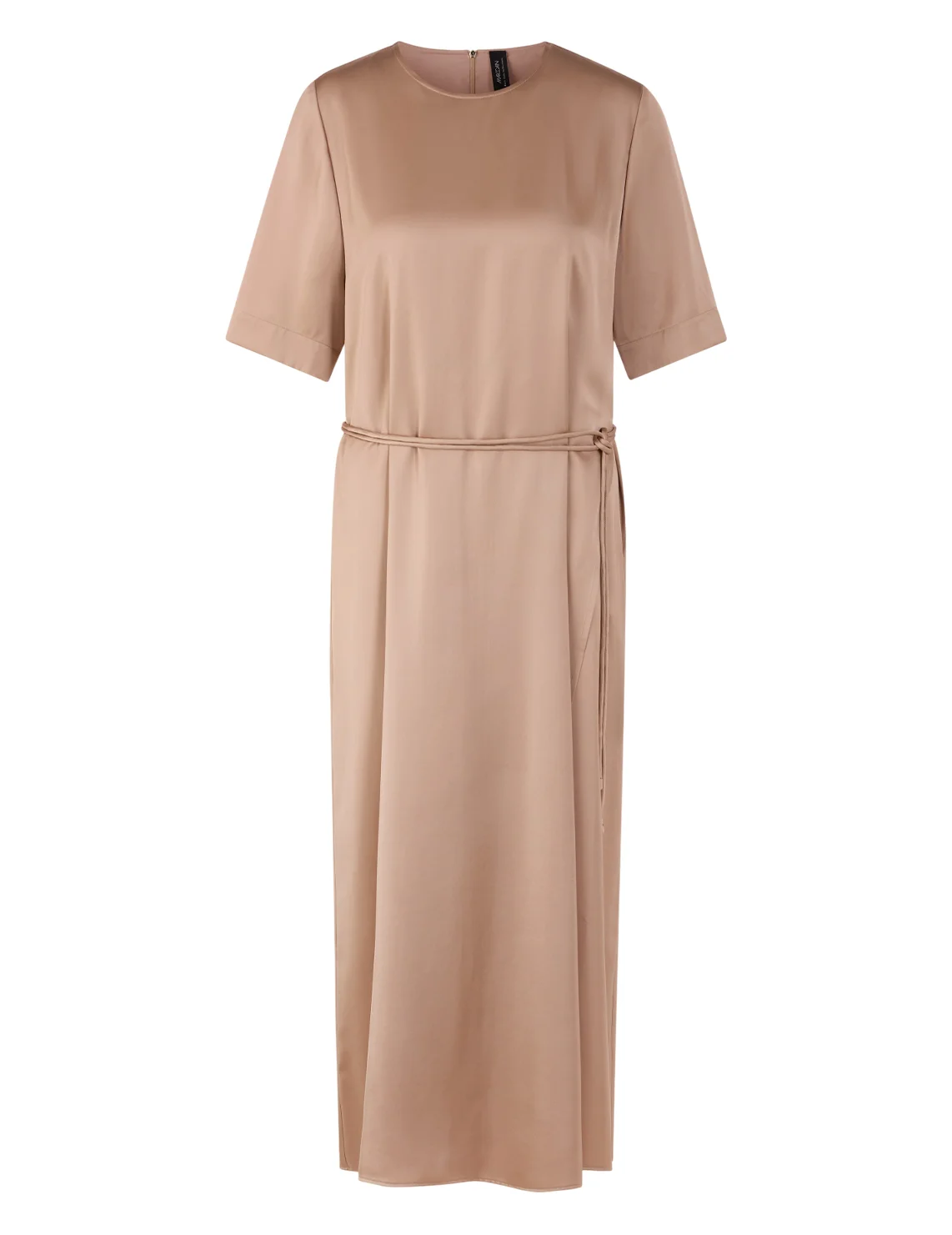 Платье изготовлено из вискозы и полиэстера, подкладка из полиэстера. Модель длины миди выполнена в расклешенном крое. Имеет круглый вырез горловины, застежку на молнии сзади, пояс в виде шнурка и короткие рукава с разрезами на манжетах.