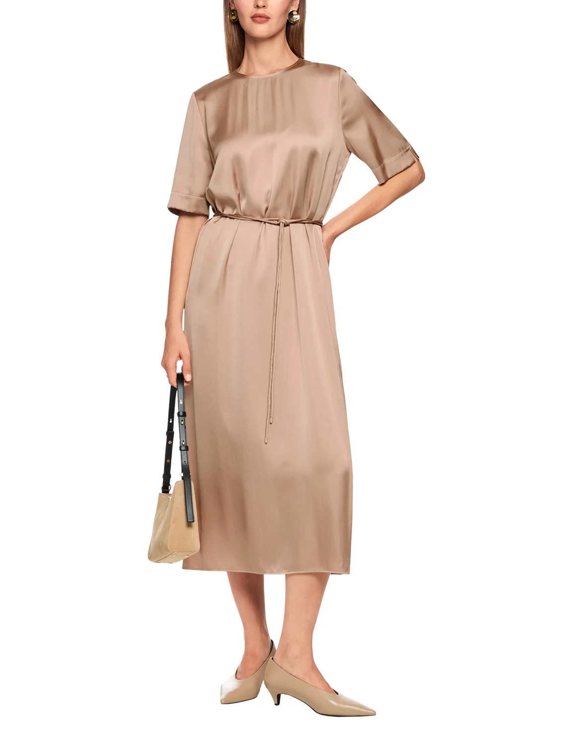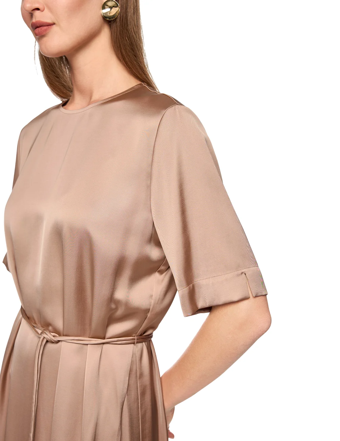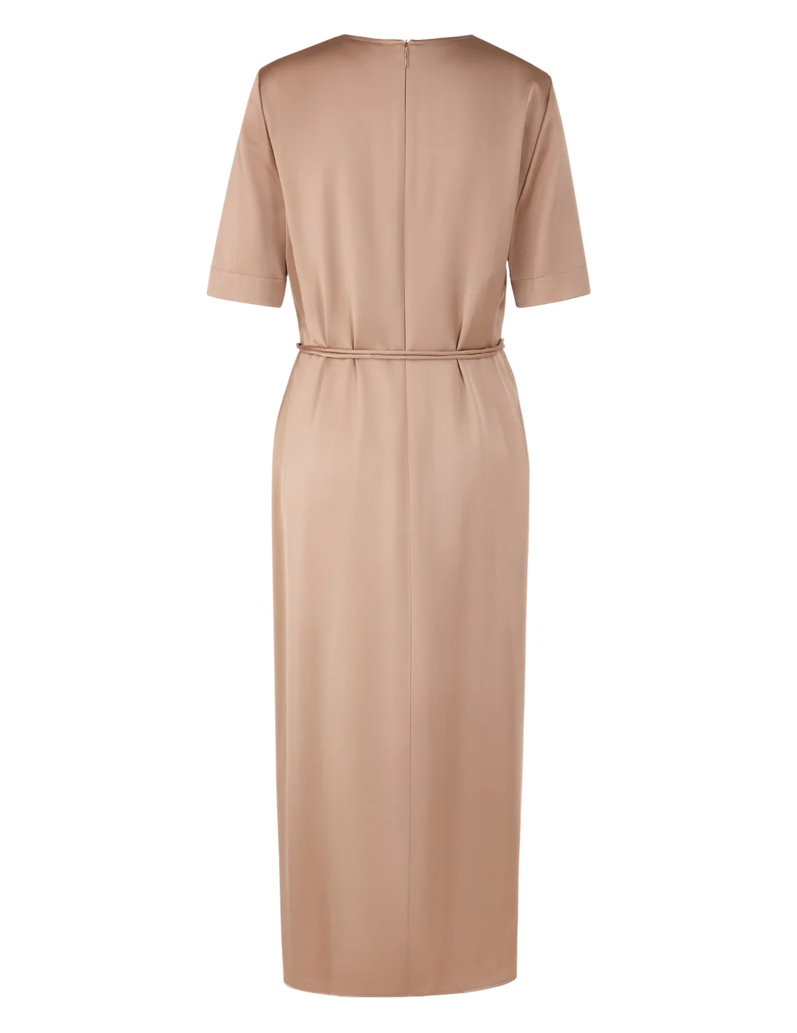 Платье изготовлено из вискозы и полиэстера, подкладка из полиэстера. Модель длины миди выполнена в расклешенном крое. Имеет круглый вырез горловины, застежку на молнии сзади, пояс в виде шнурка и короткие рукава с разрезами на манжетах.