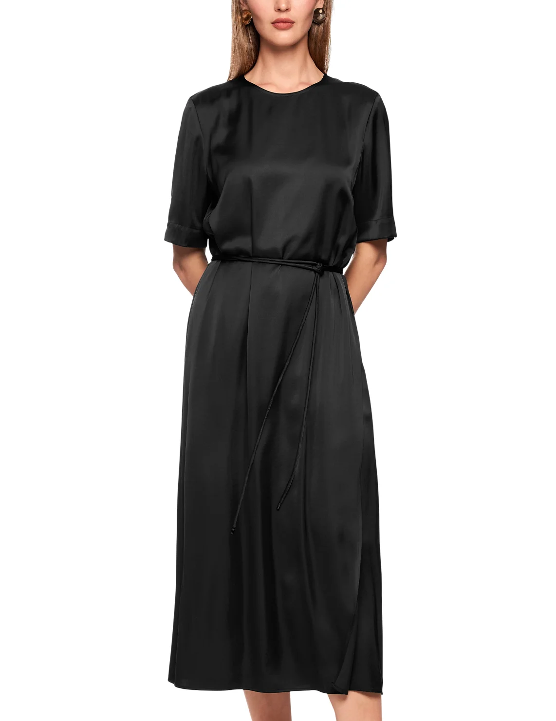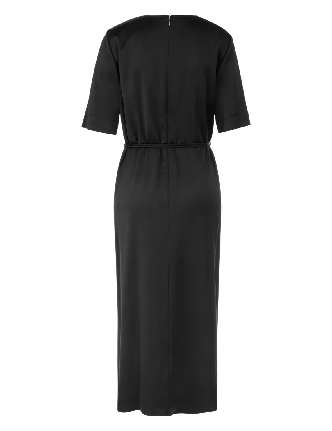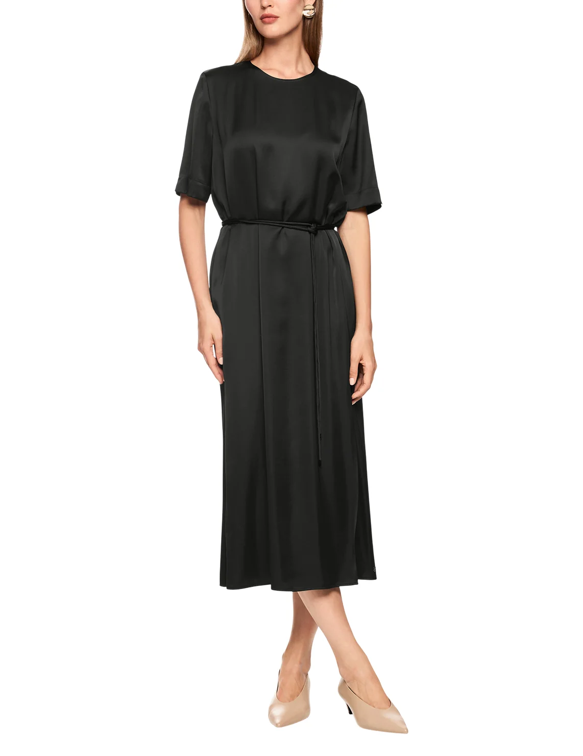 Платье изготовлено из вискозы и полиэстера, подкладка из полиэстера. Модель длины миди выполнена в расклешенном крое. Имеет круглый вырез горловины, застежку на молнии сзади, пояс в виде шнурка и короткие рукава с разрезами на манжетах.