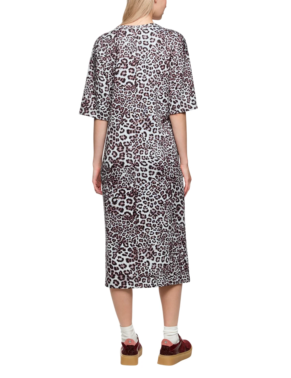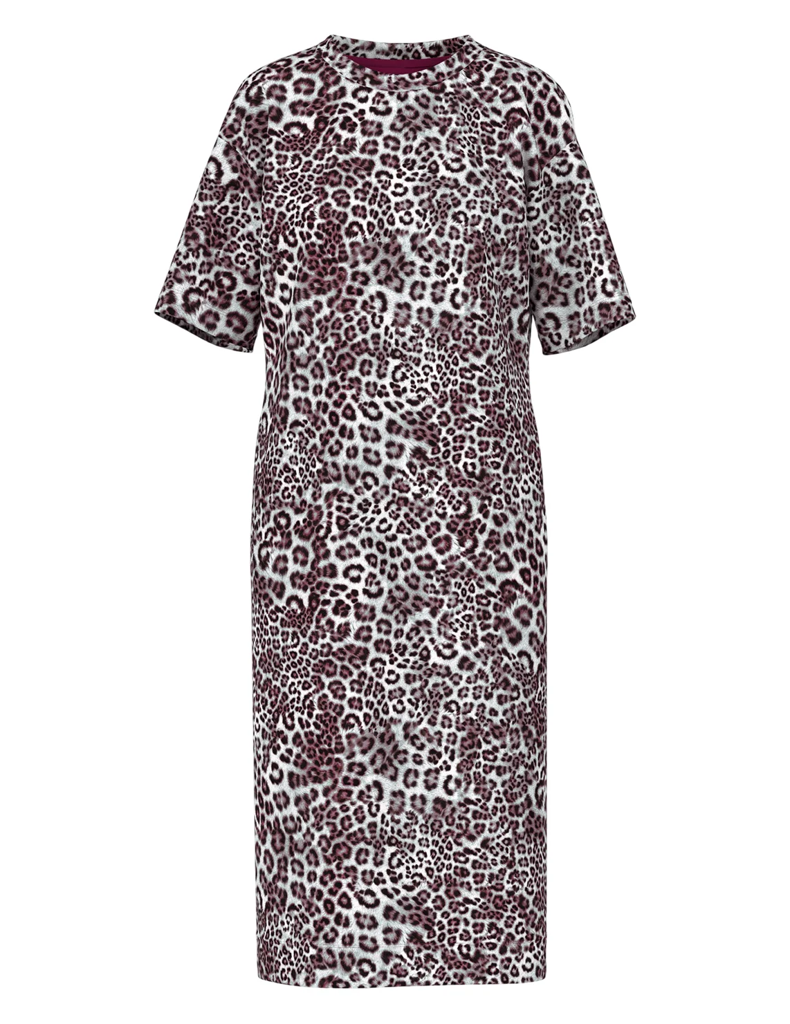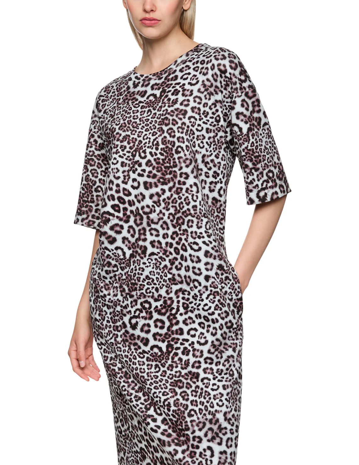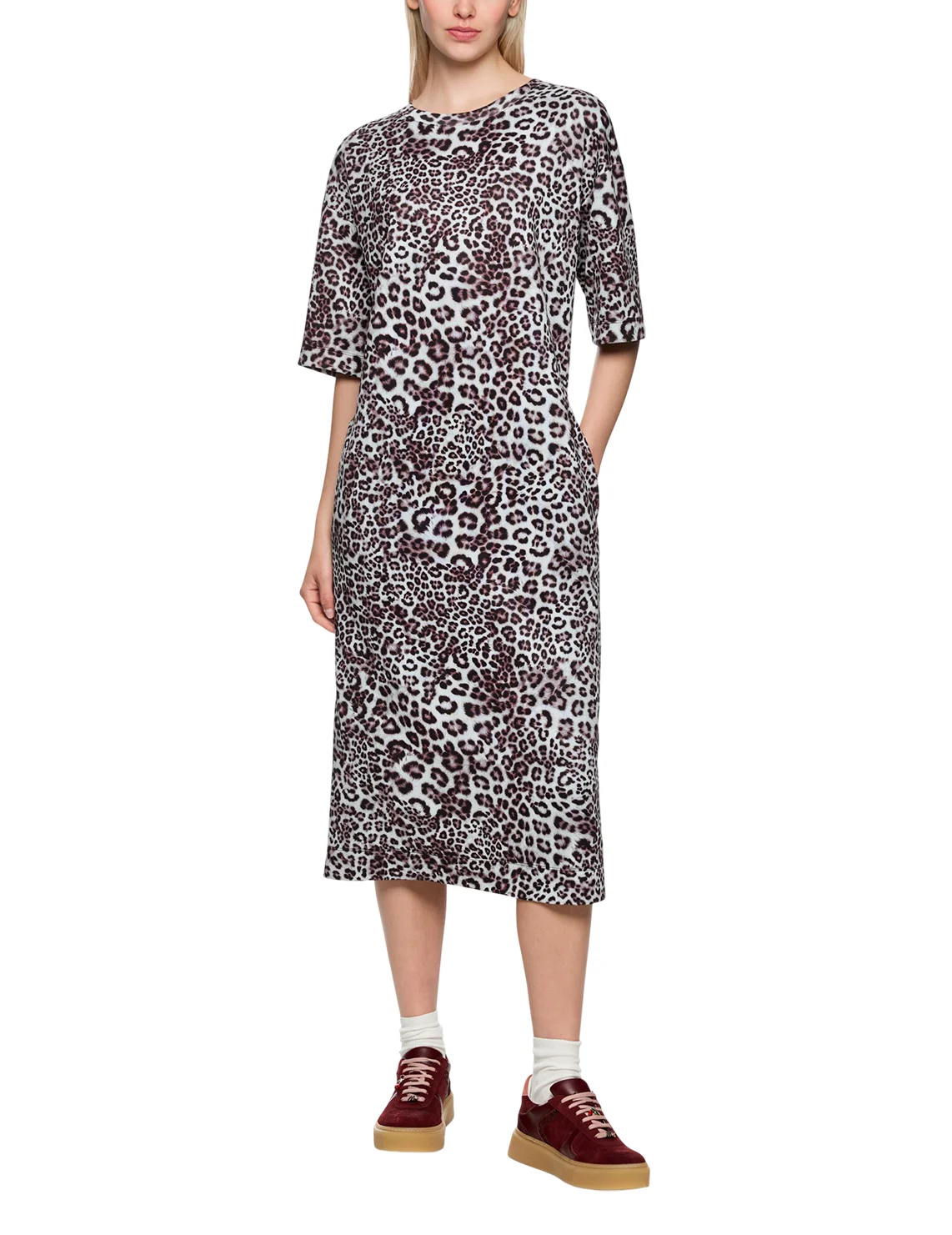 Платье изготовлено из полиэстера, вискозы и эластана. Модель длины миди выполнена в свободном крое. Имеет круглый вырез горловины, прорезные карманы и рукава длиной 3/4. Декорировано анималистичным принтом.