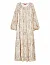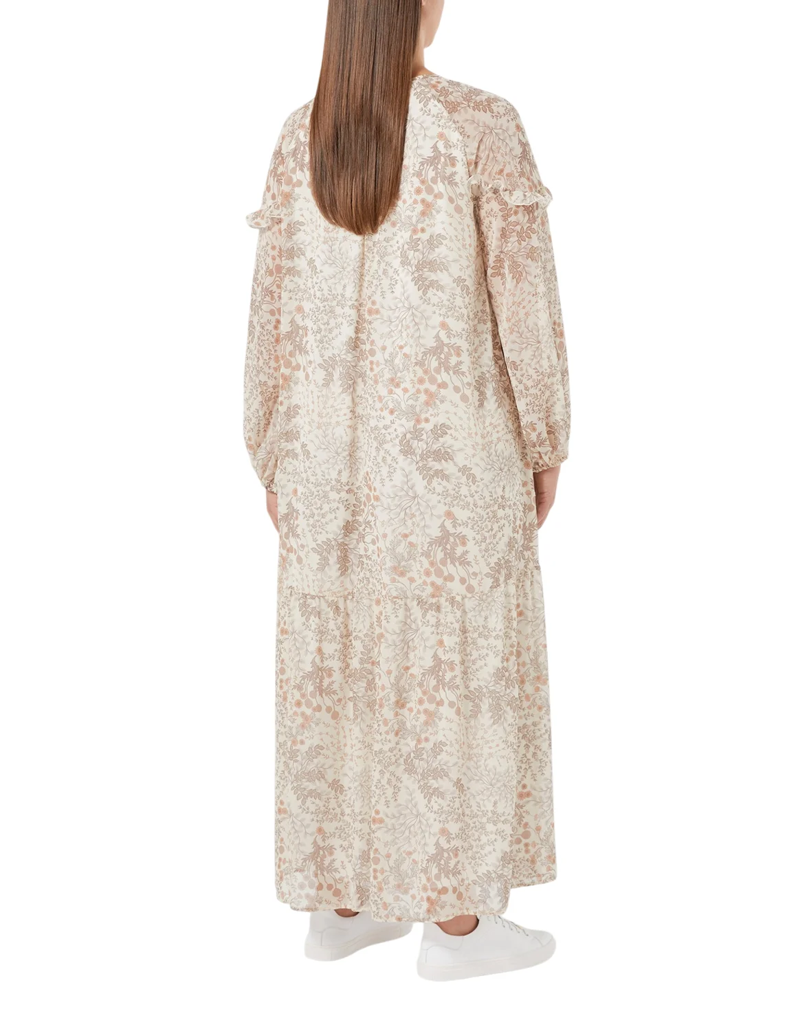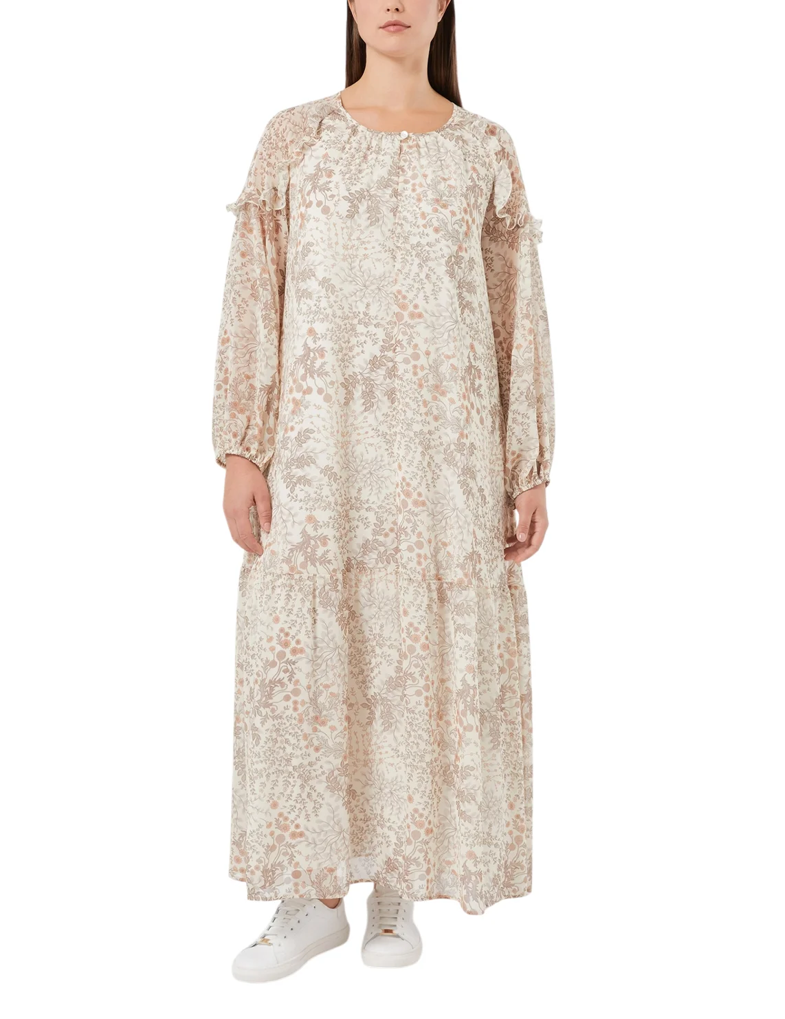 Платье изготовлено из 100% полиэстера высокого качества. Модель длины макси выполнена в расклешенном крое. Имеет круглый вырез горловины с застежкой на пуговицу и длинные рукава с манжетами. Декорировано цветочным принтом и воланами.