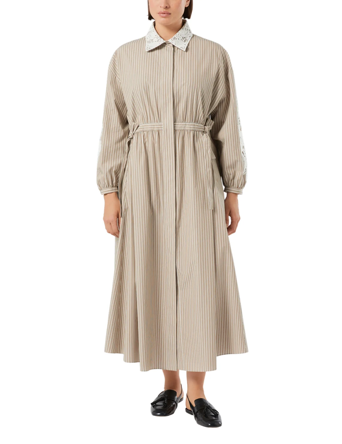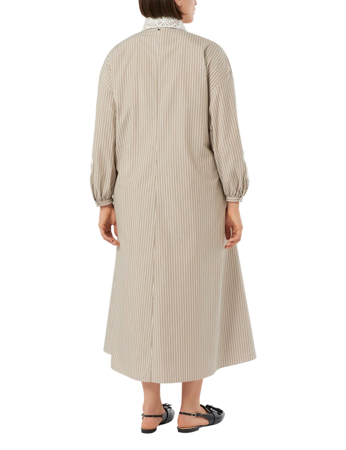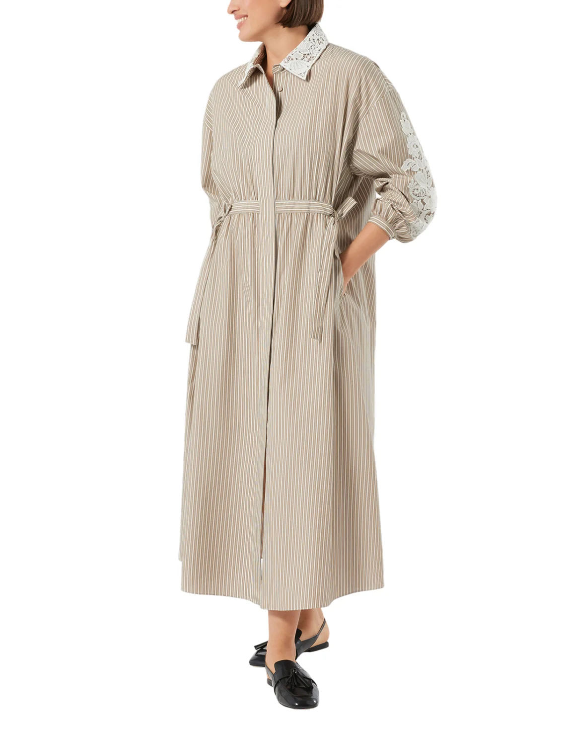 Платье изготовлено из хлопка высокого качества. Модель длины миди выполнена в расклешенном крое. Имеет отложной воротник, скрытую планку с пуговицами, прорезные карманы, завязки и длинные рукава с манжетами. Декорировано цветочной вышивкой и принтом в полоску.