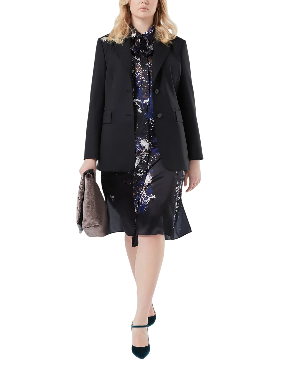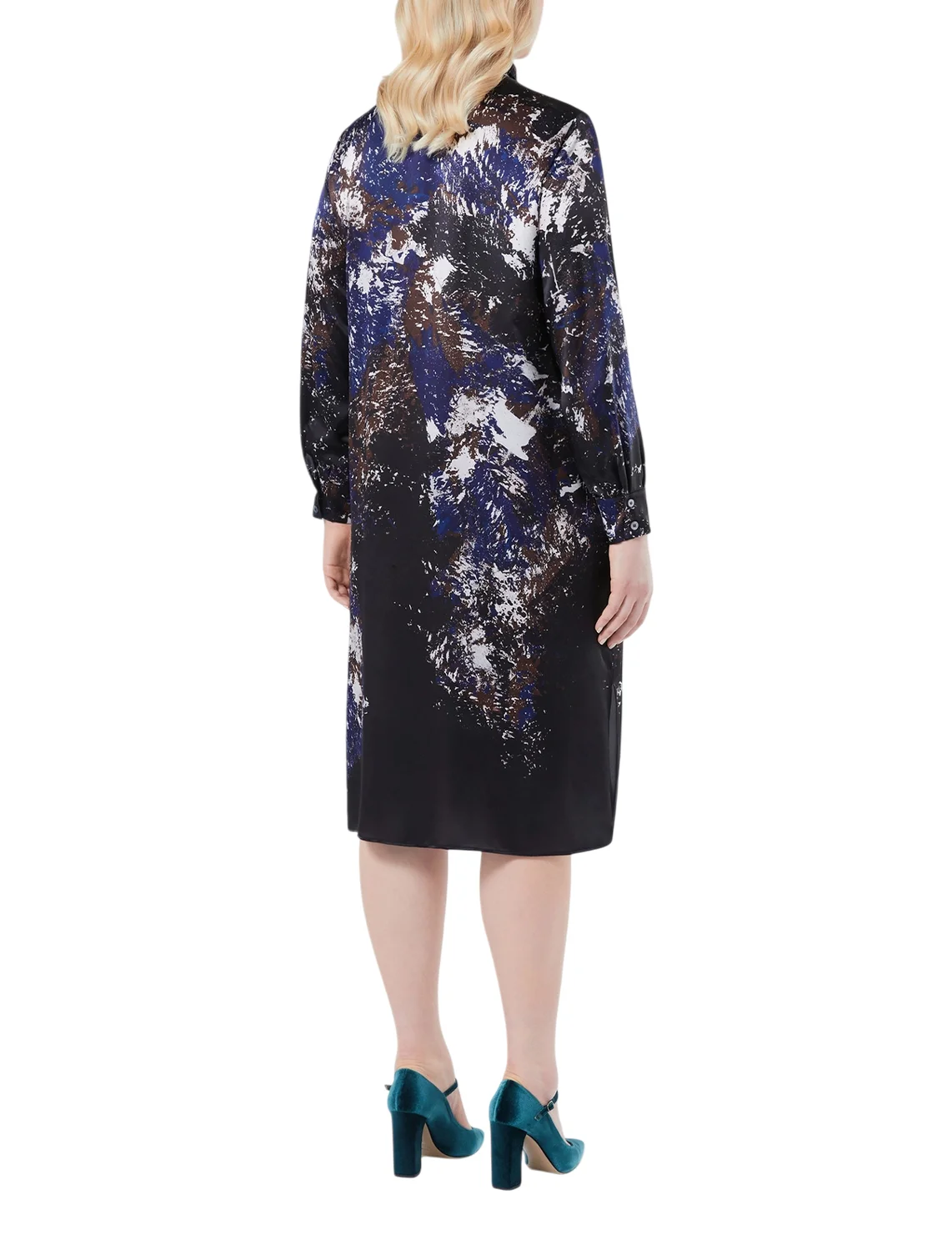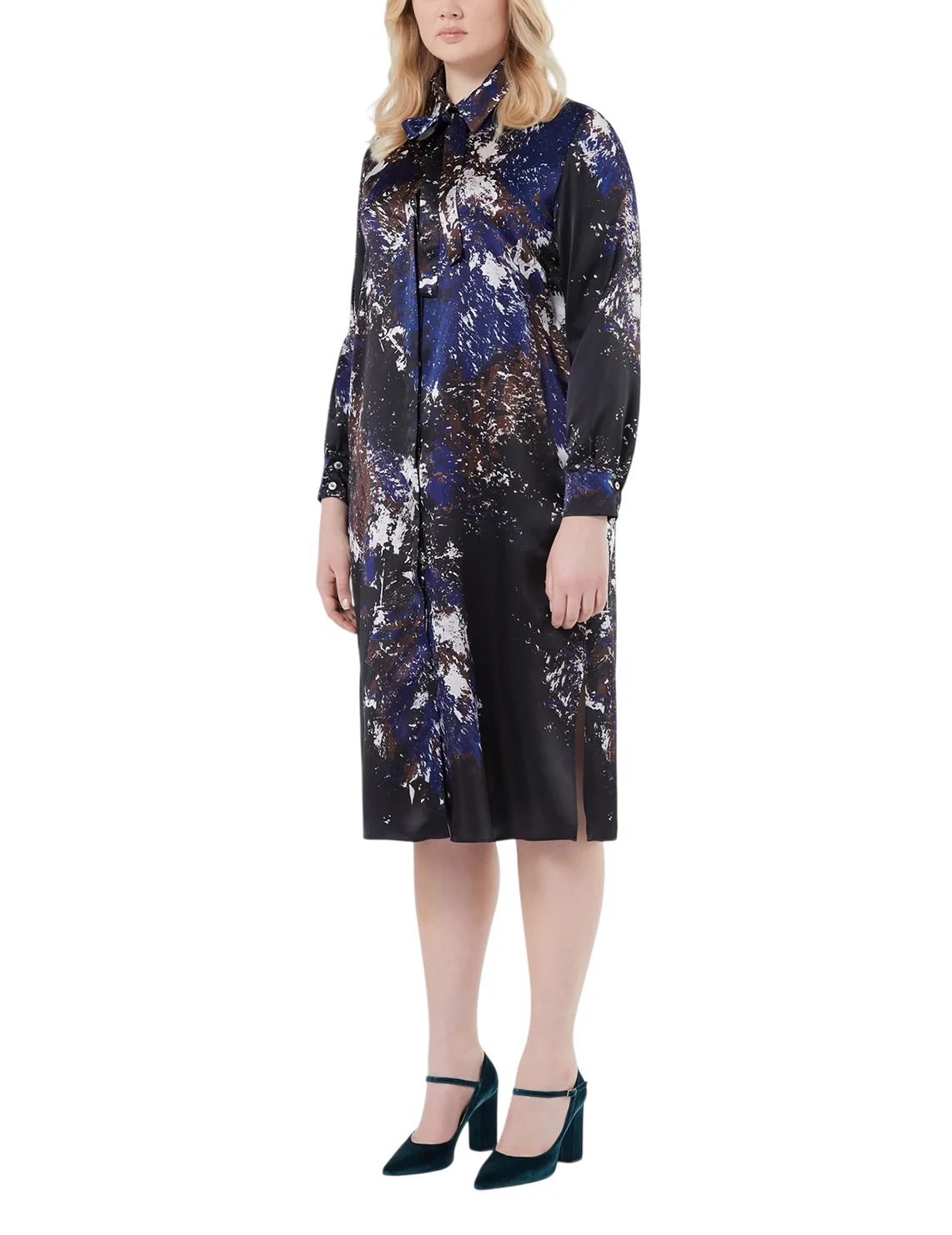 Платье изготовлено из 100% шелка высокого качества. Модель длины миди выполнена в прямом крое. Имеет отложной воротник, скрытую планку с пуговицами, боковые разрезы и длинные рукава с манжетами. Декорировано оригинальным принтом.