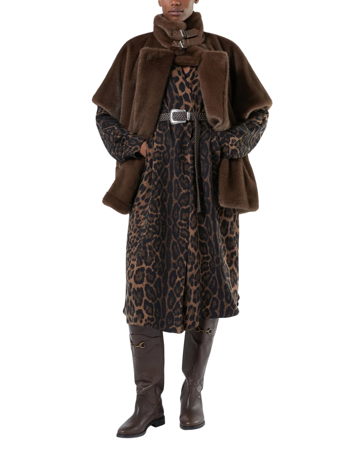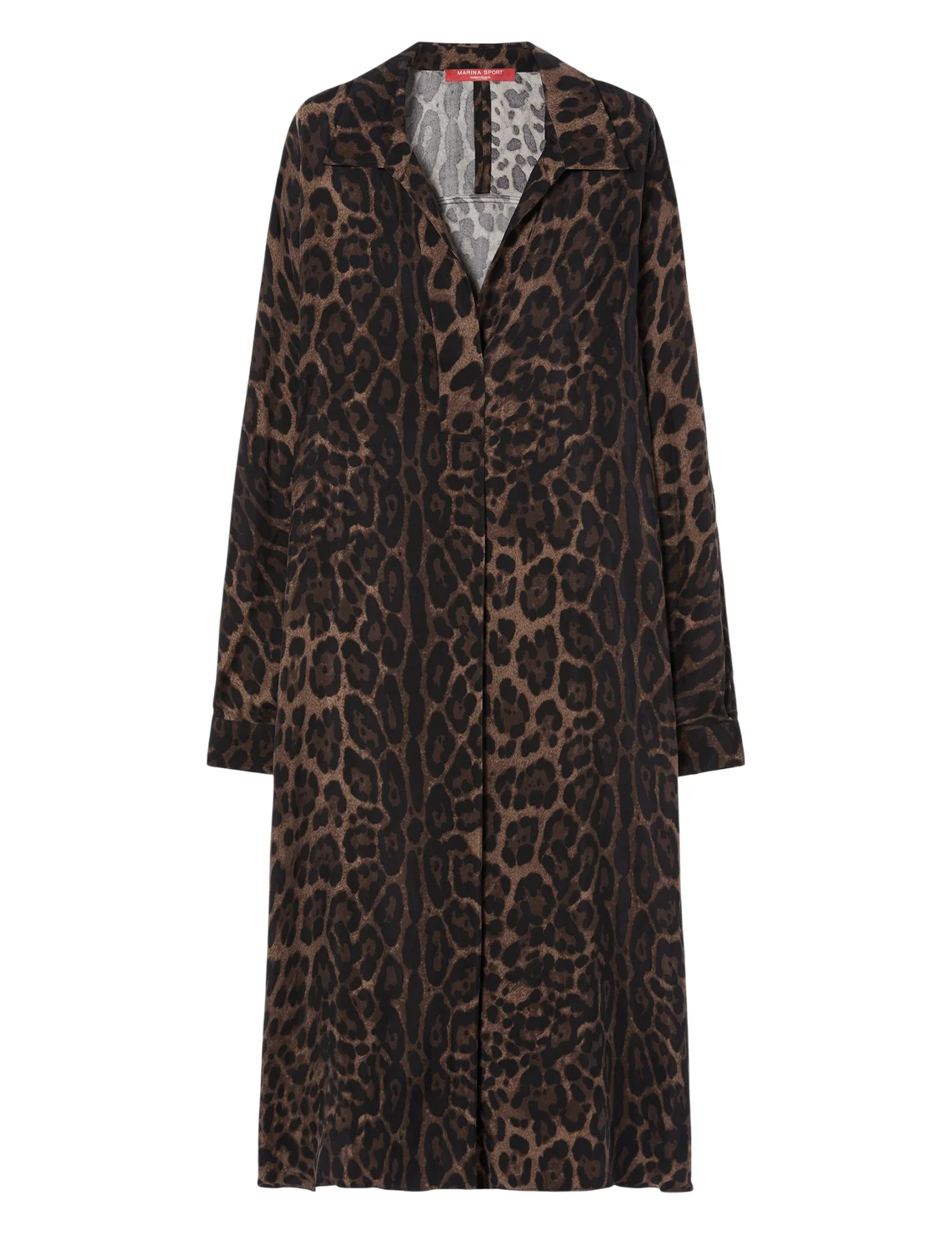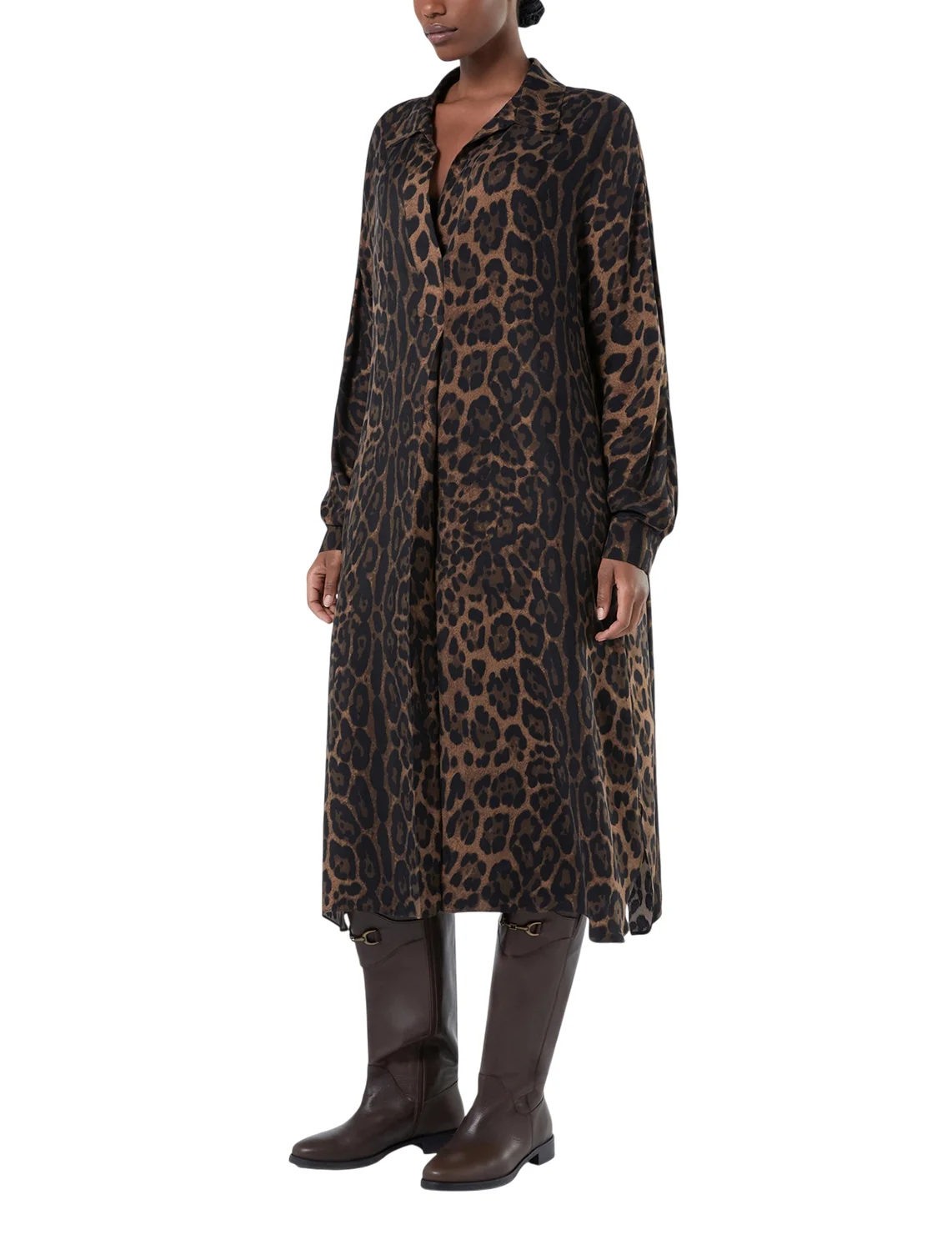 Платье изготовлено из 100% купро высокого качества. Модель длины миди выполнена в расклешенном крое. Имеет отложной воротник с лацканами, боковые разрезы, прорезные карманы и длинные рукава с манжетами. Декорировано анималистичным принтом.