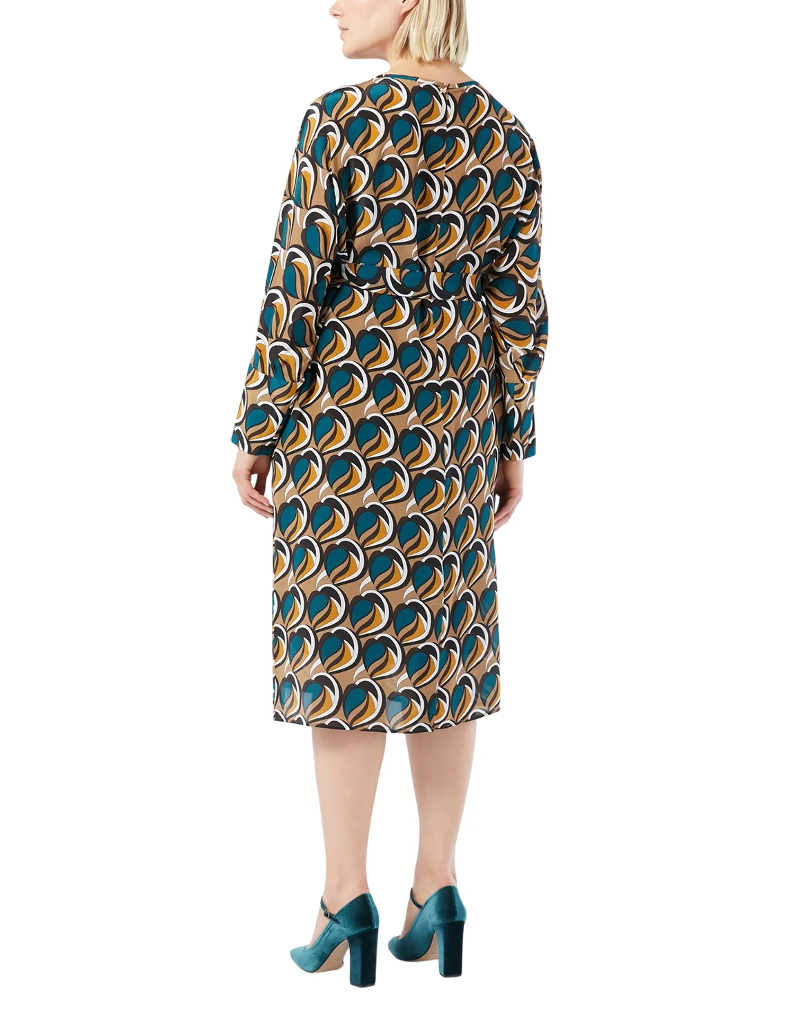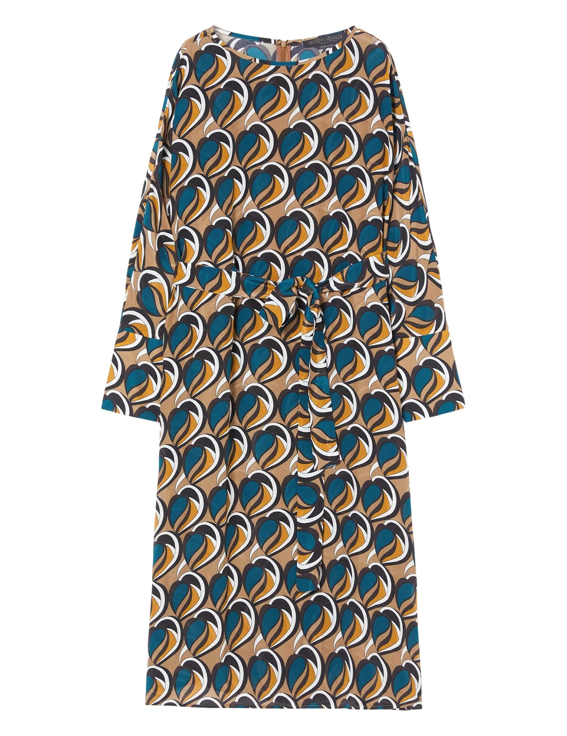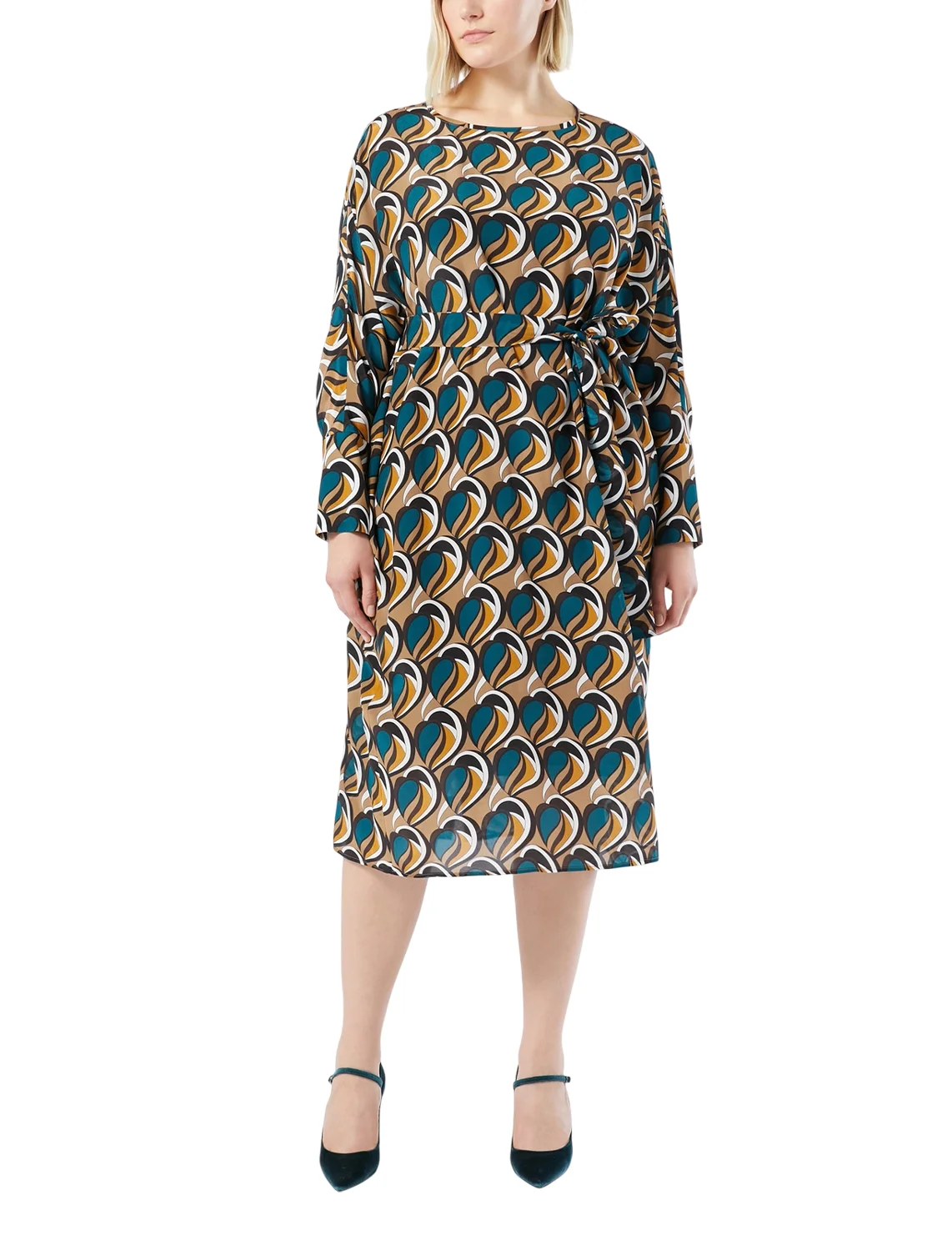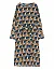 Платье изготовлено из 100% полиэстера. Модель длины миди выполнена в прямом крое. Имеет круглый вырез горловины, боковые прорезные карманы, тканевый пояс в тон, разрез сзади и длинные рукава с манжетами. Декорировано оригинальным принтом.