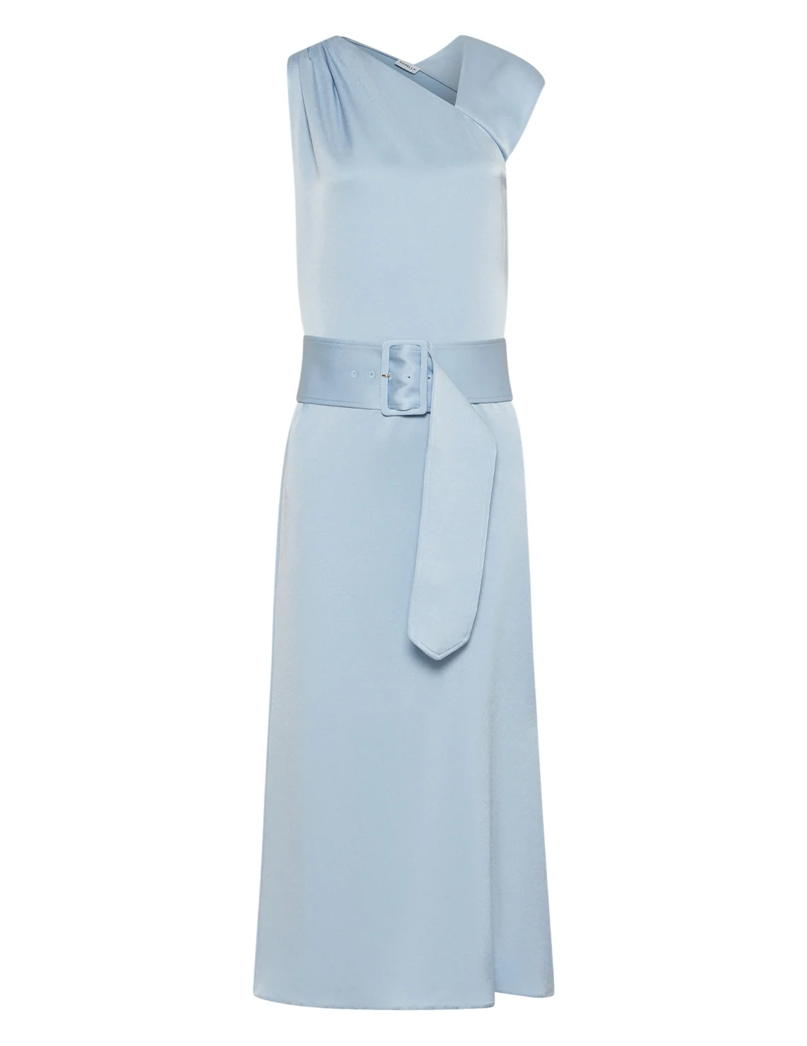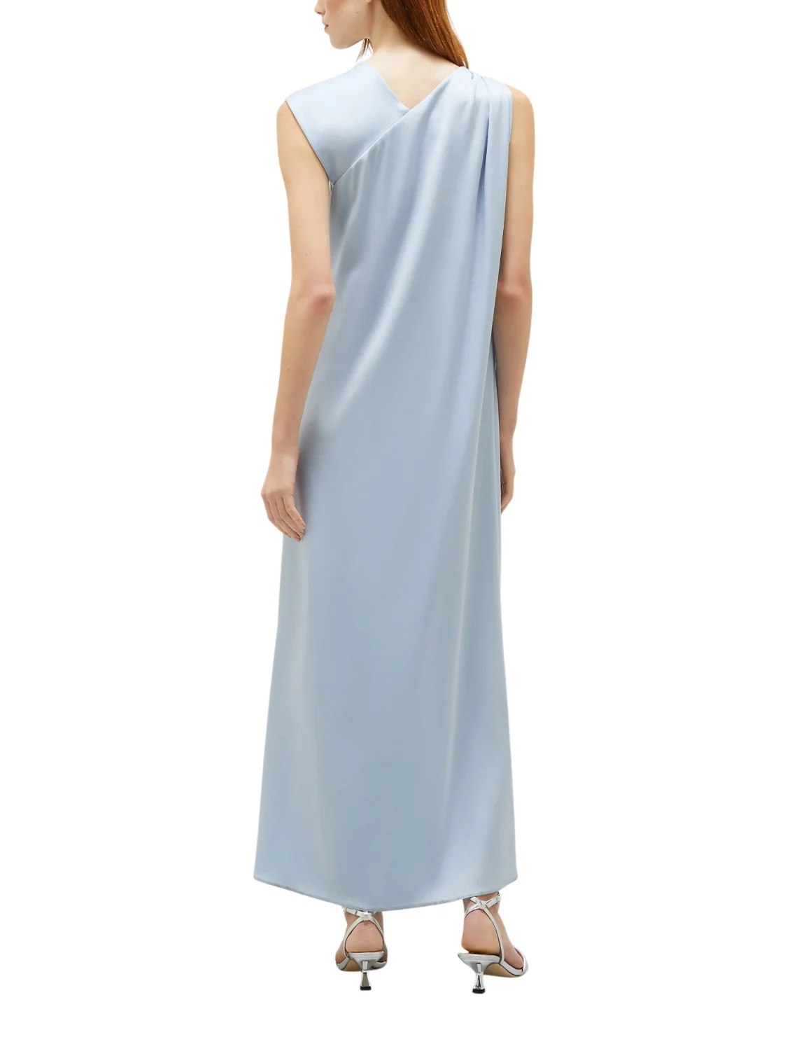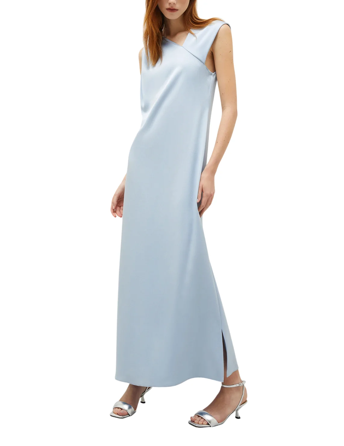 Платье изготовлено из триацетата и полиэстера. Модель длины макси выполнена в прямом крое. Имеет V-образный вырез горловины, тканевый пояс в тон и боковой разрез.
