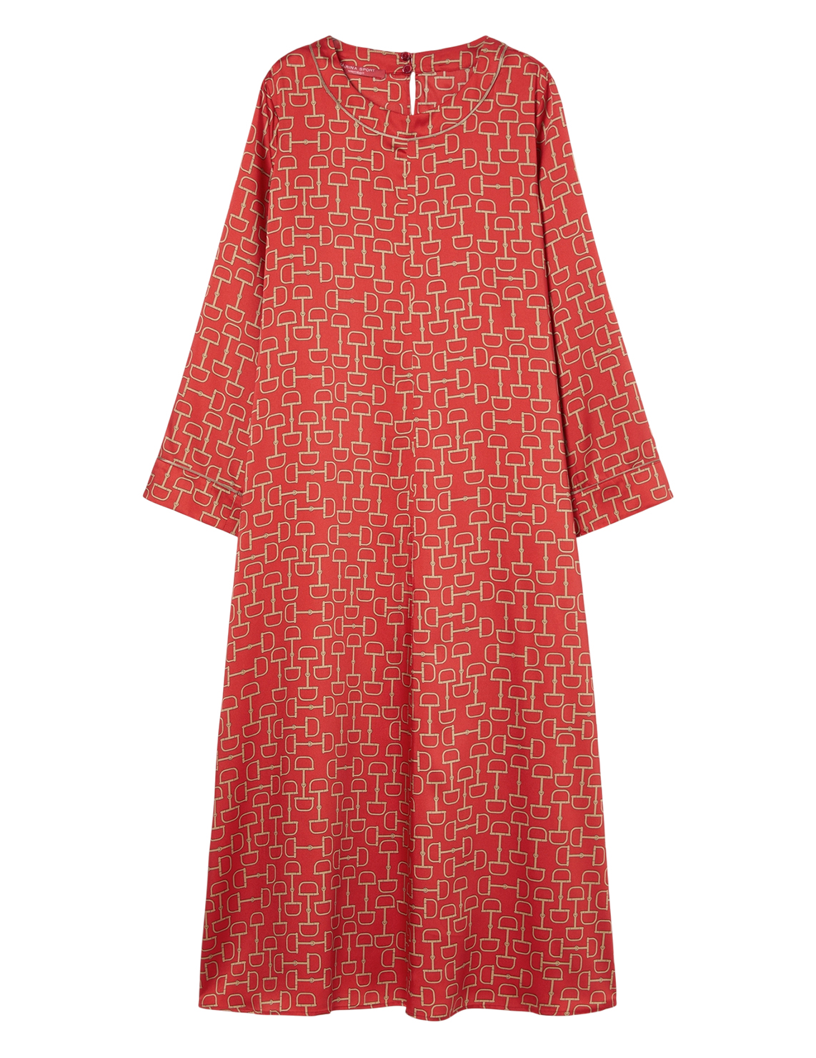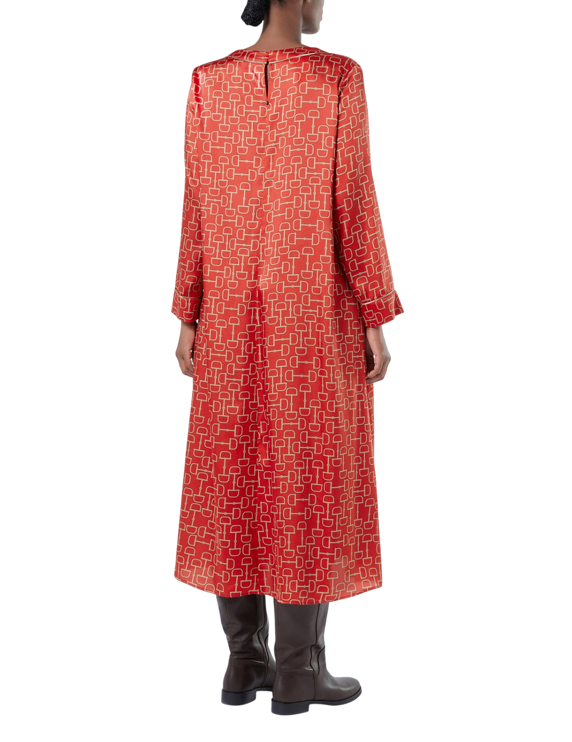 Платье изготовлено из 100% полиэстера высокого качества. Модель длины миди выполнена в расклешенном крое. Имеет круглый вырез горловины с застежкой на пуговицах сзади, прорезные карманы и длинные рукава. Декорировано оригинальным принтом.