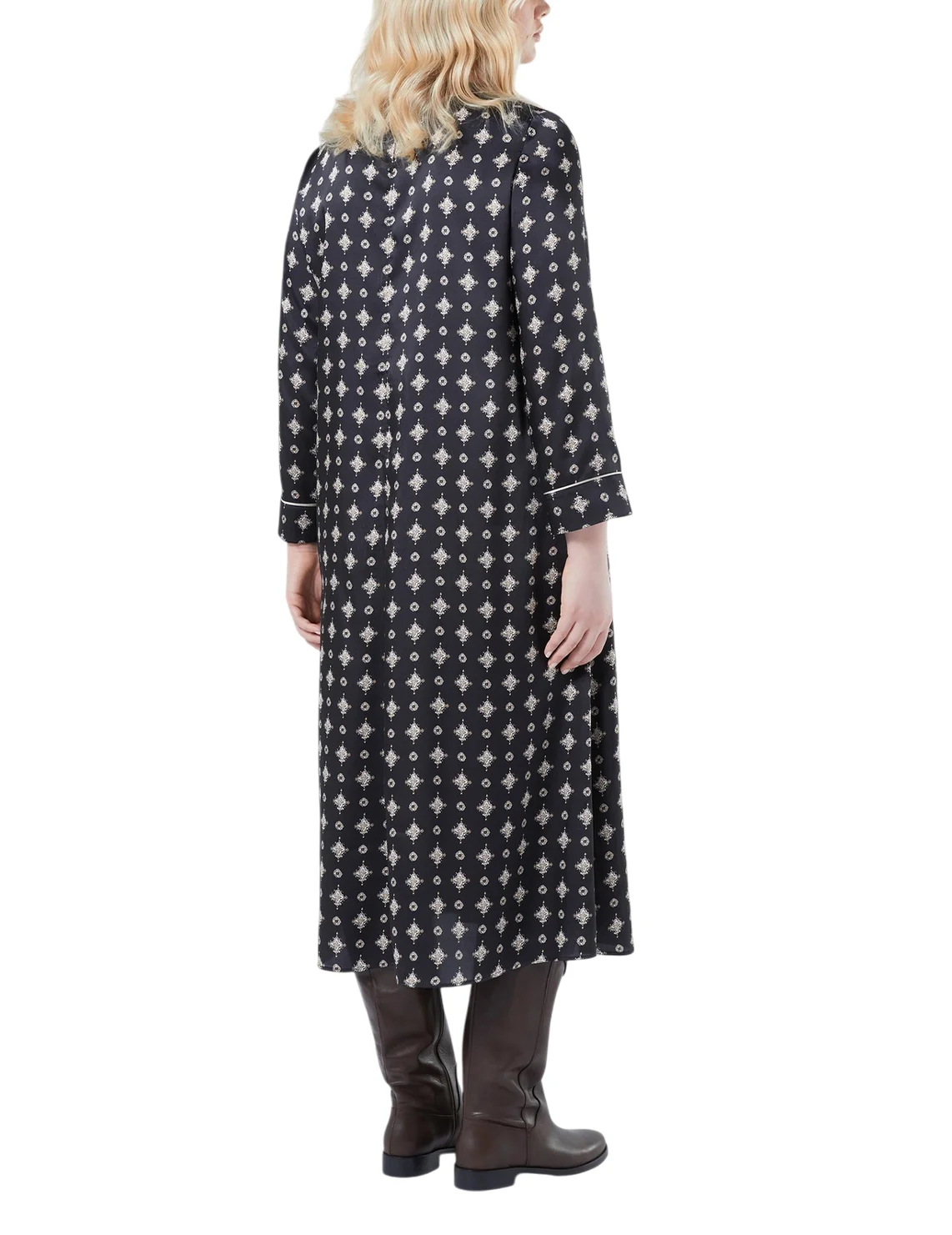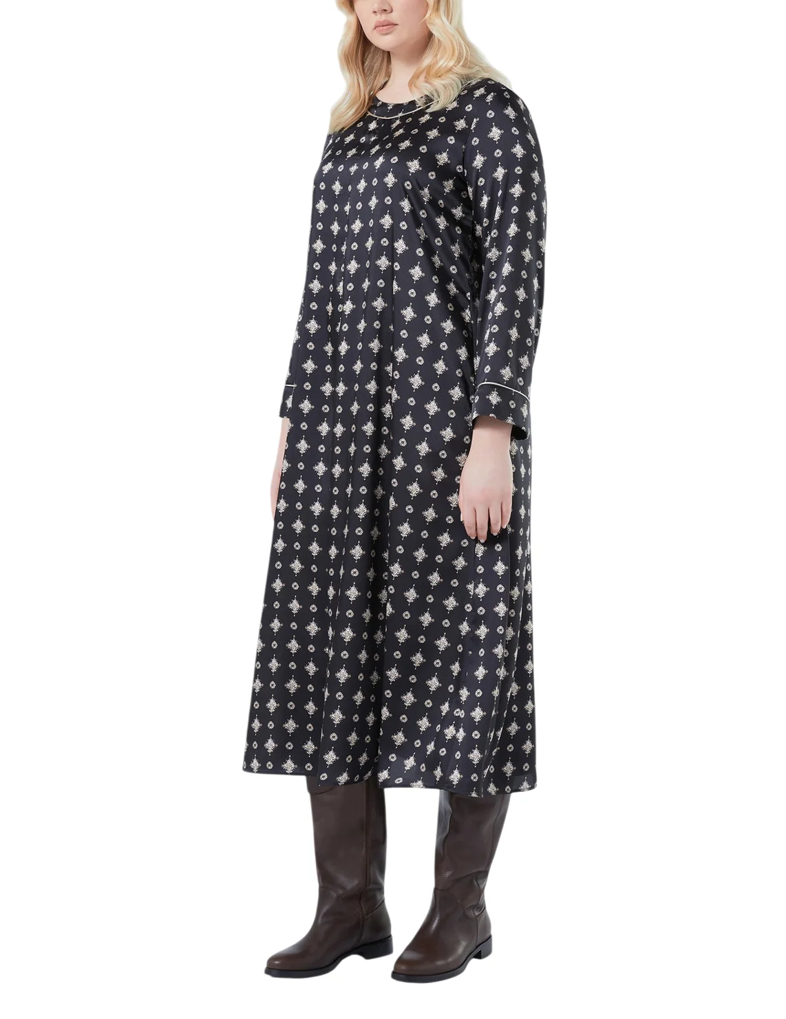 Платье изготовлено из 100% полиэстера высокого качества. Модель длины миди выполнена в расклешенном крое. Имеет круглый вырез горловины с застежкой на пуговицах сзади, прорезные карманы и длинные рукава. Декорировано оригинальным принтом.