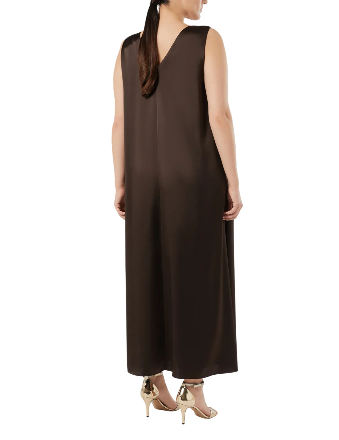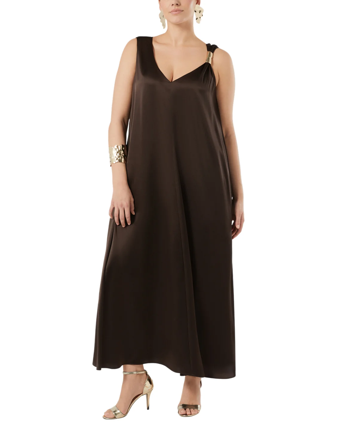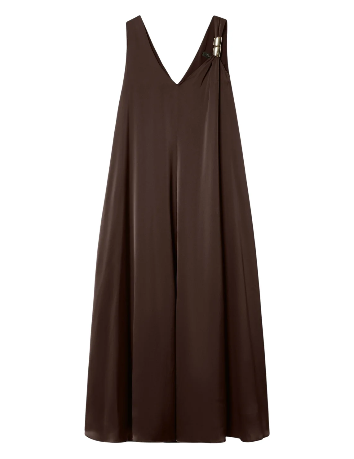Платье изготовлено из триацетата и полиэстера. Модель длины макси выполнена в расклешенном крое. Имеет V-образный вырез горловины и золотистое украшение на левой бретели.