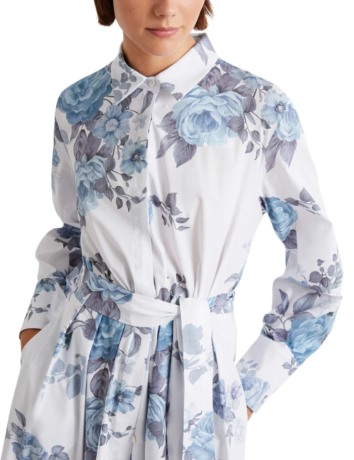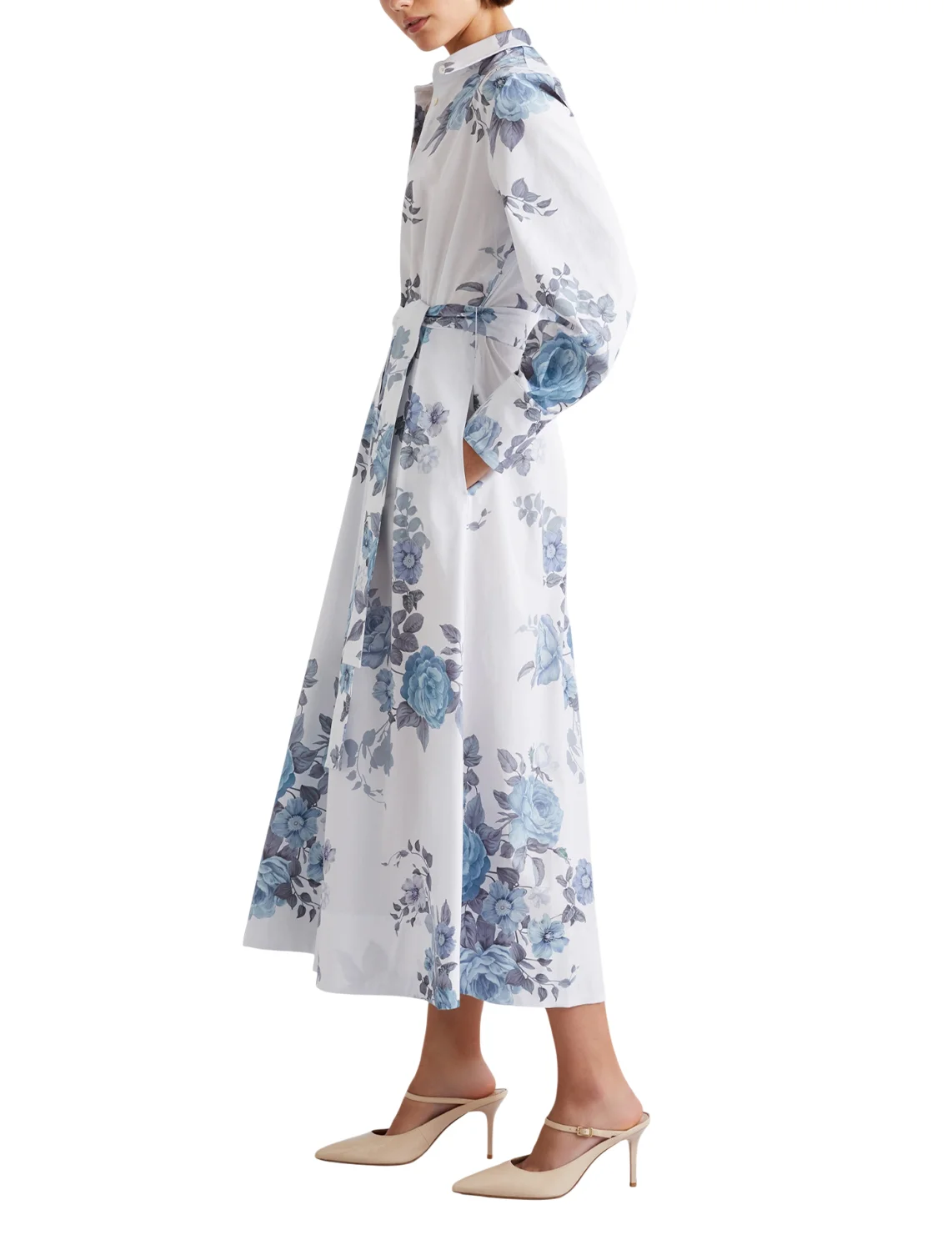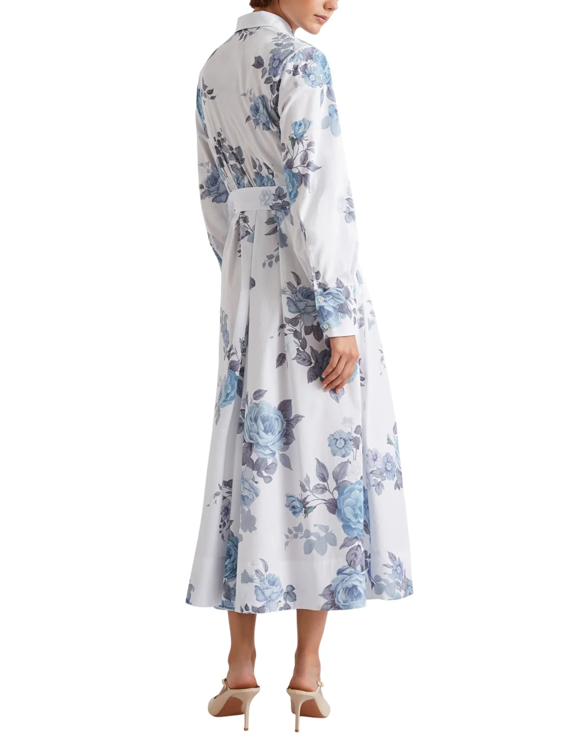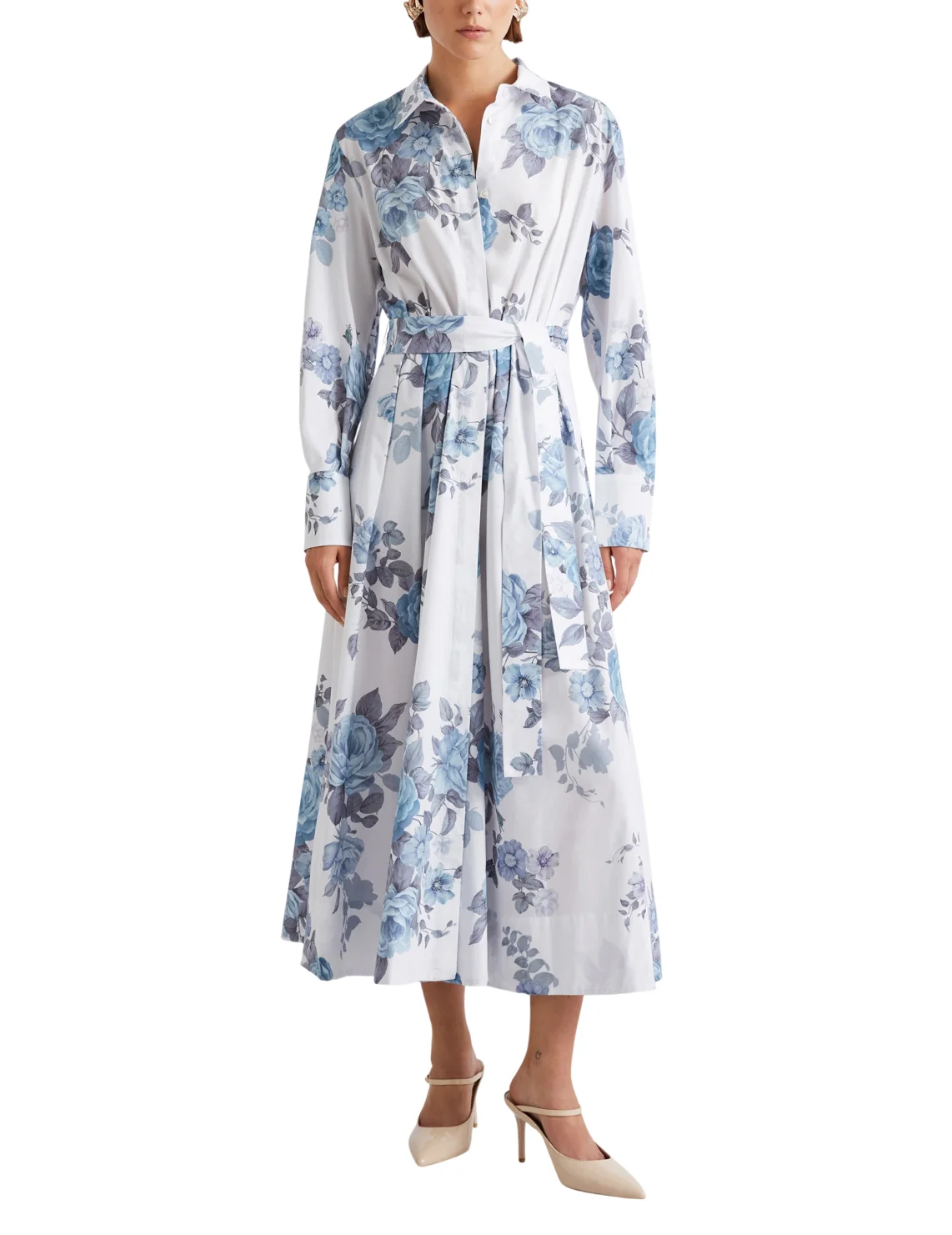 Платье изготовлено из хлопка и эластана. Модель длины миди выполнена в расклешенном крое. Имеет отложной воротник, застежку на пуговицах, пояс в тон и длинные рукава с манжетами. Декорирован цветочным принтом.