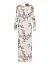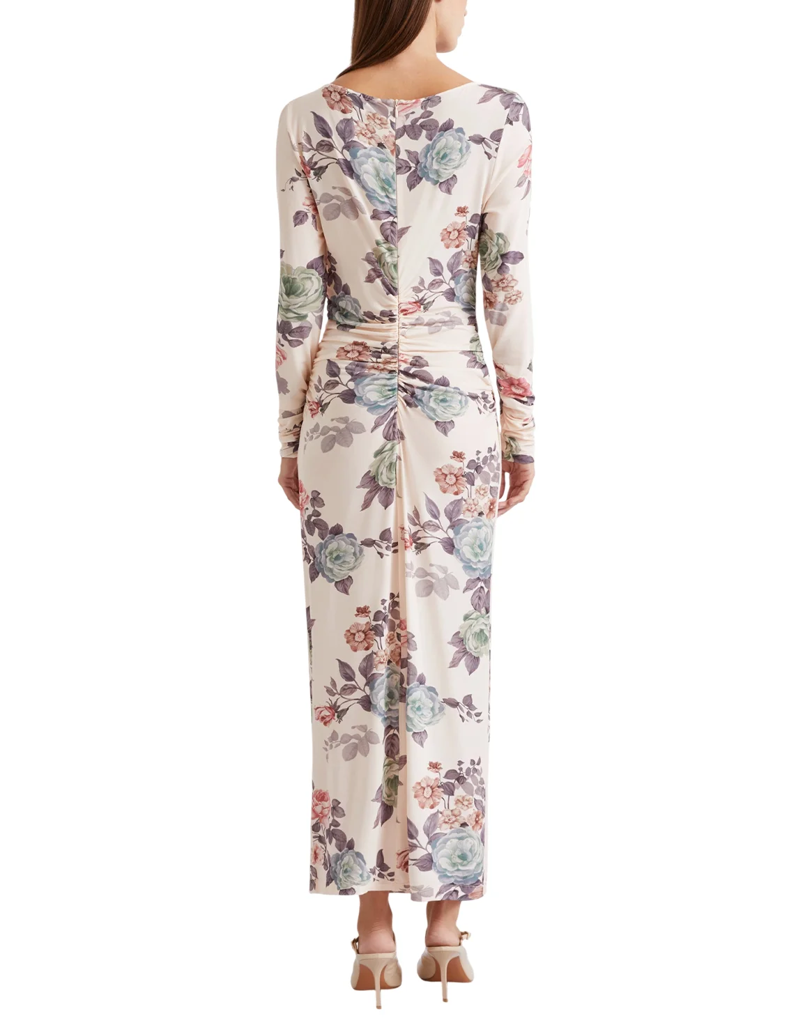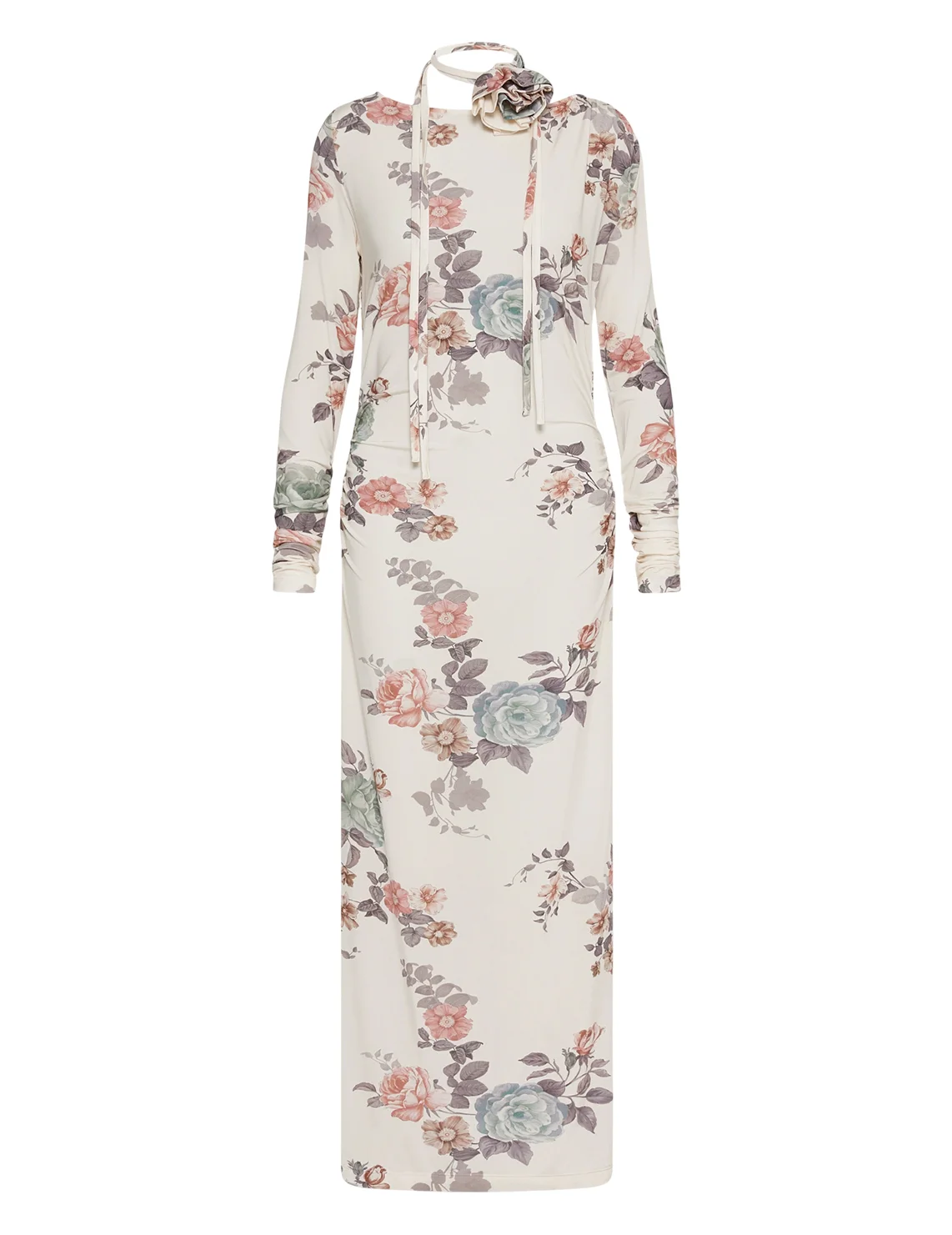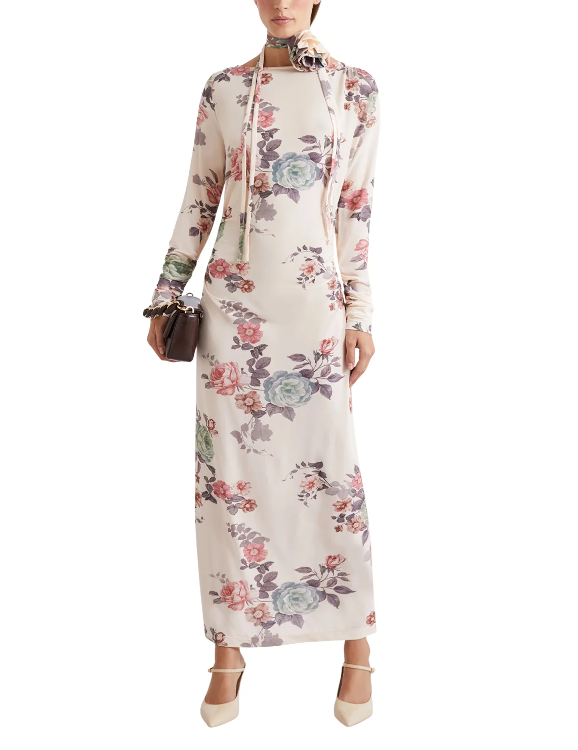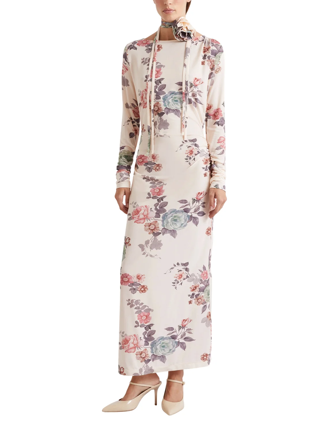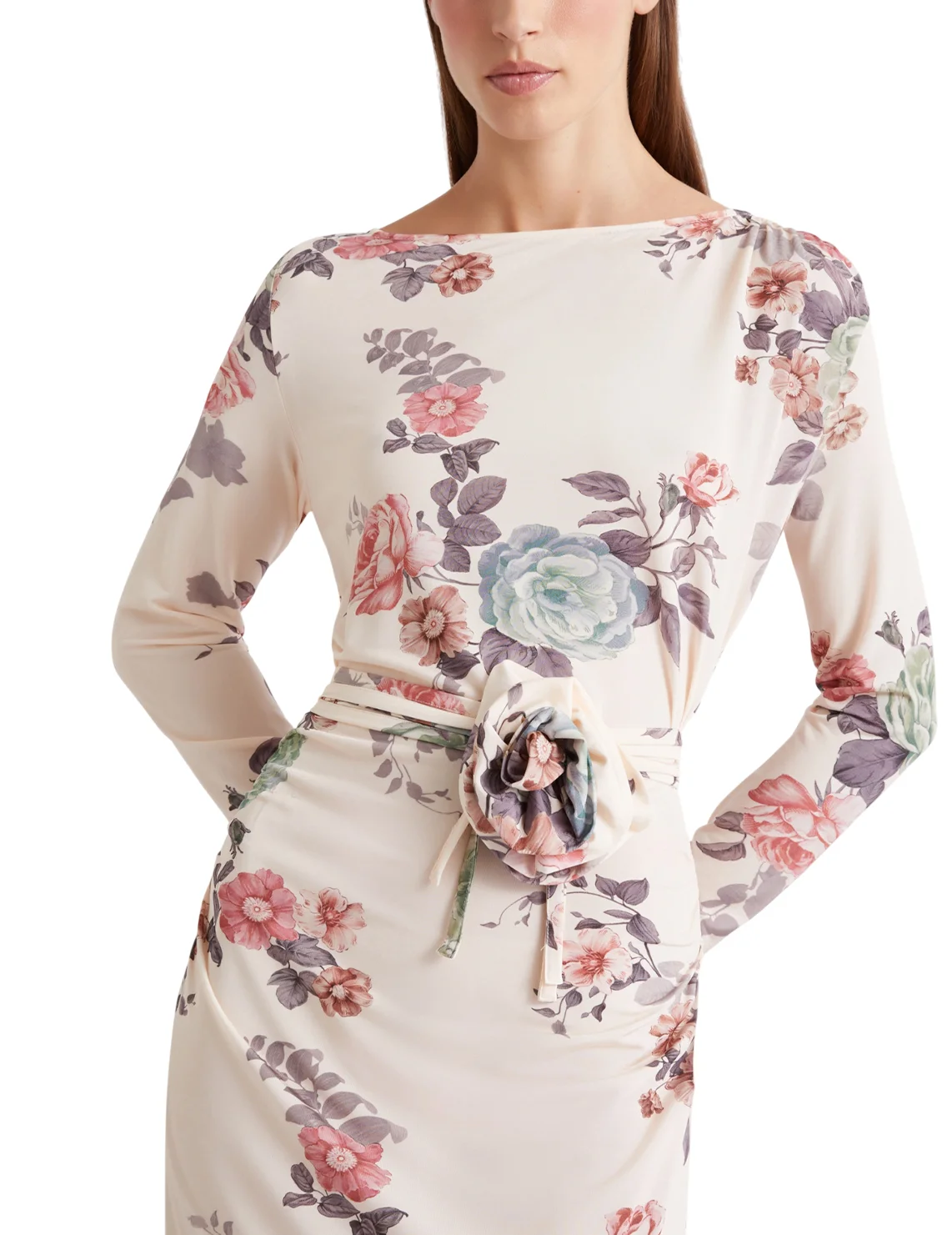 Платье изготовлено из вискозы и эластана, подкладка из полиамида. Модель длины макси выполнена в прямом крое. Имеет круглый вырез горловины, скрытую застежку на молнии сзади и длинные рукава с манжетами. Дизайн модели дополнен цветочным принтом, драпировкой и поясом с декоративным цветком.