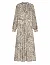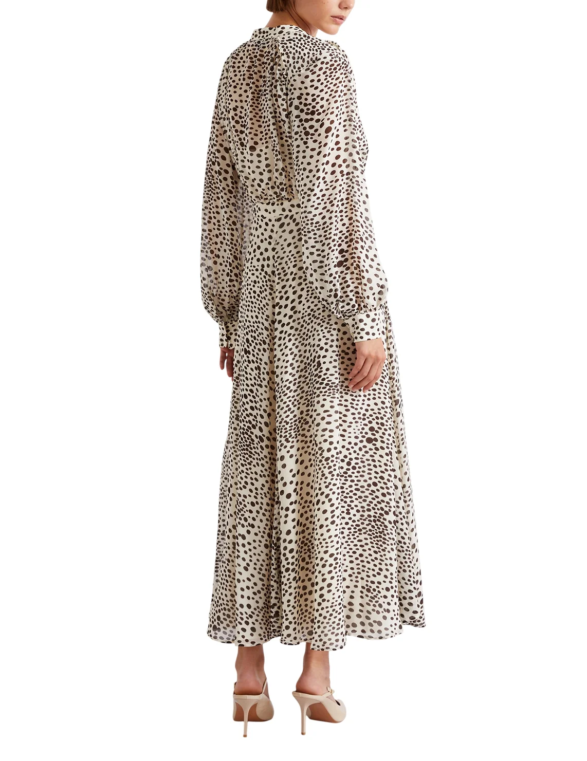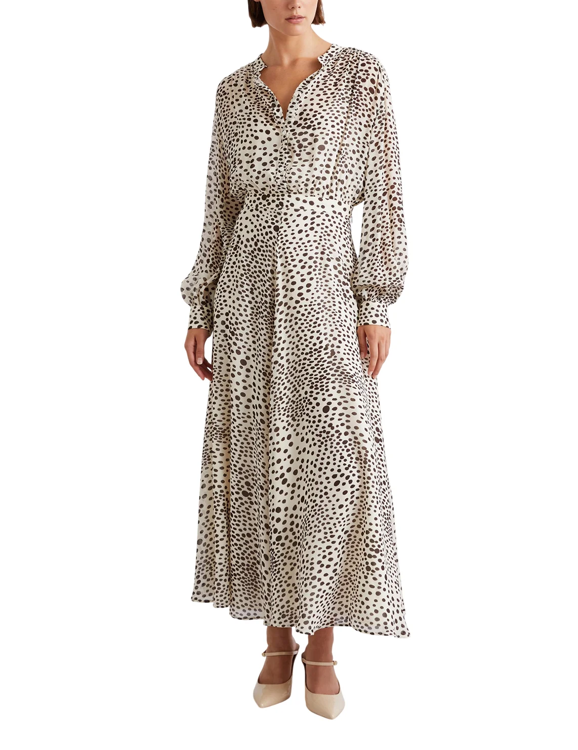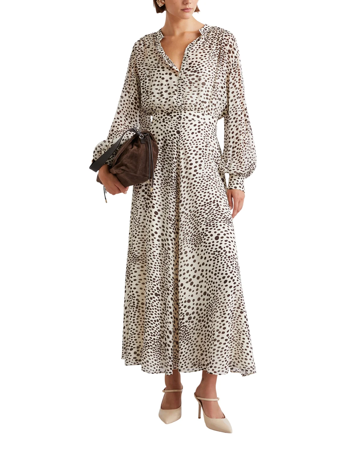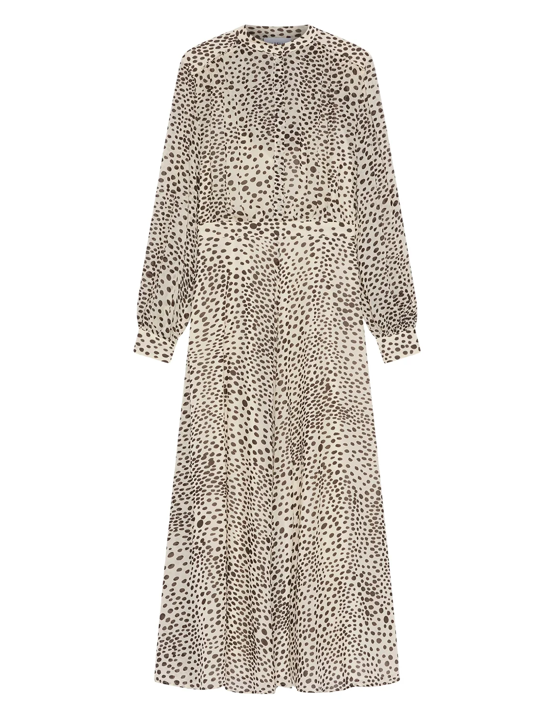 Платье изготовлено из 100% вискозы, подкладка из полиэстера. Модель длины макси выполнена в расклешенном крое. Имеет воротник-стойку, скрытую застежку на молнии сбоку, планку на пуговицах и длинные рукава с манжетами. Декорировано принтом в горошек.